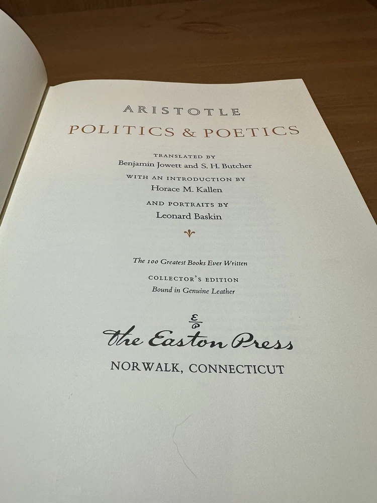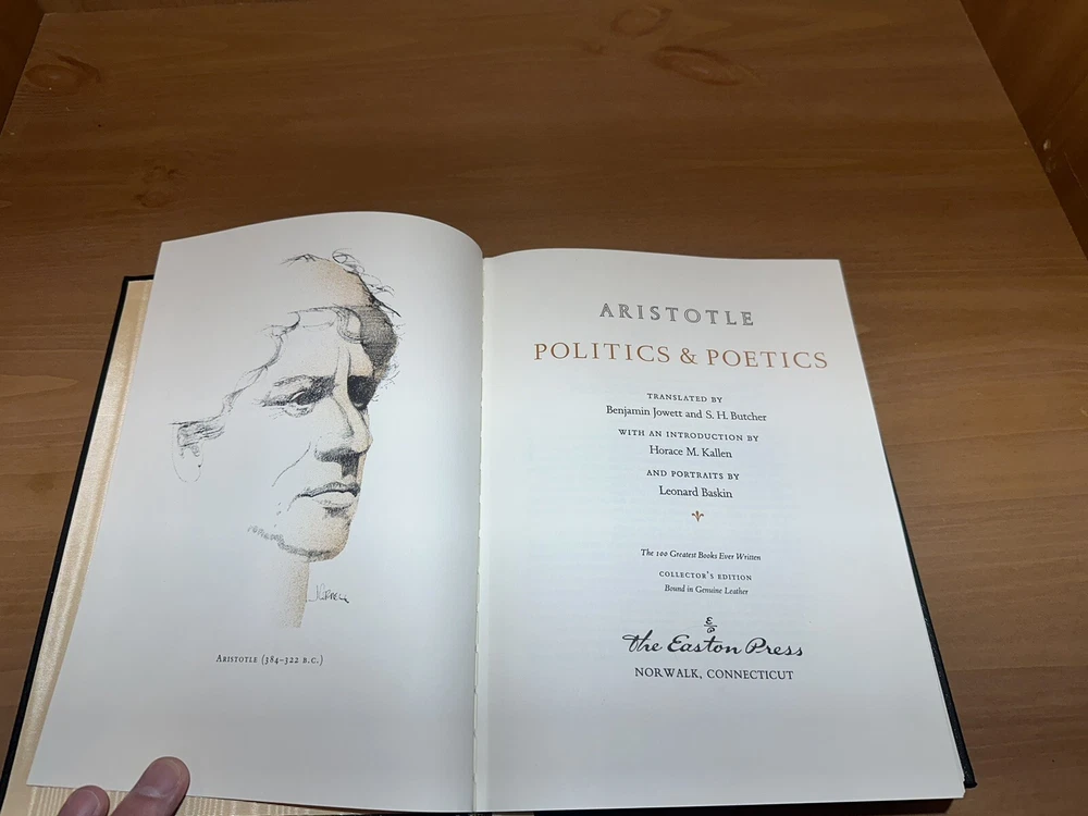 This rare and highly sought-after book is a true gem for any collector or enthusiast of classical literature. With its full leather binding and guilded acid neutral pages, this edition of "Politics and Poetics" by Aristotle is a beautiful and durable addition to any library. Published by Easton Press in 1979, this original edition is a limited collector's item that is sure to impress. Featuring illustrations and a special attributes such as being leather bound and personalized, this book is a must-have for anyone who loves political topics. The book is written in English and has been printed in Norwalk, Connecticut. Don't miss out on the opportunity to own a piece of history with this stunning edition of "Politics and Poetics" by Aristotle.