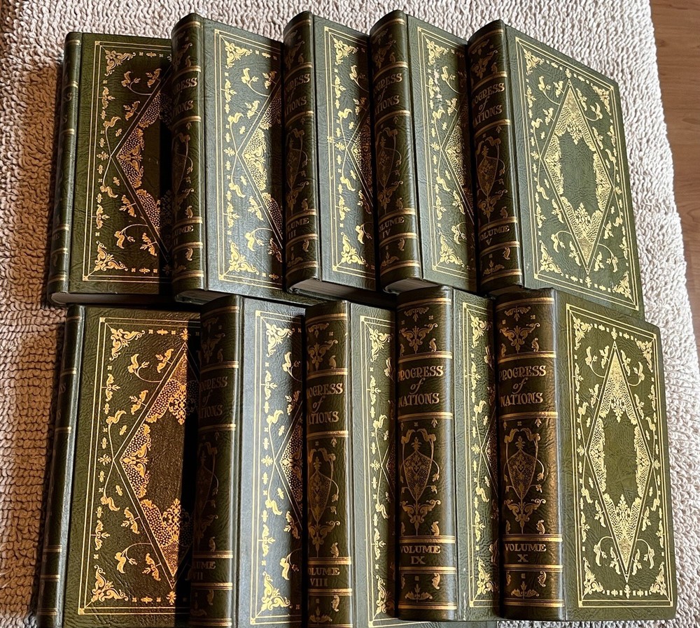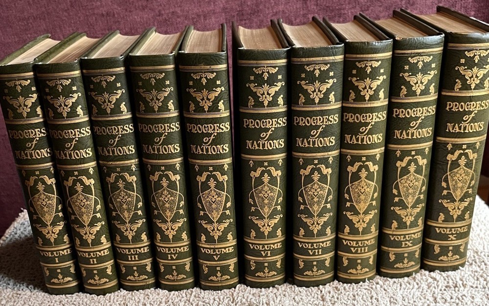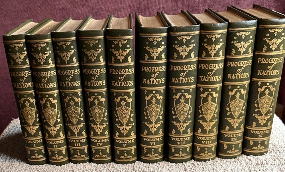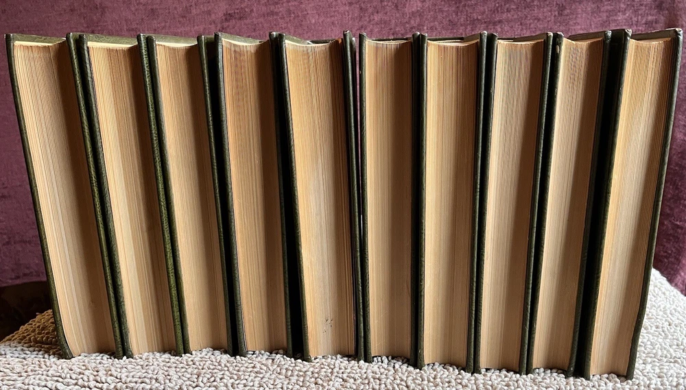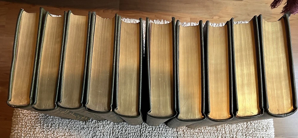 This is a complete set that will be a valuable addition to any book collection. Looks distinquished on a book shelf with the beautiful leather bindings and top edge gilt. The set is in fine condition. No marks or tears on pages, binding is very good. Couple small blemishes on outside of a couple of volumes.