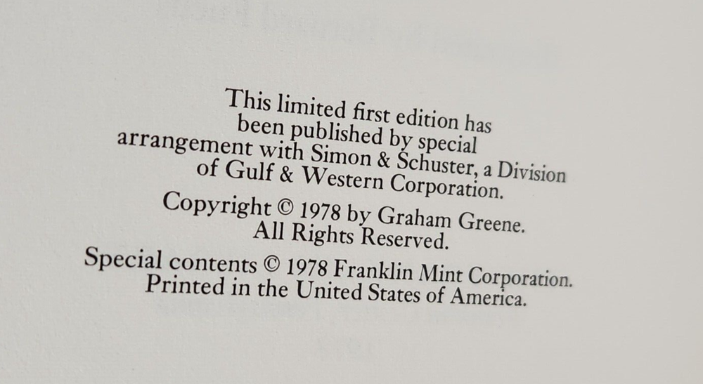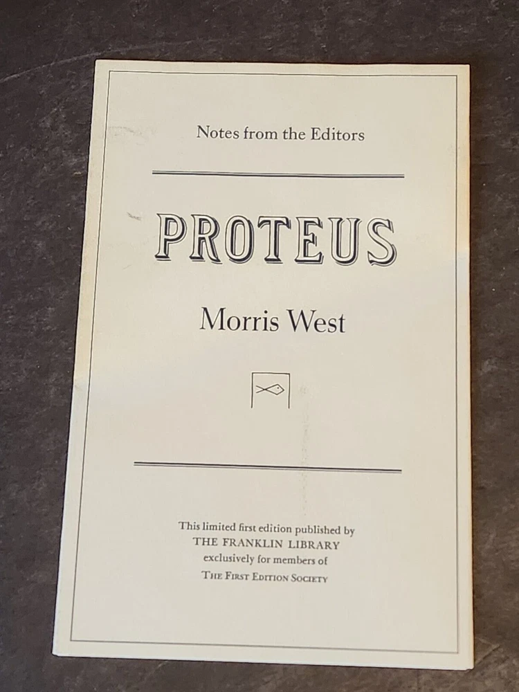 From the Franklin Library Collection. Big John Spada is a self-made millionaire. From his headquarters in New York, he directs enterprises around the world with military precision. Privately, Spada also funds Proteus, a clandestine movement that works to free political prisoners and combat tyrants wherever they may be. Then news arrives from Argentina that the Buenos Aires secret police have arrested Spada's daughter Teresa, a doctor, after she performed emergency surgery on a man with gunshot wounds. They then take her husband Rodolfo whose outspoken editorials have angered the country's fascist government. A scheme is hatched by Proteus to rescue them, but soon the enemies of Proteus begin to target Spada himself. Proteus: by, Morris West. Franklin Library Limited. First Edition. Leather. 1979 Leather Bound Gilt page edges Silk Endpapers Raised Bands Satin Bookmark Ribbon Accented in 22kt gold The First Edition Society Comes with “Notes from The Editors” Booklet. We combine shipping on multiple book orders automatically unless instructed otherwise. If you are unable to "Request Invoice" , simply buy all books outright and we will refund shipping overage via Paypal once postage has been printed. We combine shipping via USPS Media Mail . Postage price is calculated by weight . Terminology that may be used in this description: Bookplate: Highly sought after by some collectors, a book plate is an inscribed or decorative device that identifies the owner, or former owner, of a book. Most often bookplates are affixed to the endpaper of a book. Bump: Indicates that the affected part of the book has been impacted in such a way so as to cause a flattening, indention, or light bending. Deckle Edge: Deckle edge is the feathered edge of a page. Traditionally and historically, this was a side effect of the process of making paper. Dust Jacket: Sometimes used as another term for dust jacket, a protective and often decorative wrapper, usually made of paper which wraps around the binding of a book Ex-library: A former library book, generally containing library acquisition and ownership stamped Markings, and other typical indications of the library's use. Foxing: Or, Foxed is the age related browning, or brown-yellowish spots, that can occur to book paper over time. When this aging process happens to the paper in a book it is referred to as "foxed". Remainder Mark: A remainder marked book is just that - a mark to the page edges of a book. This mark is placed on the page edges by a publisher as books are returned from bookstores or sold to discounters. Rubbing: Abrasion or wear to the surface. Usually used in reference to a book's boards or dust-jacket. Shelf Wear: (shelving wear) describes damage caused over time to a book by placing and removing a book from a shelf. Soiled: Generally, refers to minor discoloration or staining.