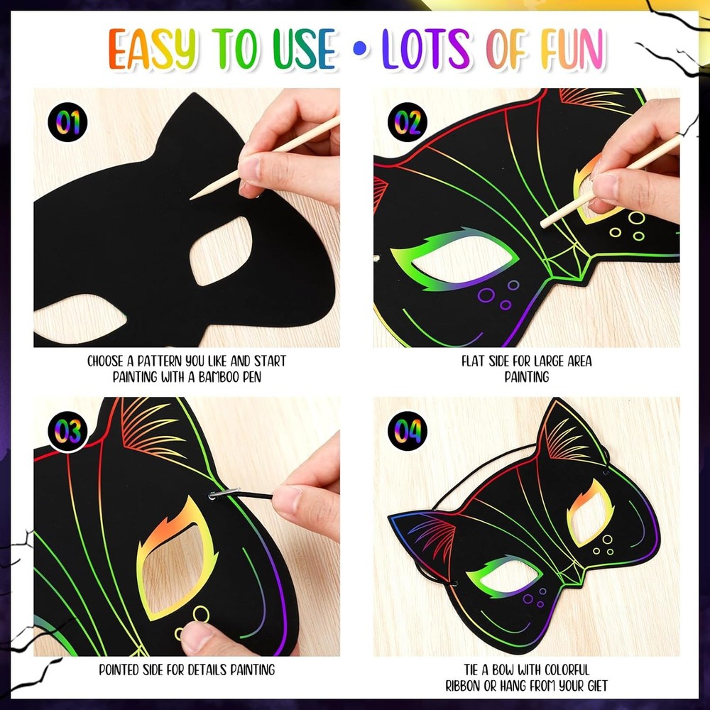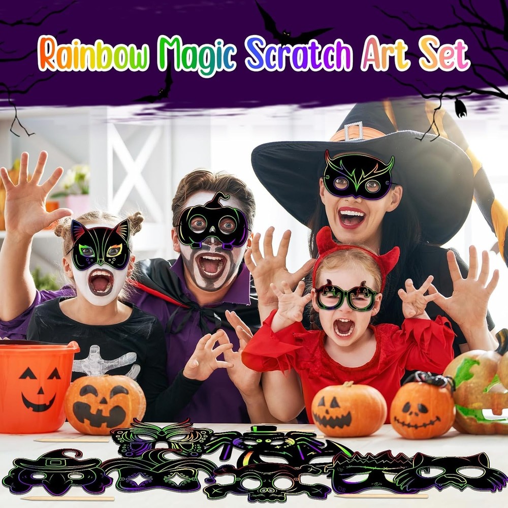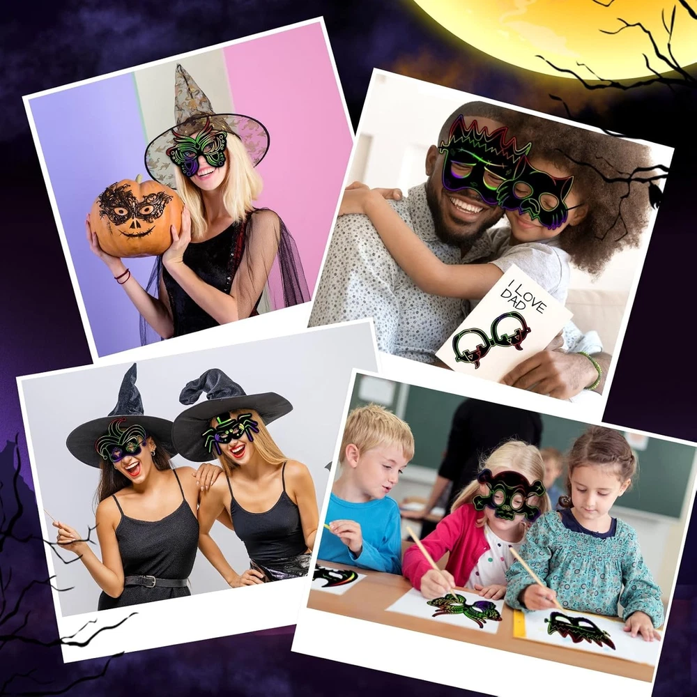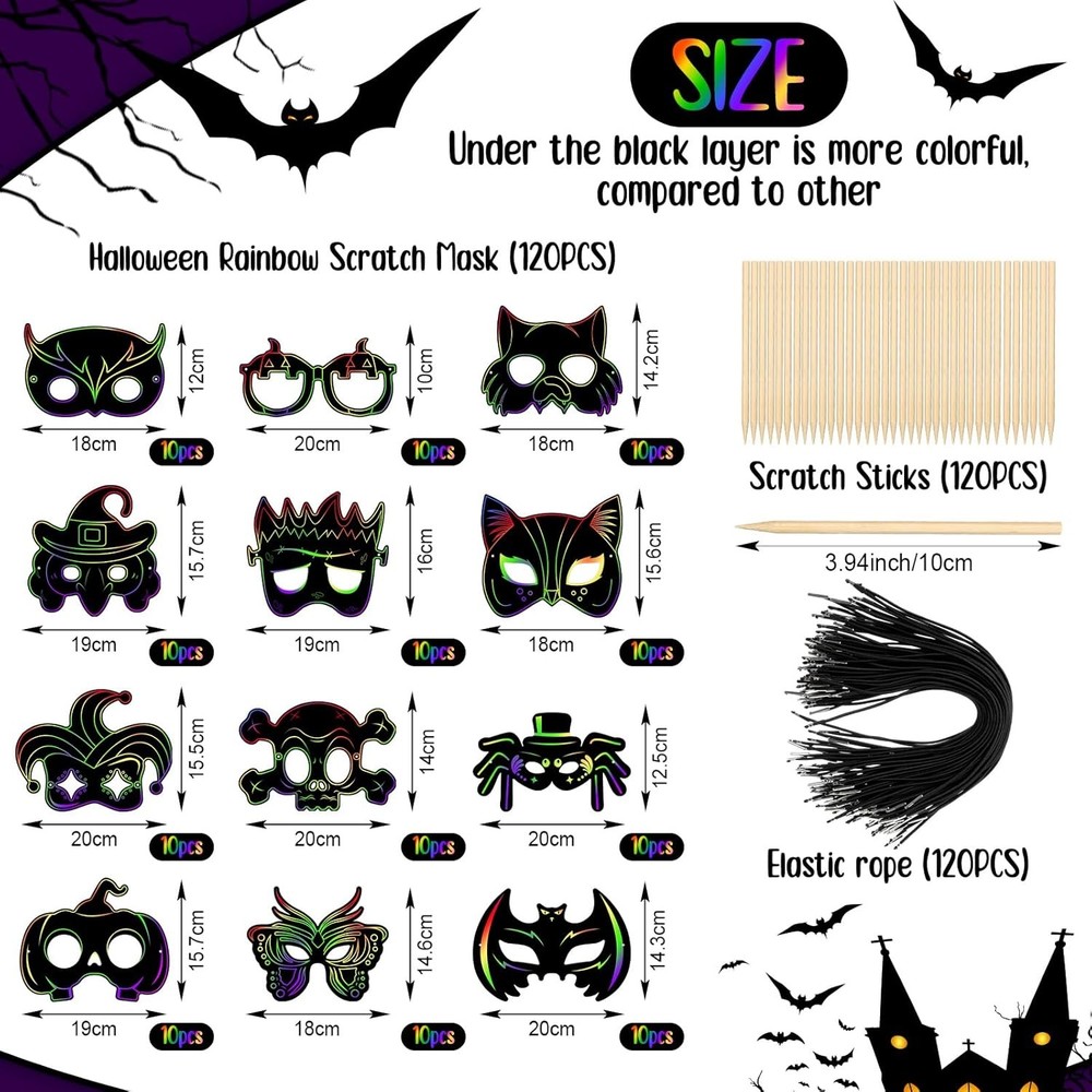 Qilery 120 Pcs Scratch Mask Rainbow Animal Mask Scratch off Art Craft Kit for Kids, Paper Cat Witch Pumpkin Bat Animal Mask in Bulk for Halloween Mardi Gras Birthday Party Favors Games Classroom Product Details Product Dimensions: 12.6 x 9.84 x 0.98 inches Item Weight: 1.59 pounds Country of Origin: China Item model number: Qilery- Paper Craft-1034 Manufacturer recommended age: 6 years and up Department: unisex-child Manufacturer: Qilery Package Content: the package includes 120 pieces of scratch off Halloween paper masks with elastic ropes, coming with 120 pieces of 0.16 x 3.94 inches/ 0.4 x 10 cm sticks to scratch, available in ample quantity and rich styles to meet your demands for sharing, DIY, scratching and gift giving; Ideal for your birthday party supplies and Halloween party decorations Reliable Material: the scratch off Halloween masks are made of cardboard material, safe and durable, not easy to break or fade; The magical rainbow colors and patterns are hidden under the matte coating; The quality bamboo stylus can scratch off the black coating to make the Halloween mask colorful; The rope is elastic, convenient and easy to put the mask on the heads of children and adults Distinctive Patterns: featuring a variety of unique designs, our Halloween scratch masks will elevate Halloween excitement for your kids; The range of patterns includes witches, skeletons, bats, cats, spiders, pumpkins, and more; Choose from these patterns to perfectly match your Halloween outfit or express your festive mood Great DIY Supplies: the Halloween mask crafts for kids will a very suitable activity for children to develop their imagination; Use their imagination to scratch their own masks, adding a lot of fun; The DIY element encourages children to explore their artistic abilities, making each mask a unique creation Ideal for Halloween Playing: besides being a great decoration accessory for Halloween, these Halloween DIY crafts for kids are also suitable for a range of Halloween activities; They're great for playing dress up, participating in a play, or even for trick or treating; Kids will love expressing their creativity while getting into the Halloween spirit; Also suitable for birthday parties, carnivals, fancy dress parties, craft projects, family fun days and more