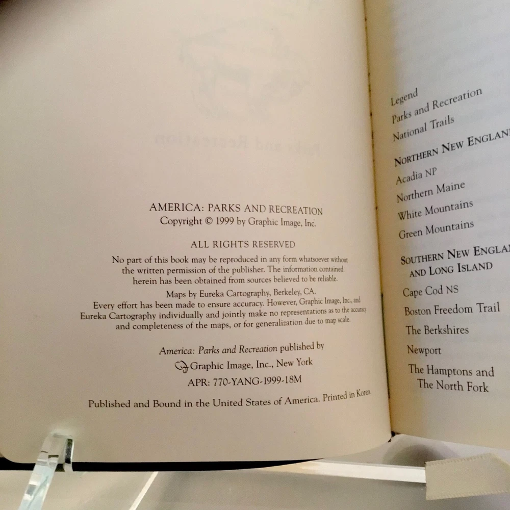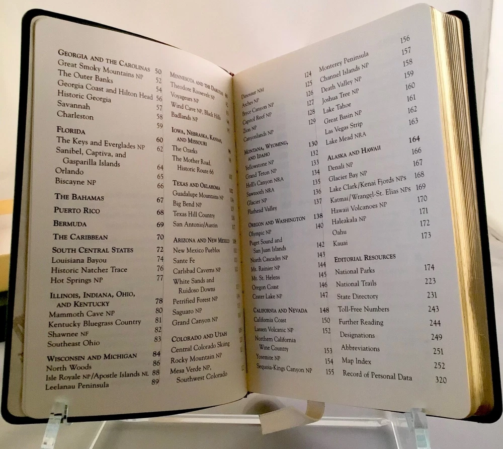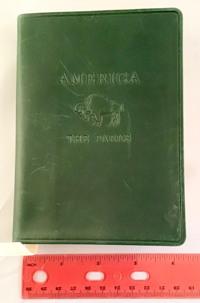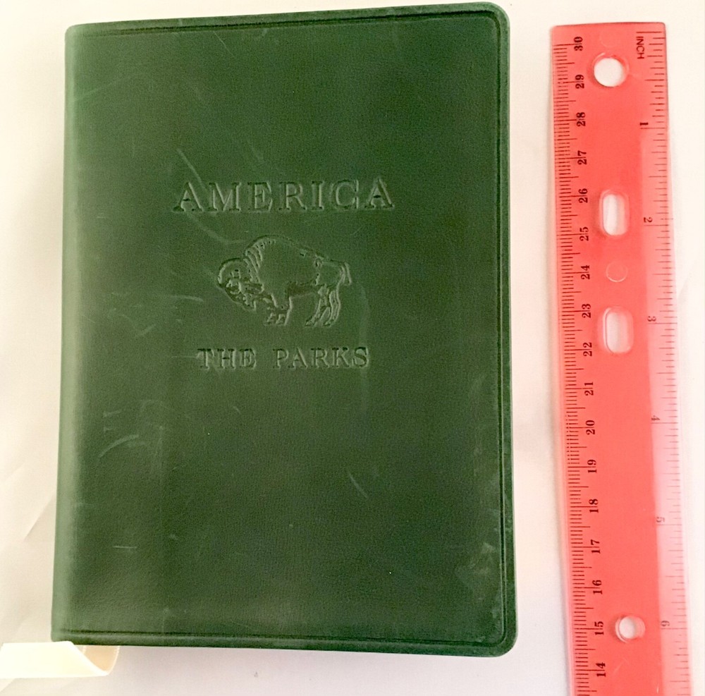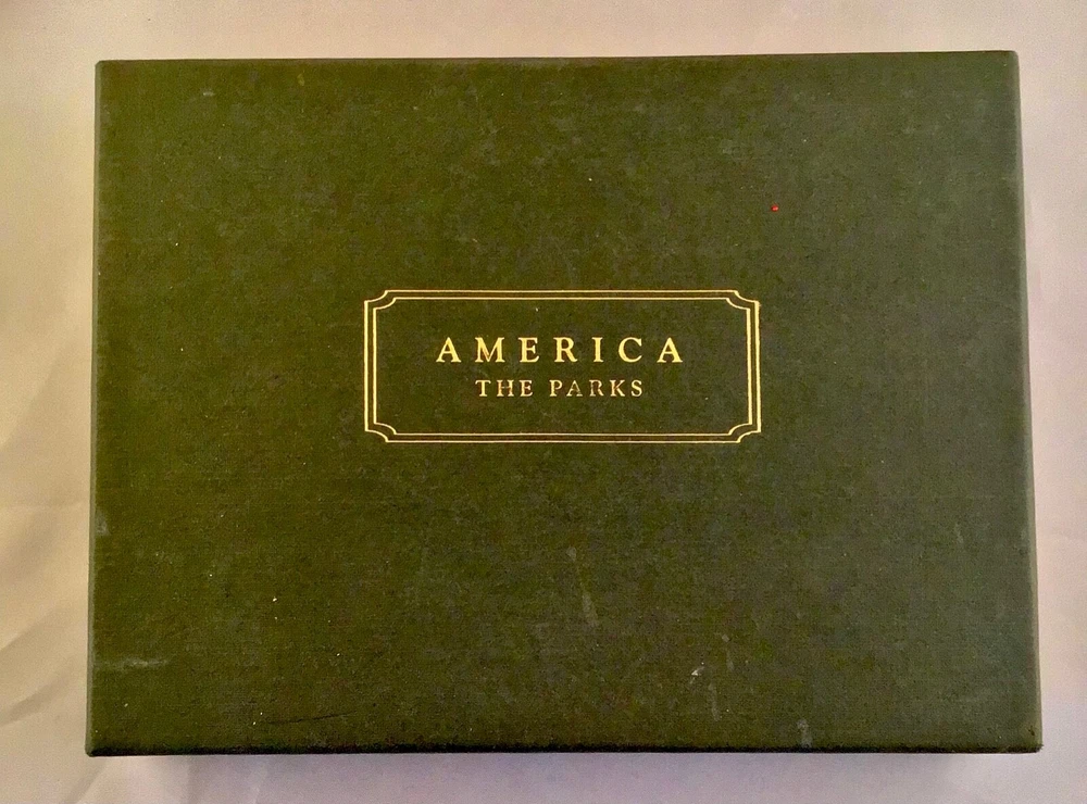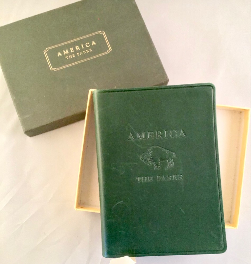 RARE BOXED BOOK UNUSED, AMERICA THE PARKS….LEATHER BOUND IN GREEN WITH GOLD PAPER EDGING AND RIBBON BOOK MARKER. IT IS IN V.G. CONDITION THOUGH THERE ARE SOME SCUFF MARKS TO LEATHER AND NUMBERS WRITTEN IN INK ON BACK OF BOX. WONDERFUL BOOK FEATURING ALL THE PARKS IN THE U.S. WITH MAPS AND FEATURES….PUBLISHED IN 1999, LIMITED EDITION.