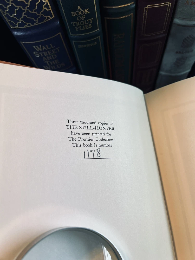 "The Premier Collection" is a distinguished series of leather-bound sporting books published in 50 volumes by John Culler & Sons from 1983 to 1997. This collection, celebrated for its exquisite craftsmanship and limited edition prints, spans 15 years and includes numerous volumes dedicated to the art and history of hunting and fishing. Key Points: Publication Period : 1983-1997. Publisher : John Culler & Sons. Editions : Each book in the series is a limited edition, with each copy individually numbered. Binding : The books are finely bound in leather, featuring elaborate gold tooling, marbled endpapers, gilt edges, high-quality paper, and sewn in ribbon reflecting the publisher's dedication to craftsmanship. Content : The collection covers a wide range of topics related to hunting and fishing, including historical accounts, personal narratives, and instructional guides. Collectibility : Due to their limited print runs and high-quality production, these books are highly sought after by collectors of sporting literature. This collection represents a significant contribution to the literary world of sporting enthusiasts, offering both aesthetic appeal and valuable content for readers and collectors alike. Titles offered in this collection for sale are listed below as are any cosmetic flaws noted: 1. ATLANTIC SALMON FISHING by Charles Phair #1178/3000 copies includes a fold out map 2. AMERICAN BIG GAME FISHING by Mrs Oliver C. Grinnell, Francis H. Low, Herman P. Gray, Charles L. Lehmann, Van Campen Heilner, Ernest Hemingway, Lynn Bogue Hunt, Otto J. Scheer, David M. Newell, Francis H. Geer, George C. Thomas III, S. Kip Farrington Jr, Thomas G.F. Aitken #1178/3000 3. UPLAND GAME BIRD SHOOTING IN AMERICA by Col. H.P. Sheldon, Lawrence B. Smith, W. Averfi L. Harriman, William E. Baker, Jr, Erastus T. Tefft, Horace Lytle, David Wagstaff, Henry L. Ferguson, Arthur B. Lapsley, P.N.B. Galwey-Foley, Capt. Paul A. Curtis, Clarence H. Mackay, Eugene V. Connett #1178/3000 ***soil to leather binding which can be viewed oh photographs*** 4. AMERICAN GAME-BIRD SHOOTING by George Bird Grinnell #1178/3000 5. GUNNER'S DAWN by Roland Clark #1178/3000 6. WILDFOWLING IN THE MISSISSIPPI FLYWAY by Horace Thompson, Keith Davis, S.A. Drennen, Wallace H. Claypool, George D. Robey, Jimmy Robinson, Frederick C. Lincoln, Jack W. Musgrove, Kenneth H. Smith, Bertram W. Cartwright, Arthur Van Pelt, William B. Barnes, Frederick C. Dunk, W. Austin Peters, Hendrix Dawson, Leonard Hall, Walter L. Bush, Bert Popowski, Bert Claflin #1178/3000 7. GUNNERMAN'S GOLD by Horatio Bigelow #1178/3000 8. ON THE HEADWATERS OF PEACE RIVER by Paul Leland Haworth #1178/3000 9. BASS BUG FISHING AND BERMUDA FISHING by Joe Brooks #1178/3000 10. TROPHIES WON AND LOST ALASKAN YUKON by G.O. Young #1178/3000 11. BLOOD LINES by Nash Buckingham #1178/3000 12. TALES OF A BIG GAME GUIDE by Russell Annabel #1178/3000 13. DE SHOOTINEST GENTLEMAN by Nash Buckingham #1178/3000 14. FIRELIGHT by Burton L. Spiller #1178/3000 15. ON SNOW SHOES TO THE BARREN GROUNDS by Caspar Whitney #1178/3000 16. TO FAR WESTERN ALASKA FOR BIG GAME by T.R. Hubback #1178/3000 **noted water stain to the top left corner of text block, text is not affected. Leather binding has soiling on spine, left edge of front board and left edge of rear board**** 17. CANADIAN NIGHTS by The Earl of Dunraven #1178/3000 18. AN AMERICAN HUNTER by Archibald Rutledge #1178/3000 19. AFTER BIG GAME IN THE UPPER YUKON by Nevill A.D. Armstrong #1178/3000 20. FISHING A TROUT STREAM by Eugene V. Connett, 3rd #1178/3000 21. RECENT HUNTING TRIPS IN BRITISH NORTH AMERICA by F.C. Selous #1178/3000 ***of note is soil to leather on spine and front board*** 22. CAMP-FIRE REMINISCENCES by David Moore Lindsay, F.R.G.S. #1178/3000 23. RANDOM CASTS by Eugene V. Connett, 3rd #1178/3000 ***of note is soil to front board*** 24. A BOOK OF TROUT FLIES by Preston J. Jennings #1178/3000 25. WALL STREET AND THE WILDS by A.W. Dimock #1178/3000 26. THE STILL HUNTER by Theodore S. Van Dyke 27. THE WILD TURKEY AND ITS HUNTING by Edward A. McIlhenny #1178/3000 28. THE WILDERNESS HUNTER by Theodore Roosevelt #1062/3000 *** of note is soil to back board** Overall the collection is in very fine condition. Questions are welcome. Thank you for taking a look