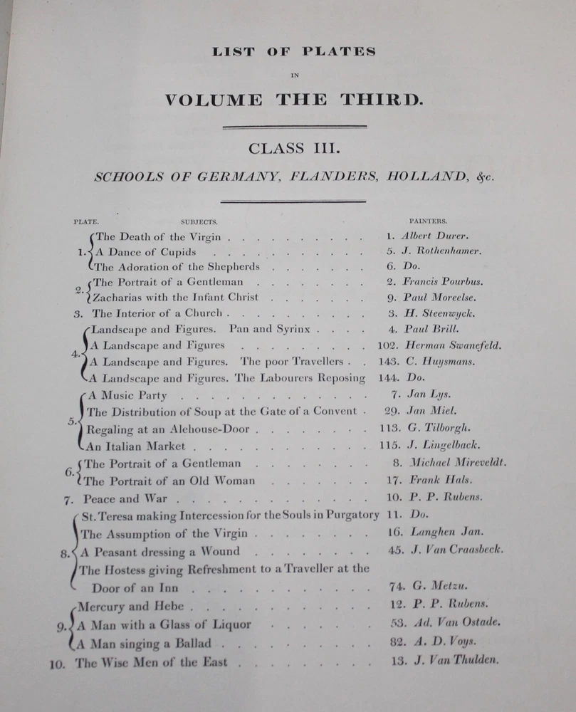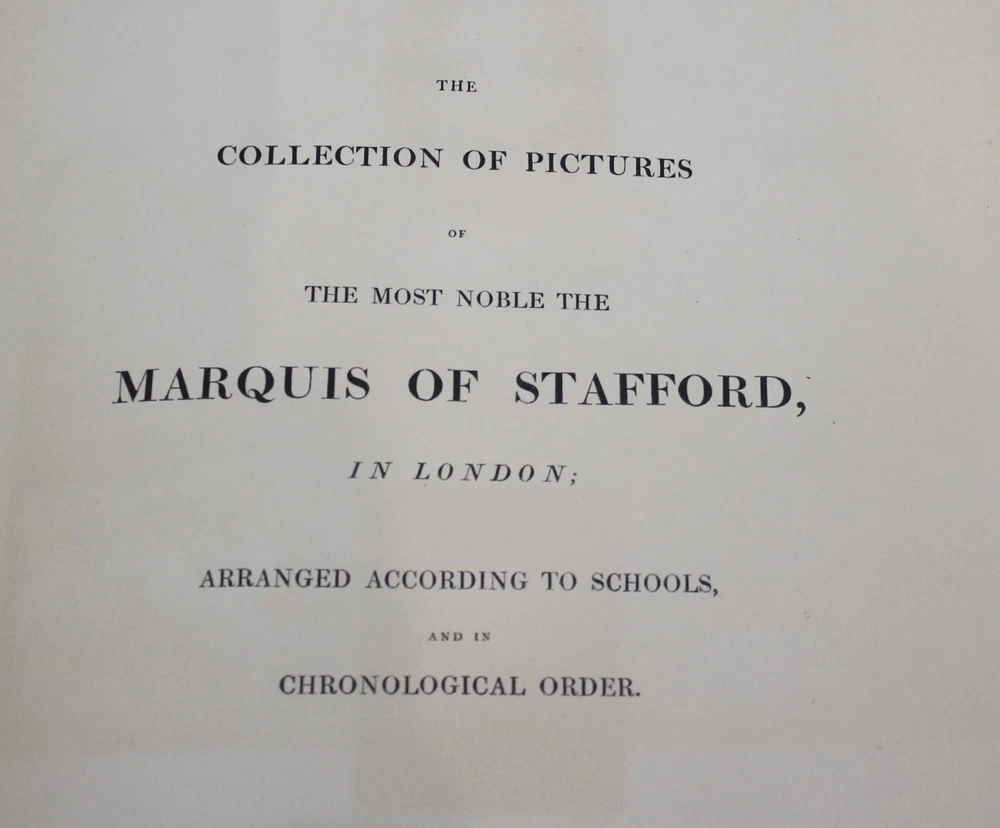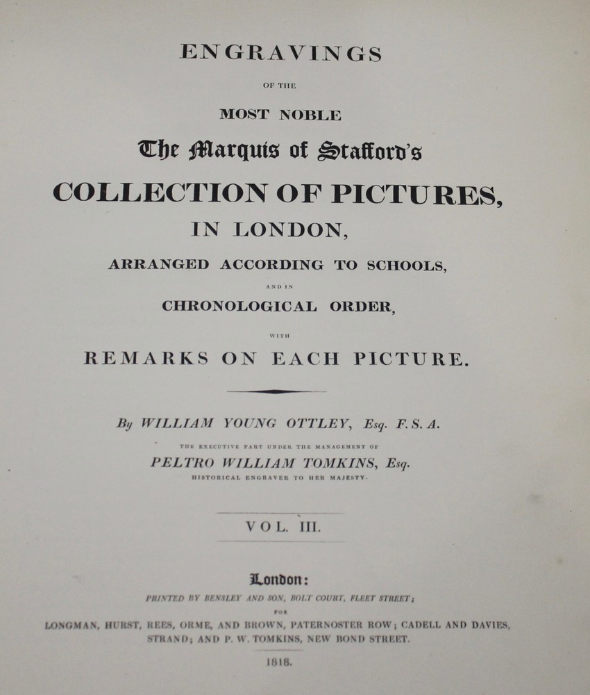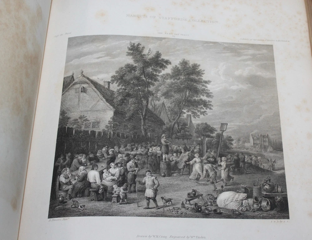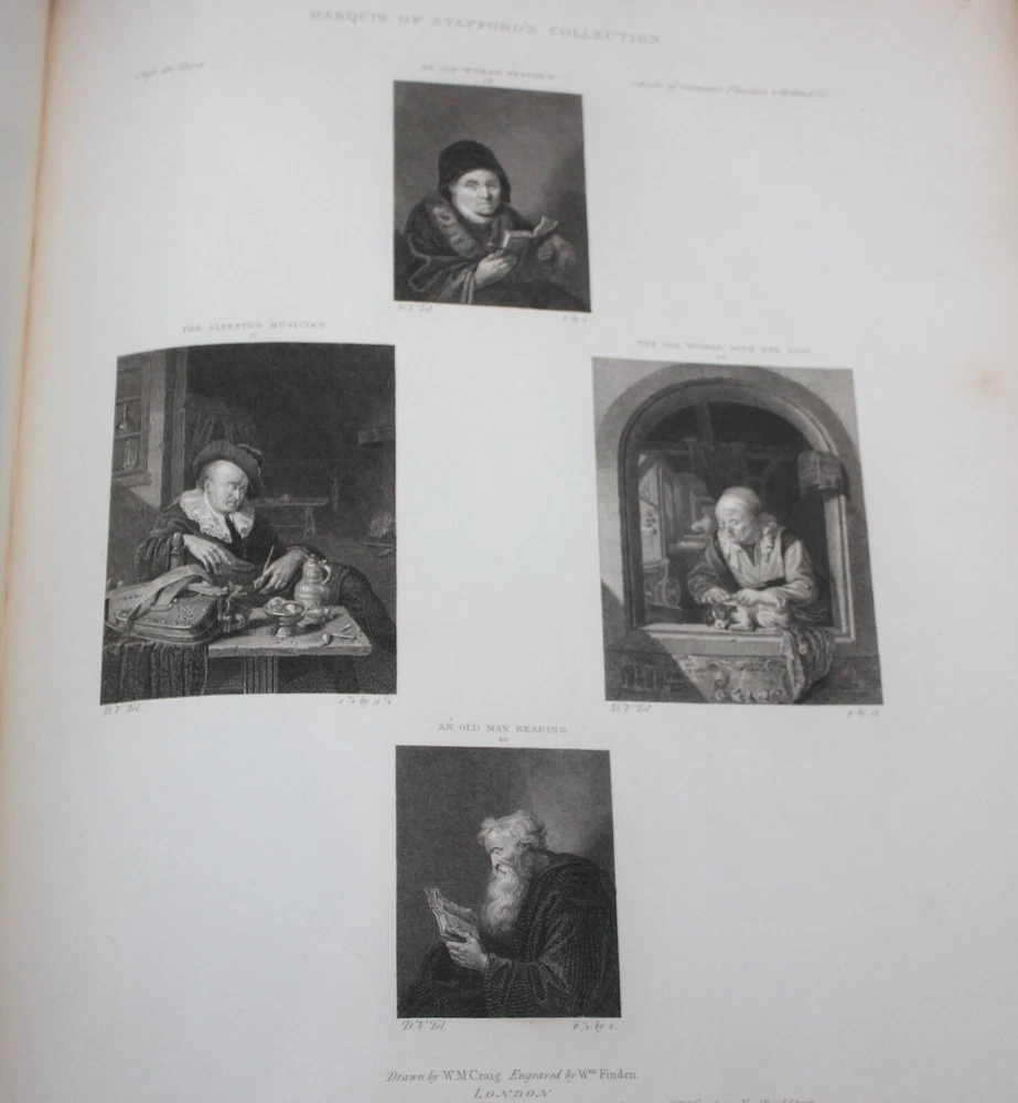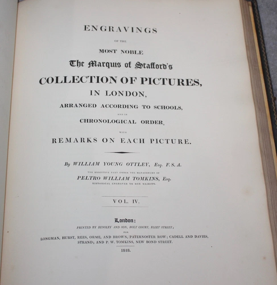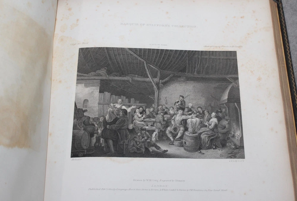 YOU ARE BIDDING ON A RARE MARQUIS OF STAFFORD'S COLLECTION OF PICTURES 1818 LEATHER BOUND VOL III-IV. IT IS IN NICE CONDITION FOR ITS AGE AND IS COMPLETE UNTO ITSELF. IT IS VOLUMES III & IV. THE LEATHER SHOWS SOME SCUFFING AND EDGE WEAR. THE FIRST PAGE OR TWO ARE LOOSE. THERE IS FOXING SOME THROUGHOUT THE BOOK. PLEASE LOOK AT ALL PHOTOS AND ASK ANY QUESTIONS YOU MAY HAVE. REMEMBER THAT I SELL MOSTLY ANTIQUE AND VINTAGE ITEMS AND THAT THEY ARE MOSTLY LIKELY NOT BE PERFECT DO TO THE NATURE OF THEIR AGE. IF YOU HAVE A PROBLEM PLEASE CONTACT ME BEFORE LEAVING FEEDBACK.