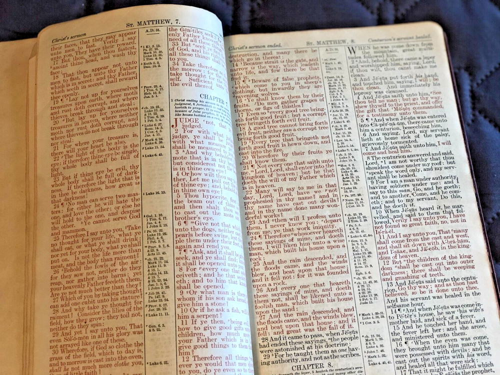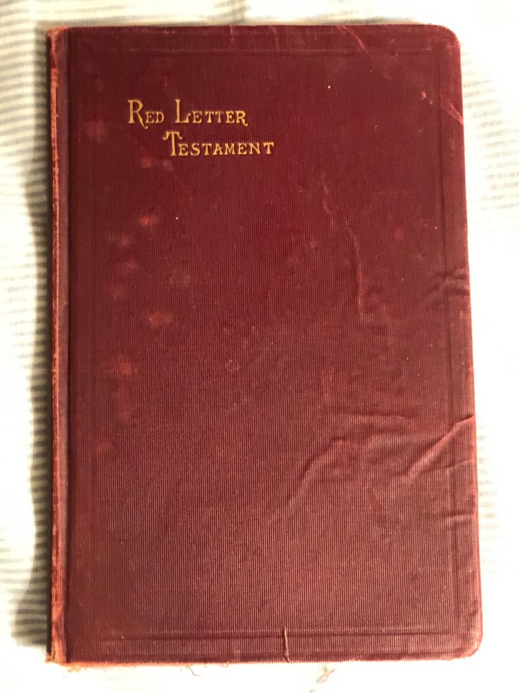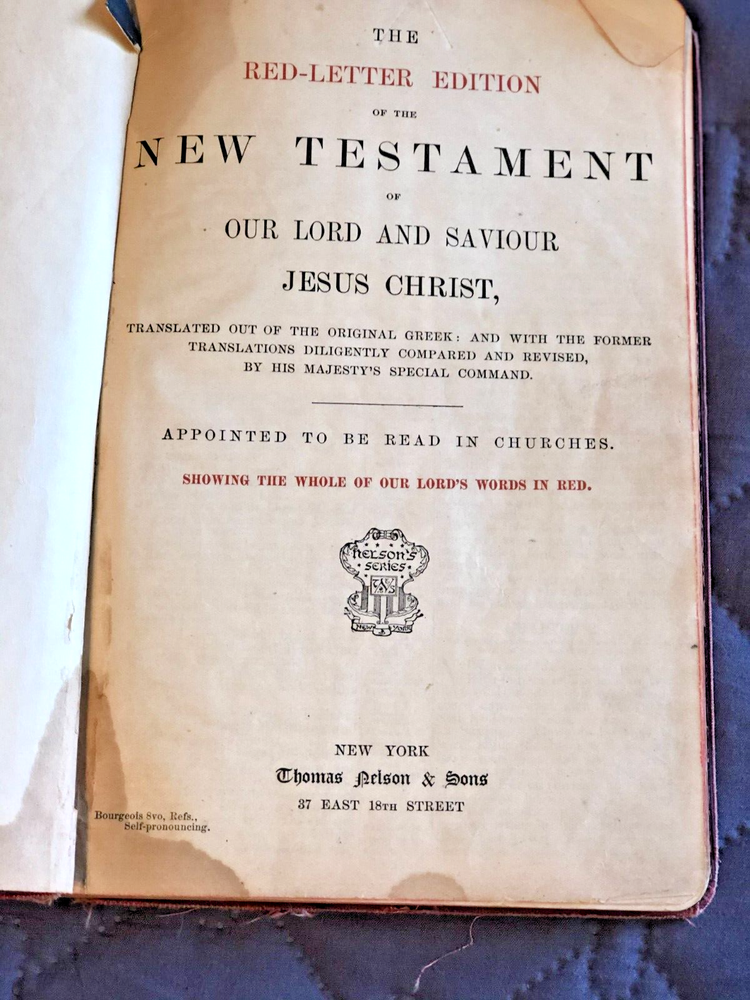VINTAGE RED LETTER TESTAMENT New York,. NY, Thomas Nelson & Sons Red Leather Bound No date in publication c. 1935 CONDITION: VERY GOOD -. Scuffing, staining and toning to Spine, Covers, Corners, Edges, Pages and Page Edges. Mild random staining. Lead pencil price codes top right corner first End-Page. No Other Marks. VERY GOOD-.