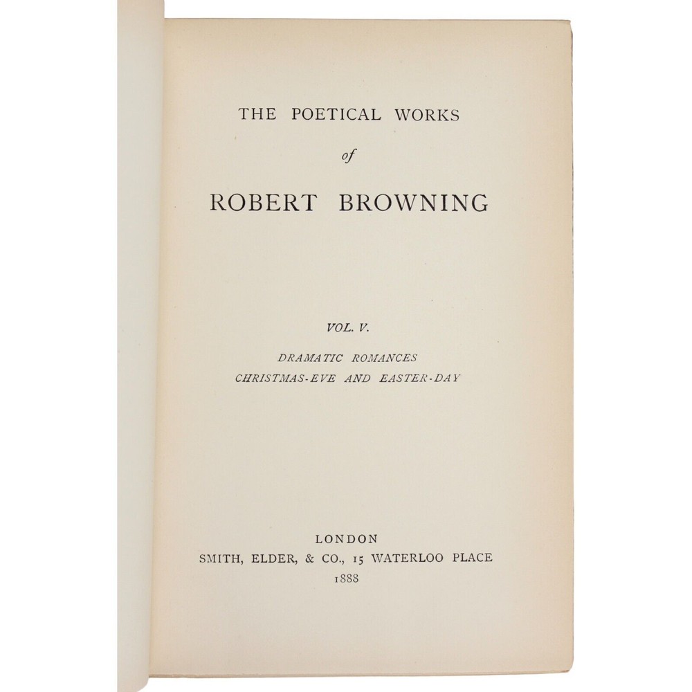 VOLUME 11 ONLY of The Poetical Works of Robert Browning Published by Smith, Elder, & Co., London, 1888 Vol. 11 ONLY (of a 16 Volume Set) BALAUSTER'S ADVENTURE, PRINCE HOHENSTIEL-SCHWANGAU FIFINE AT THE FAIR Published by Smith, Eler, & Co. London, 1888. Very good, 3/4 leather binding with marbled boards and marbled endpapers, 5 raised spine bands, gilt titling and decoration to spine, top edge gilt. Very good hardcover, with tight binding, solid spine, previous owner's bookplate to front endpaper, clean unmarked text. 8vo, measures approx. 5-⅛” x 7-¼”. Photos are of VOLUME 5 - all volumes are in nearly identical condition - if you would like photos message me. Loc: A7 Store Add to Favorites Feedback ROBERT BROWNING LEATHER BOUND FINE BINDING POETRY 1888 Vo 11 ONLY SMITH ELDER UK VOLUME 11 ONLY of The Poetical Works of Robert Browning Published by Smith, Elder, & Co., London, 1888 Vol. 11 ONLY (of a 16 Volume Set) BALAUSTER'S ADVENTURE, PRINCE HOHENSTIEL-SCHWANGAU FIFINE AT THE FAIR Published by Smith, Eler, & Co. London, 1888. Very good, 3/4 leather binding with marbled boards and marbled endpapers, 5 raised spine bands, gilt titling and decoration to spine, top edge gilt. Very good hardcover, with tight binding, solid spine, previous owner's bookplate to front endpaper, clean unmarked text. 8vo, measures approx. 5-⅛” x 7-¼”. Photos are of VOLUME 5 - all volumes are in nearly identical condition - if you would like photos message me. Loc: A7