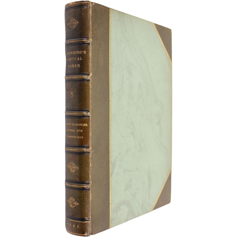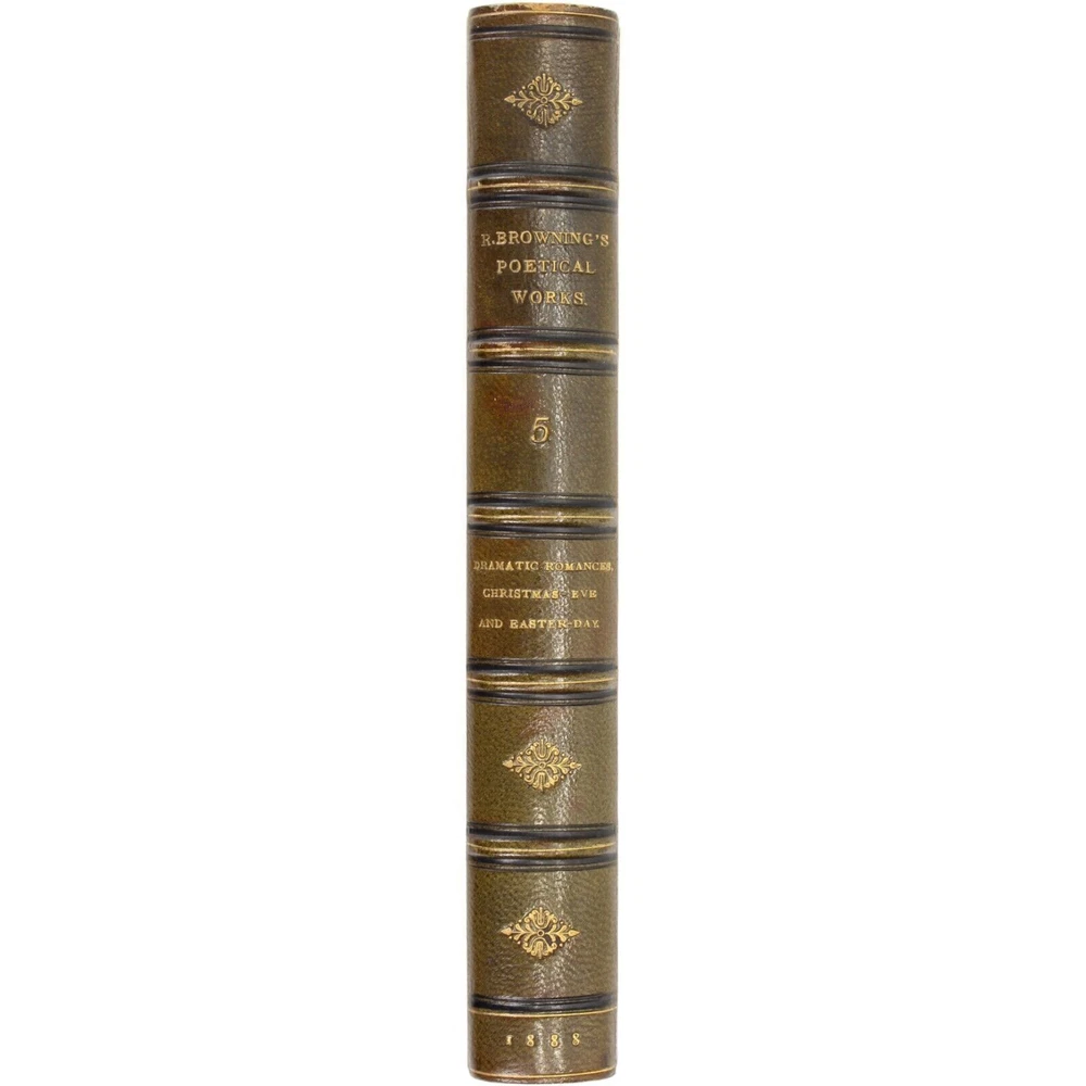 VOLUME 15 ONLY of The Poetical Works of Robert Browning Published by Smith, Elder, & Co., London, 1888 Vol. 15 ONLY (of a 16 Volume Set) DRAMATIC IDYLS, JOCOSERIA Published by Smith, Eler, & Co. London, 1888. Very good, 3/4 leather binding with marbled boards and marbled endpapers, 5 raised spine bands, gilt titling and decoration to spine, top edge gilt. Very good hardcover, with tight binding, solid spine, previous owner's bookplate to front endpaper, clean unmarked text. 8vo, measures approx. 5-⅛” x 7-¼”. Photos are of VOLUME 5 - all volumes are in nearly identical condition - if you would like photos message me. Loc: A7 Store Add to Favorites Feedback ROBERT BROWNING LEATHER BOUND FINE BINDING POETRY 1888 Vo 15 ONLY SMITH ELDER UK VOLUME 15 ONLY of The Poetical Works of Robert Browning Published by Smith, Elder, & Co., London, 1888 Vol. 15 ONLY (of a 16 Volume Set) DRAMATIC IDYLS, JOCOSERIA Published by Smith, Eler, & Co. London, 1888. Very good, 3/4 leather binding with marbled boards and marbled endpapers, 5 raised spine bands, gilt titling and decoration to spine, top edge gilt. Very good hardcover, with tight binding, solid spine, previous owner's bookplate to front endpaper, clean unmarked text. 8vo, measures approx. 5-⅛” x 7-¼”. Photos are of VOLUME 5 - all volumes are in nearly identical condition - if you would like photos message me. Loc: A7