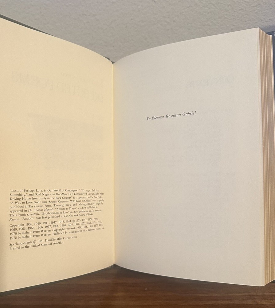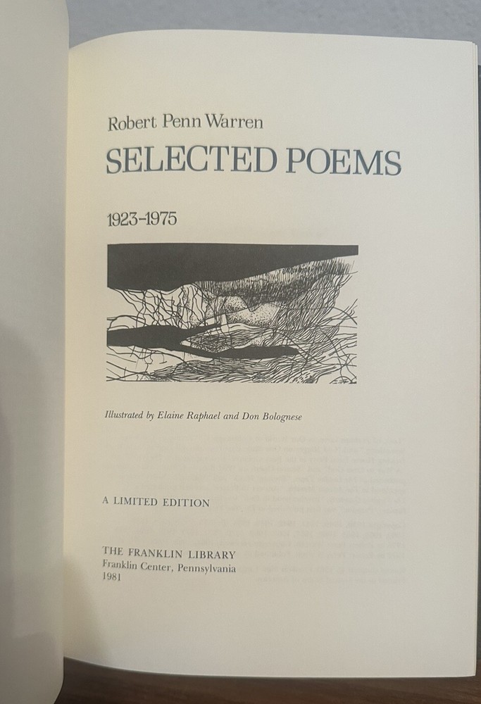 This stunning Franklin Library edition of Robert Penn Warren’s Selected Poems is a collector’s dream—pristine condition, beautifully signed, and from a clean, pet-free estate. The timeless poetry and elegant craftsmanship make it a must-have for any literary enthusiast. Fast shipping included—don’t miss this rare find!