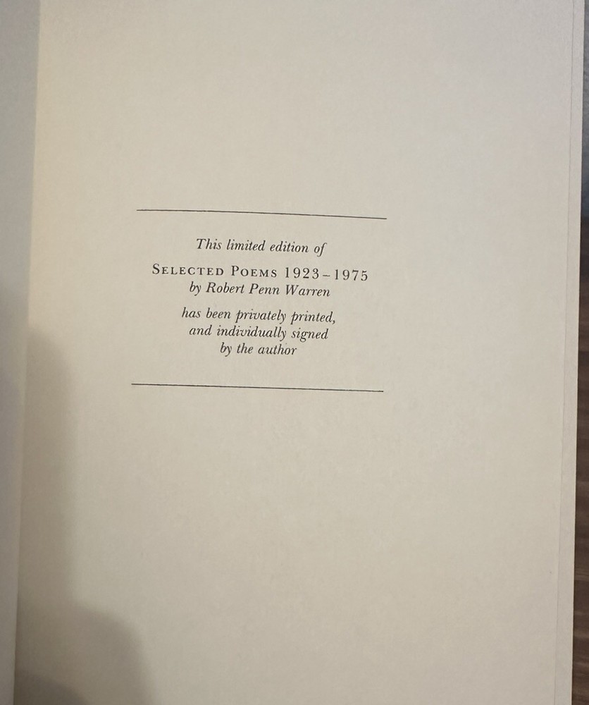 Up for auction is one Signed Limited Edition Franklin Library Collection Book Robert Penn Warren, Selected Poems 1923-1975 - 1981 This book is in excellent condition with little to no wear noted whatsoever. From one large collection we are selling for a client. Books used as decor only. Non smoking no pets estate. See all photos Domestic shipping is FAST and included in our price!