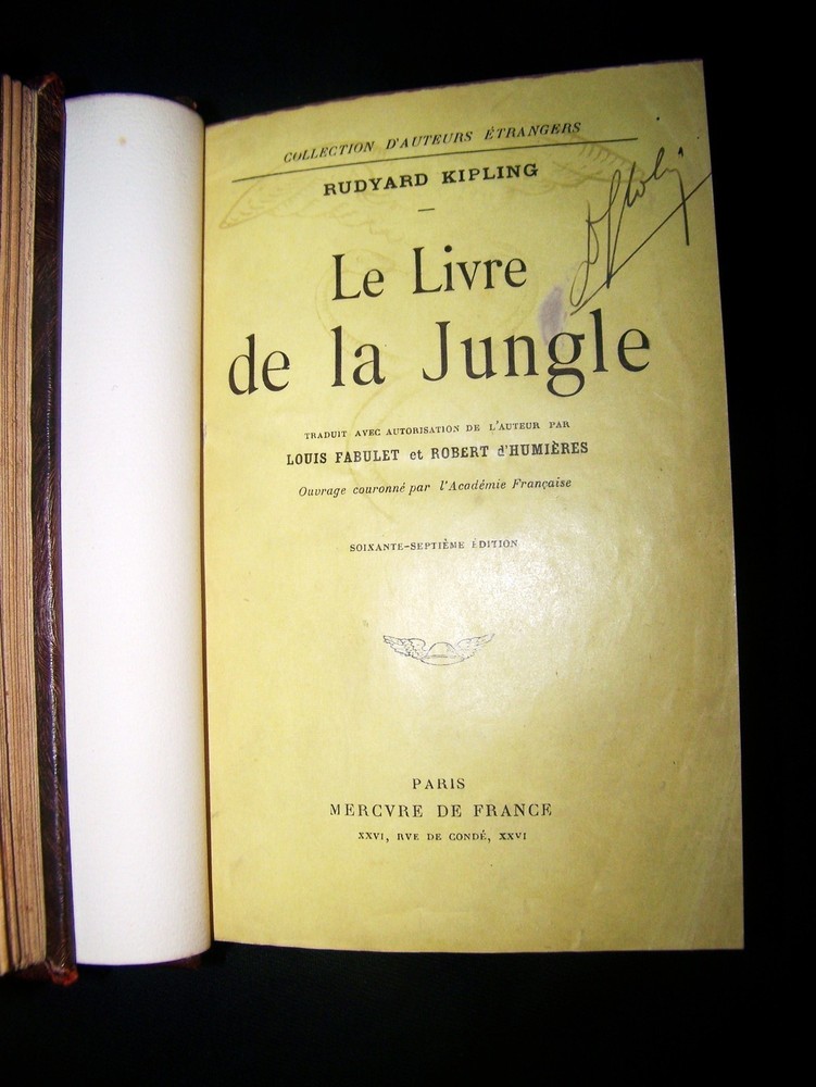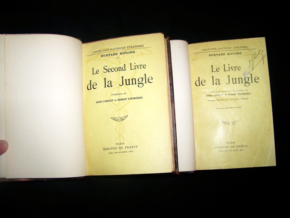 PLEASE READ AND SEE ALL LISTING DETAILS BEFORE BUYING / BIDDING SET OF 2 BOOKS IN FRENCH '' THE BOOK OF THE JUNGLE I & II'' COLLECTION D'AUTEURS ETRANGERS LE LIVRE DE LA JUNGLE - (1916) LE SECOND LIVRE DE LA JUNGLE - (1920) BY: RUDYARD KIPLING TRANSLATED BY: LOUIS FABULET & ROBERT D'HUMIERES PUBLISHED BY: SOCIETE DU MERCURE DE FRANCE FRENCH TEXT - FINE LEATHER BINDING 7.5'' X 5'' VERY RARE VOLUMES HARD TO FIND - WITH THIS PUBLISHER & YEARS OF PRINTING ANTIQUE BOOKS IN AMAZING SOLID CONDITION THEY PRESENT SINGS OF WEAR AND AGING MOSTLY ON COVER EDGES PAGES ARE CLEAN PRESENTING APPROPRIATE TONING FOR IT'S AGE THERE IS A SIGNATURE ON 1ST BOOK TITLE PAGE PLEASE CHECK ALL PICTURES BEFORE BUYING / BIDDING ITEM IN PICTURES WILL BE RECEIVED WINNING BIDDERS & BEST OFFER PAYMENTS SHOULD BE POSTED DURING THE NEXT 3 DAYS AFTER LISTING ENDS FEELING LUCKY...?? SEND US A MESSAGE WITH YOUR BEST OFFER , WE ARE OPEN TO ANSWER ALL YOUR QUESTIONS REGARDING THIS ITEM WE NORMALLY SHIP IN 1 DAY PLEASE NOTE THAT SUNDAYS & HOLIDAYS WON'T COUNT AS A DAY FREE SHIPPING OFFERED FOR THE U.S. ONLY INTERNATIONAL MAKE SURE TO VERIFY SHIPPING RATES BEFORE BID OR BUY WE ONLY SHIP INTERNATIONAL PRIORITY MAIL WE ARE NOT RESPONSIBLE FOR REGULATIONS, CUSTOMS , DUTIES OR ANY WRONG DONE BY YOUR LOCAL POSTAL SERVICE BY BUYING / BIDDING YOU ACCEPT THIS CONDITIONS PLEASE KEEP ALL COMMUNICATIONS THROUGH EBAY. TO SEE MY OTHER ITEMS CLICK HERE ! TO ADD ME TO YOUR FAVORITES... CLICK HERE !
