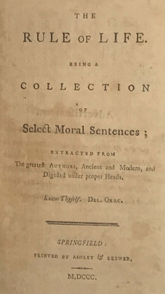 THE RULE OF LIFE. Being a Collection of Select Moral Sentences; Extracted From the Greatest Authors, Ancient and Modern, and Digested Under Proper Heads Title: THE RULE OF LIFE. Being a Collection of Select Moral Sentences; Extracted From the Greatest Authors, Ancient and Modern, and Digested Under Proper Heads Publication: Springfield, [MA]: Printed by Ashley & Brewer, 1800 Description: 12mo. 17 cm. v, [5]-192 pp. Period flame calf binding with red leather label and gilt rules on spine. Fine copy. Large bookplate of Young Men's Social Library, Ipswich with rules on pastedown. Perhaps the first American edition of an English one first done in 1742 edited by Thomas Sampson and reprinted often, title nearly the same. "The rule of life: in select sentences, collected from the greatest authors, antient and modern." Seller ID: 64278 Subject: Americana We are a Washington, D.C. based bookstore in business for over 40 years. We specialize in Americana and general Antiquarian books. Terms All orders ship within three business days. Standard mail is USPS Priority Mail. Expedited and international shipping are also available. We offer combined shipping on multiple orders. All items are guaranteed to be as described or they may be returned within 30 days of receipt for a full refund. This listing was created by Bibliopolis.