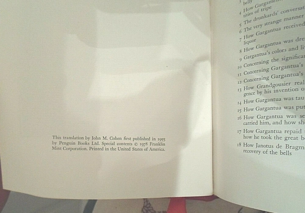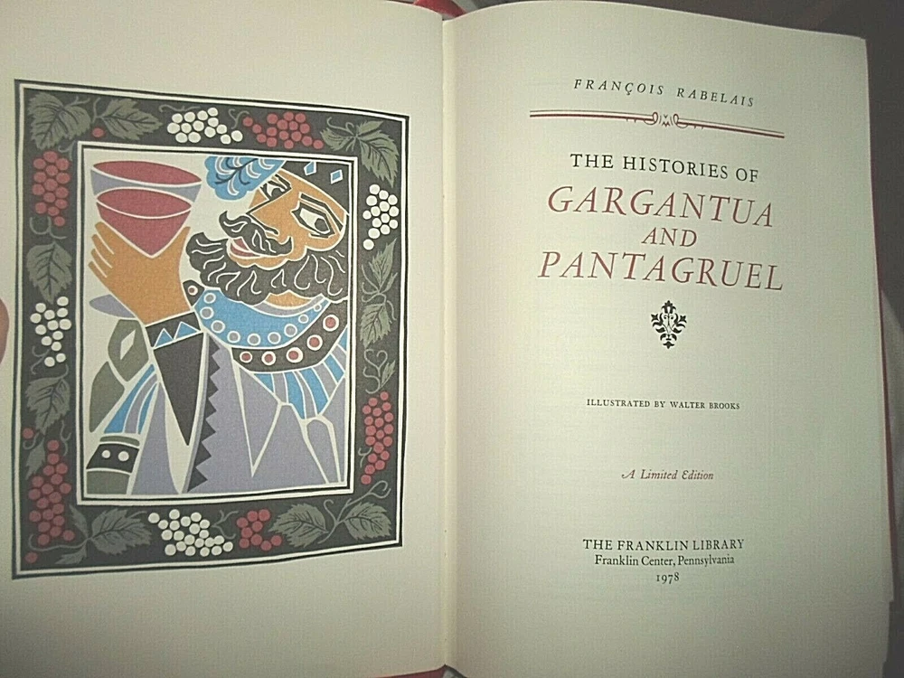 Rabelais, Francois THE HISTORIES OF GARGANTUA AND PANTGRUEL Franklin Library Limited Edition Hardcover Franklin Center, Pennsylvania Franklin Library 1978, Leather Bound, Accented in 22kt gold. Printed on archival paper with gilded edges. 773 pages. The endsheets are of red moire fabric with a silky ribbon page marker. Smyth sewing and concealed muslin joints. This book is in full leather with hubbed spines. This Limited Edition was published exclusively for subscribers to The Franklin Library collection The 100 Greatest Books of All Time. Leather is red and gold and is in EUC. No marks, writing, stains or yellowing of the pages. There are some minor "scratches" to the gilded edges from storage - PRICE REFLECTS THIS ISSUE - please see all photos as they are part of the description. Book measures approx. 9-1/2" high x 6-3/4" wide. Spine is 2" wide. Fast Shipping From A Smoke-Free, Mothball-Free, Mold-Free Home. (Your 100% satisfaction is my priority. If you are unhappy with your purchase please contact me privately (before leaving feedback) and I will resolve the issue immediately). Thank you.