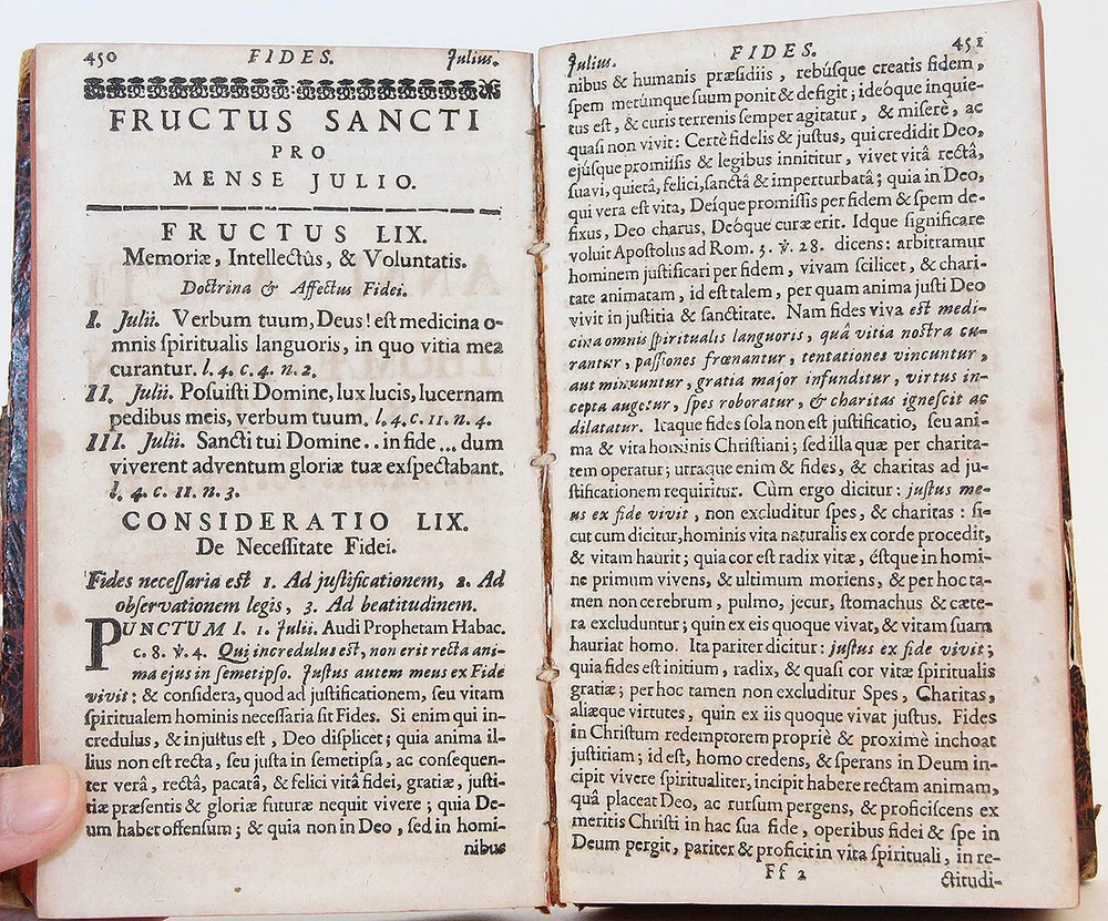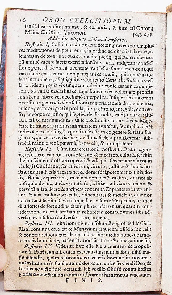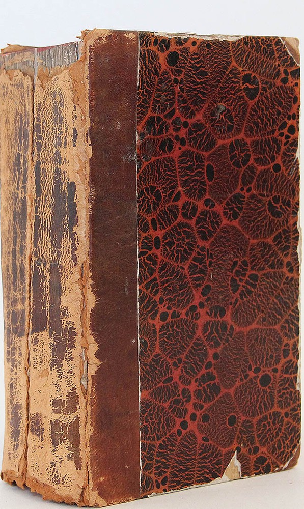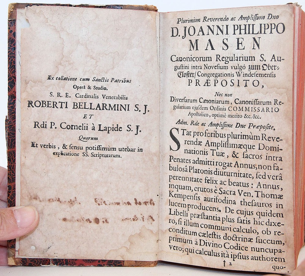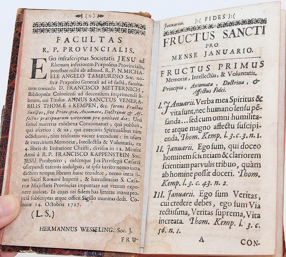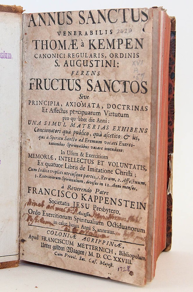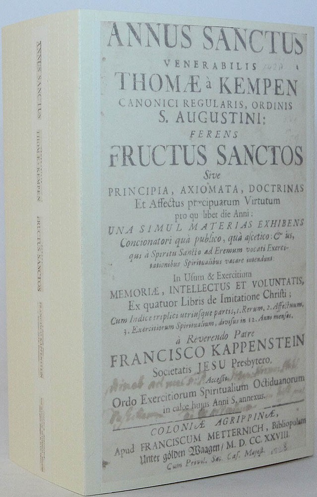 Annus Sanctus Venerabilis Thomae à Kempen Ferens Fructus Sanctos Sive Principia, Axiomata, Doctrinas ... Ex Quatuor Libris De Imitatione Christi [The Holy Year of the Venerable Thomas a Kempis ... Out of the Four Books of the Imitation of Christ] Author: Thomas a Kempis In Latin. 1728 first edition Apud Franciscum Metternich ( Coloniae Agrippinae - Cologne, Germany), 4 x 6 7/8 inches tall hardbound, marbled paper-covered boards over leather spine, [16], 992, [40], 16 pp. Covers rubbed, bumped and edgeworn, cracked along the fore edge, with the spine leather chipped, flaking and split down the middle. Lacking blank endpapers, but otherwise complete. Title page chipped and ink marked, not affecting text. Contents are age toned and foxed, but the paper is still supple and all is quite legible. Nicely enclosed and protected in an acid-free, lignin-free Brodart rare book box, with the title page to the front and title to the spine for easy identification. Scarce. Includes ' Ordo exercitiorum spiritualium octiduanorum ' (16 pp.) at the end. An important collection of works, edited by German Jesuit scholar Franz Kappenstein, about and drawn from The Imitation of Christ and other significant works by Thomas a Kempis. The Imitation of Christ was written (or at a minimum, transcribed) by Catholic monk Thomas Kempis (circa 1380-1471), as four separate books completed between 1420 and 1427, at Mount Saint Agnes monastery, in the town of Windesheim, located in what is now the Netherlands. He wrote these works for the instruction of novices of his Augustinian monastic order, followers of Geert Groote's Brethren of the Common Life. But the writings quickly became popular among all the literate faithful. They were copied together in one manuscript as early as 1427, by Kempis, and copied (and later printed) together fairly consistently thereafter. Soon after hand-copied versions of the Imitatio Christi initially appeared, the printing press was invented, and it was among the first books after the Bible to be printed. There is probably no other book other than the Bible which has been printed in so many editions and translations. In the past six hundred years, the work has been translated from Kempis' medieval Latin into nearly every language in the world.
