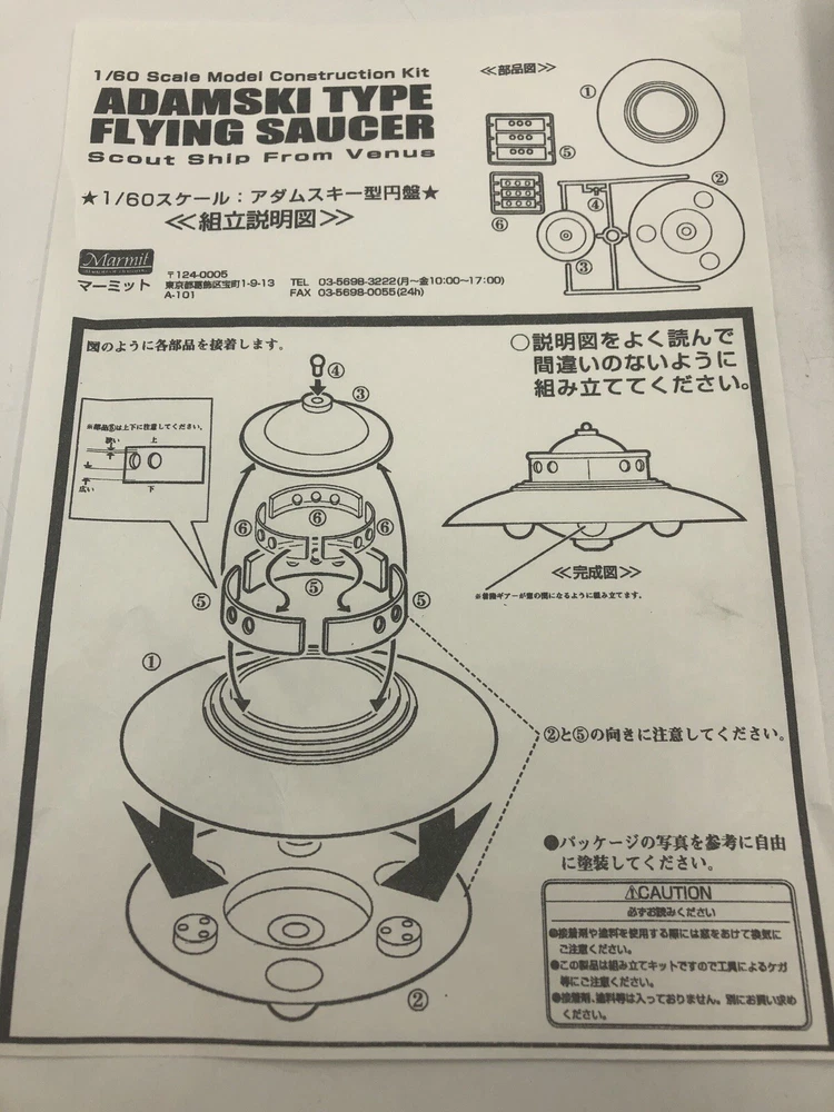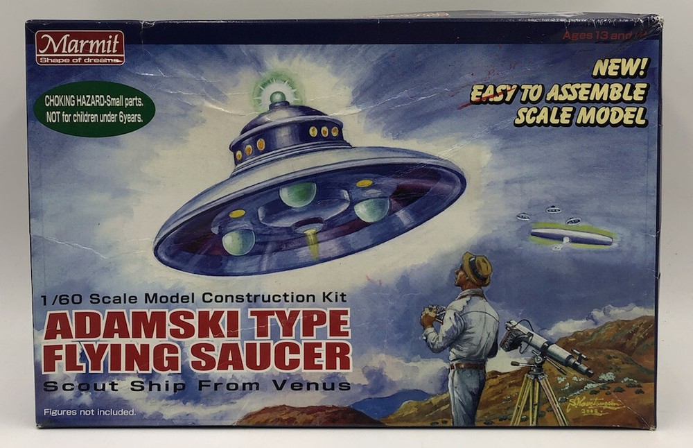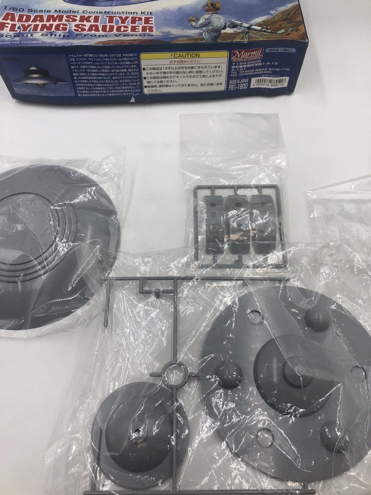 Original 2003 Marmit model kit . Box is opened but contents are sealed. Some pieces have detached from the brackets in the packaging. Box has moderate wear , mainly indentation. See photos for more condition details.Comes with all that is pictured. See photos for more details Rare Marmit Adamsky Type Flying Saucer Model Kit ~ Japan 2003.