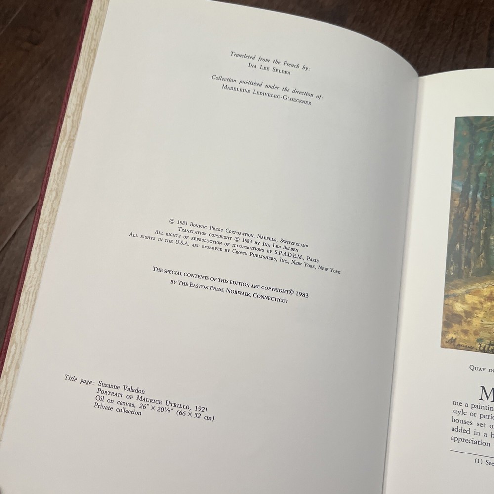 Maurice Utrillo V. Author: Warnod, Jeanine Title: Maurice Utrillo V. Publication: Norwalk: The Easton Press, 1983 Description: Leather_bound. 12 1/4" X 9". 96pp. Very mild shelf wear to covers, corners, and edges of red leather over boards. All-edge gilt. Faint musty smell to pages. Pages are free of marks and notation. Binding is sound. An overall clean, solid copy of this collection of works by French painter Maurice Utrillo. This book is heavy and oversized and will require additional postal charges to ship internationally. Please contact us today for an international shipping quote. Very good. Seller ID: 12086 Subject: Art, Architecture, & Design, Decorative Bindings