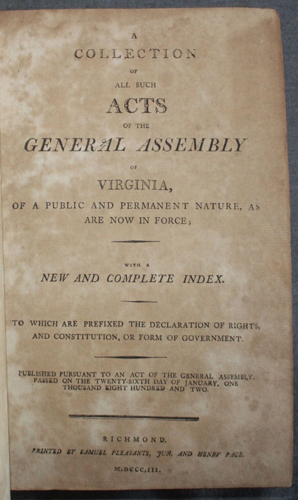 [Revised Code] A COLLECTION OF ALL SUCH ACTS OF THE GENERAL ASSEMBLY OF VIRGINIA, OF A PUBLIC AND PERMANENT NATURE, AS ARE NOW IN FORCE; with a New and Complete Index Author: Virginia Title: [Revised Code] A COLLECTION OF ALL SUCH ACTS OF THE GENERAL ASSEMBLY OF VIRGINIA, OF A PUBLIC AND PERMANENT NATURE, AS ARE NOW IN FORCE; with a New and Complete Index Publication: Richmond: Samuel Pleasants, Jun and Henry Pace, 1803 Description: Full Leather. Fair binding. Octavo. [2], vi, 454, [2 (blank)], 72 (index) pp. First edition, thus. In contemporary sheep with red morocco title label on the spine. A second volume of the Revised Code was issued in Samuel Pleasants in 1808. Binding is worn with chipping at the head of the spine; joints starting; contemporary owner notes marked through on the front endpapers. Textblock remains solid; pages generally darkened. Interesting look into early Virginia law from, according to Shaw & Shoemaker, 1748-1802 with substantive material from laws governing militias to laws about slavery and free blacks. Herein are also reprinted the Virginia Declaration of Rights (6 May 1776) and the first Virginia Constitution (29 June 1776). Uncommon. Shaw & Shoemaker 5512. Seller ID: 5574 Subject: Americana, History--U.S., Rare Book Room Michael Pyron, Bookseller, ABAA/ILAB I have been a bookseller and bookbinder for nearly two decades. I offer a general stock with an emphasis in private press and illustrated books, as well as literature and Americana. I take pride in my high level of customer service; if you aren't satisfied with either the book or the service you've received, please let me know about it so I can make it right. Terms All order are shipped with 1 business day upon receipt of payment. The standard shipping method is USPS Media Mail but Priority Mail or UPS shipping is available. Please inquire before payment if you'd like the invoice adjusted to account for a different shipping method. I will accept returns for any reason within 30 days so long as the book or item is returned in the same condition in which it was sent. This listing was created by Bibliopolis.