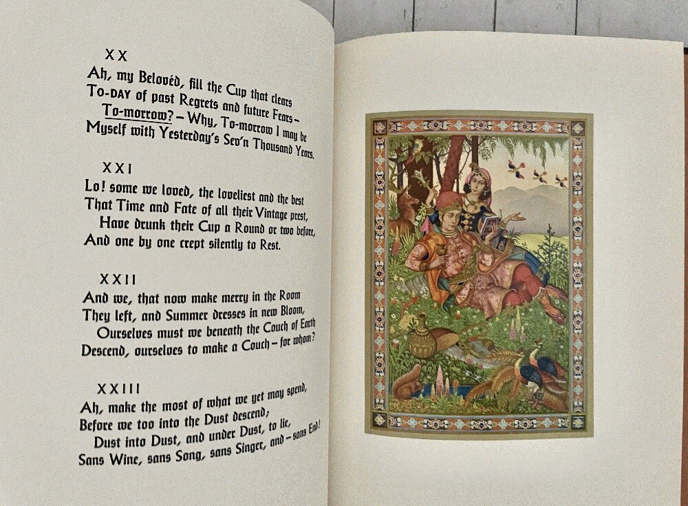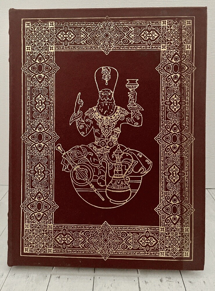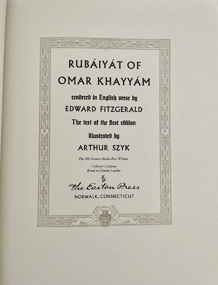 PorterMonkey presents ... Rubaiyat of Omar Khayyam Rendered in English Verse Author: Khayyam, Omar; Fitzgerald, Edward (translator); Illustrated By Arthur Szyk [Illustrator] Publisher: Easton Press Release Date: 1976 Seller Category: POETRY Qty Available: 1 Condition: Collectible: Very Good Sku: C2795VG013023c6 Notes: Collector's edition. Easton Press. 1976. Norwalk, Connecticut. Genuine Leather. Easton Press. Moire endpapers, top/bottom gilt, Japanese style folded pages, silk ribbon bookmark. Unmarked interior, no highlighting, underlining or writing. Maroon leather cover, gilt decorative, faded strip to gilt front cover, clean and bright, light signs of edge wear. Square, tight. Easton Press. A currently OOP / NP (No Longer in Print/ Out-Of-Print edition), uncommon, or hard to find book. Omar Khayyam. Rubaiyat of Omar Khayyam Rendered in English Verse. Book. Illus. by Szyk, Arthur. 4to-over 9-12" tall. Unpaginated. Ships in box, quickly and with care. Description: