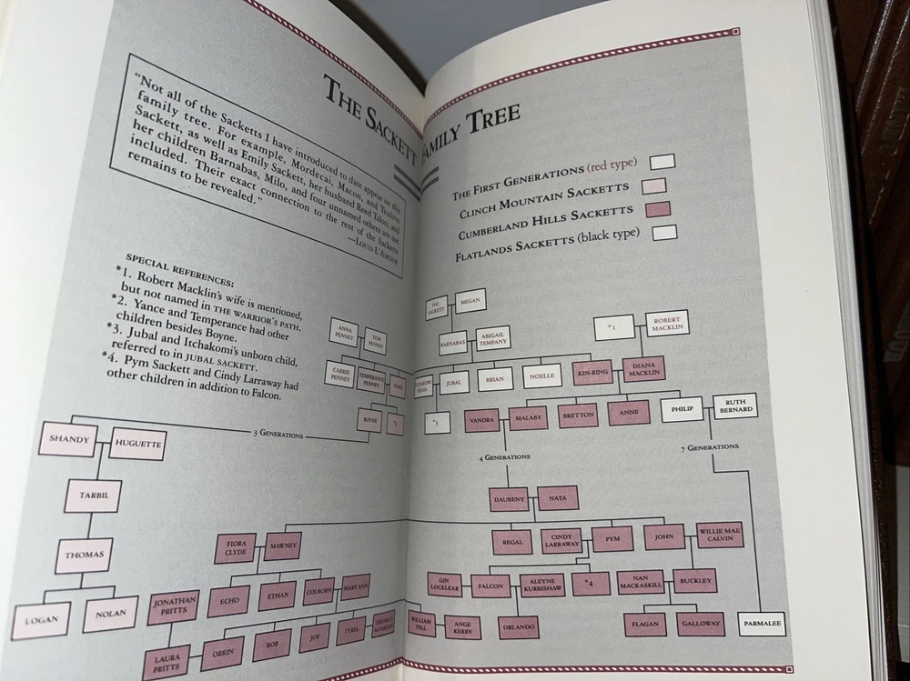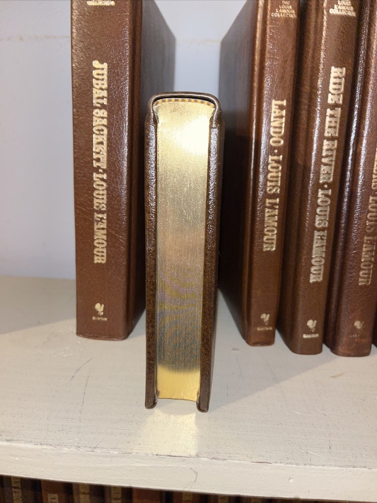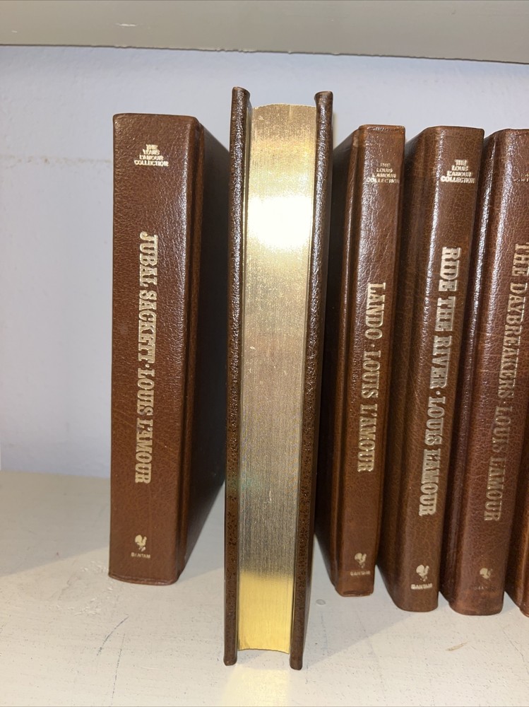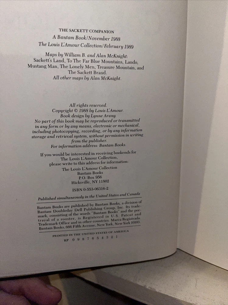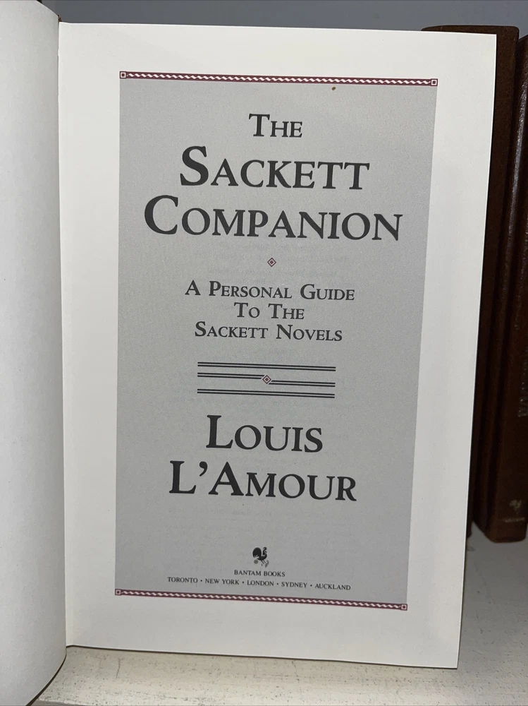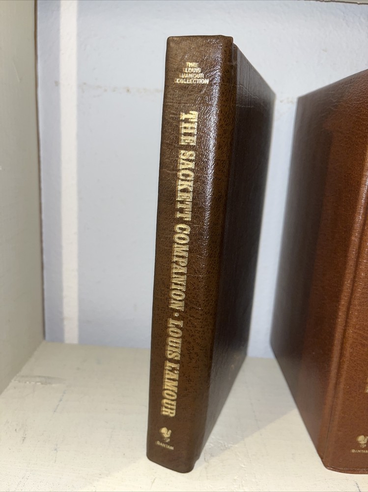 THE SACKETT COMPANION Louis L’Amour GENUINE LEATHER Edition novel. Deluxe edition with gold gilt page edges. First Edition!!! “Smell the leather, experience the West” The Sackett Companion is an ESSENTIAL guide to the Sackett series of 17 books. The Sackett family novels are favorites among all of L’Amour’s great novels. L’Amour tells the story of the American frontier through generations of the Sackett family. The Louis L’Amour Collection is a subscription books series that contains 122 books of fiction, non-fiction, poetry, biography and more. Shipped securely wrapped and in a box. This volume will not be damaged in the mail. Shipping is $4.45 for first book. Media Mail rates.