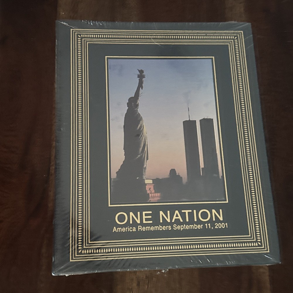 The product is a leather-bound first edition book titled "One Nation America Remembers 9/11" published by Easton Press in 2001. The book is part of the World Trade Center Attack series and features original photographs of the September 11th attacks. It is a vintage collectible item that serves as a historical narrative about America's response to the tragic events of 9/11. The book is intended for a wide audience, including young adults and adults, and is a valuable addition to any collection focusing on history and imagery from the 2000s era. New in plastic