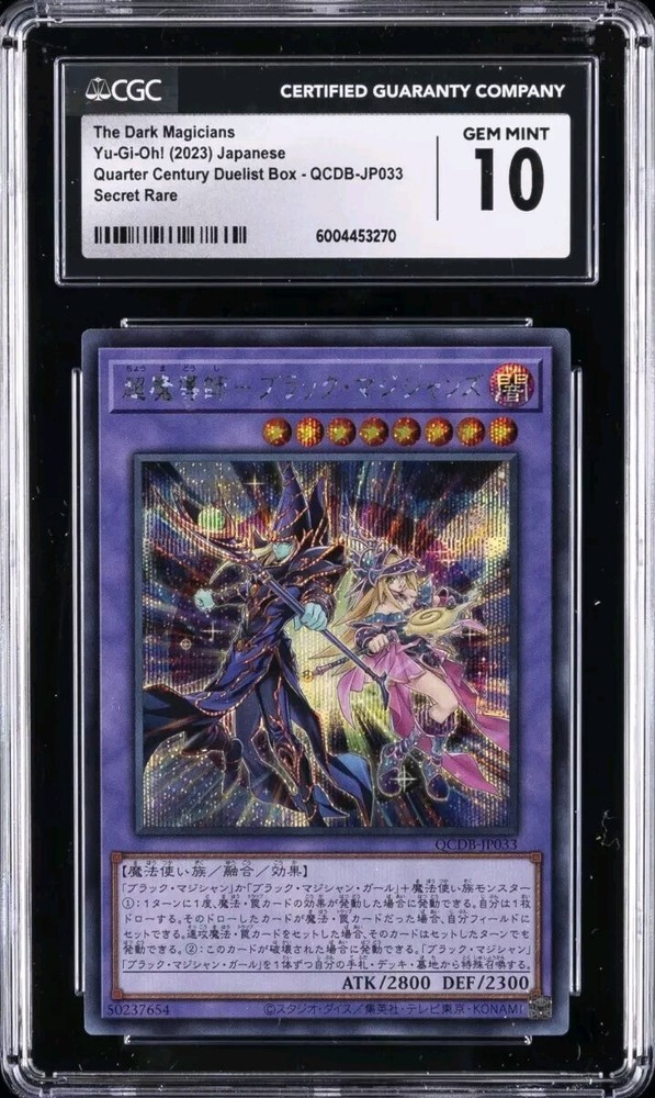 The product is a rare 2023 Yu-Gi-Oh! Japanese Quarter Century Duelist Box featuring The Dark Magicians card, graded CGC 10. This collectible card game item is a foil card with the attribute of Darkness, manufactured by Konami. It is a highly sought-after card for fans and collectors of the Yu-Gi-Oh! TCG, known for its powerful abilities and unique design. This particular card is a valuable addition to any collection due to its rarity and high grade.