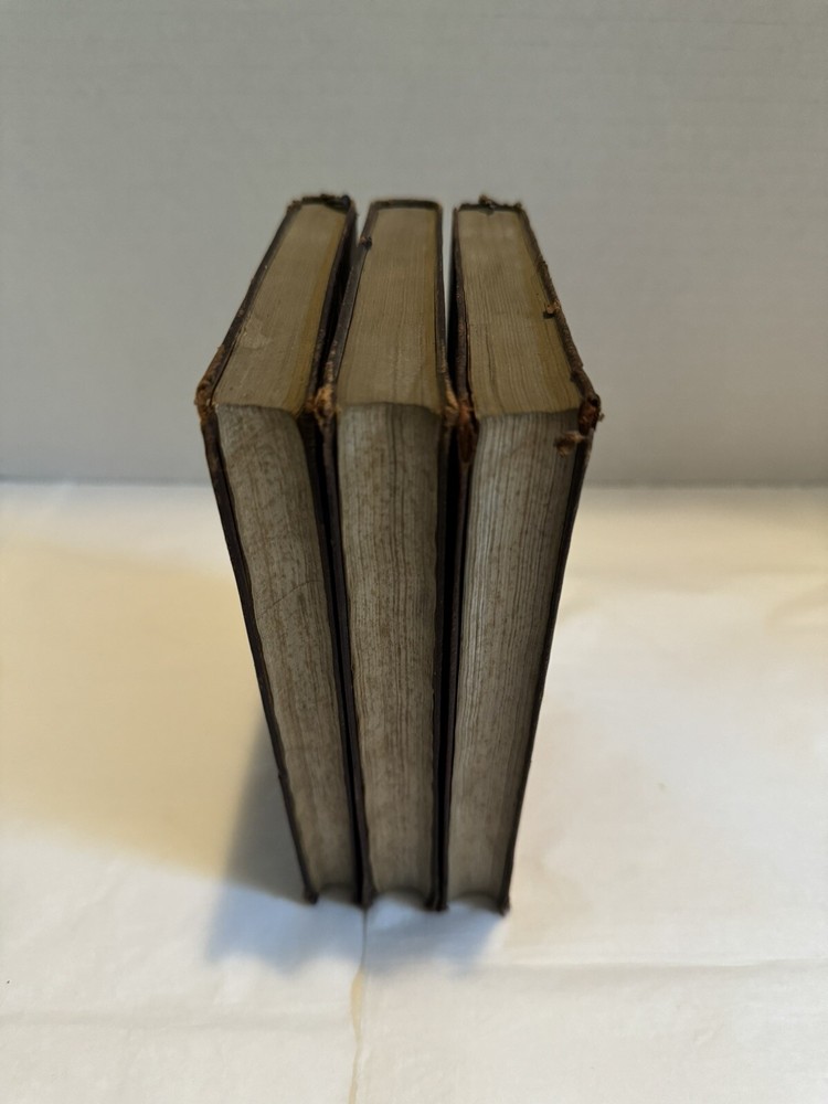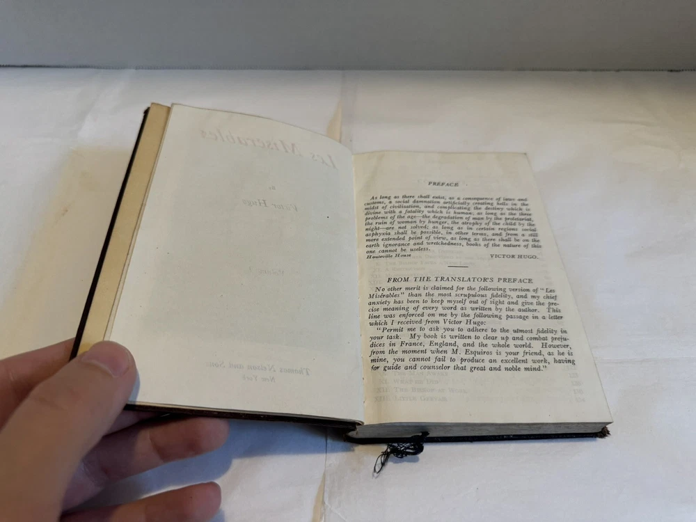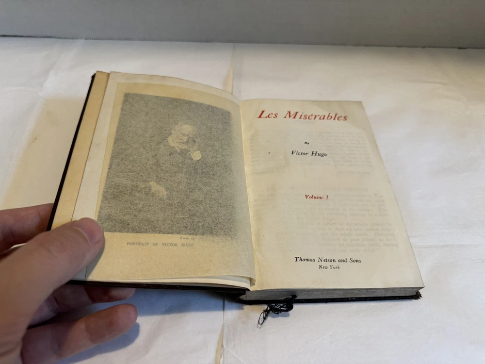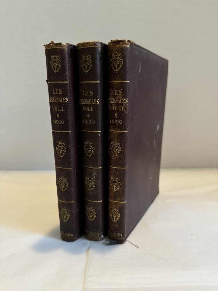 3 Three - Volume Set, Leatherbound, Thomas Nelson, no date, but appears 1900 Les Misérables is a French epic historical novel by Victor Hugo , first published in 1862, that is considered one of the greatest novels of the 19th century. Les Misérables has been popularized through numerous adaptations for film, television, and the stage, including a musical . In the English-speaking world, the novel is usually referred to by its original French title. However, several alternatives have been used, including The Miserables , The Wretched , The Miserable Ones , The Poor Ones , The Wretched Poor , The Victims , and The Dispossessed . Beginning in 1815 and culminating in the 1832 June Rebellion in Paris , the novel follows the lives and interactions of several characters, particularly the struggles of ex-convict Jean Valjean and his experience of redemption. Examining the nature of law and grace, the novel elaborates upon the history of France , the architecture and urban design of Paris, politics, moral philosophy , antimonarchism , justice, religion, and the types and nature of romantic and familial love.