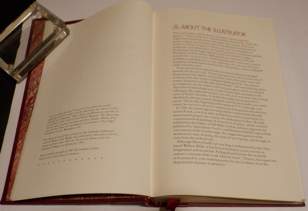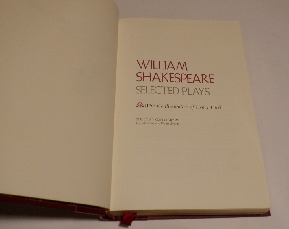 This is a Hardcover edition of The Selected Plays of William Shakespeare by William Shakespeare This edition was published from The Franklin Library in 1981 This book features a red ribbon bookmark, decorative gilt edges and illustrations from Henry Fuseli and is in excellent condition It is approx 9 1/2 by 6 1/2 in size and is 655 pages Please see photos for more details Please email questions