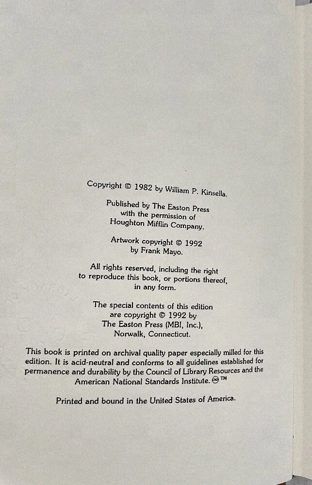 PorterMonkey presents ... SHOELESS JOE: FIELD OF DREAMS Author: Kinsella, W. P Publisher: Easton Press Release Date: 1992 Seller Category: CLASSICS & LITERARY FICTION Qty Available: 1 Condition: Collectible: Good Sku: C3773Gn020623c5 Notes: **Cover image differs/Some alternate cover art, same ISBN, same publisher and year of publication** Easton Press, Leather cover. Name embossed title page. Unmarked interior text, no highlighting, underlining or writing. Bound in full tan leather boards, gilt lettering along spine. Cover in very good condition, clean and bright, very light signs of edge or shelf wear. Silk ribbon. 224 pages, 8vo. Full gilt page edges. Color illustrations. Binding is in very good condition, solid, square. Easton Press, Norwalk. 1992. A collectable book that is currently OOP / NP (Out-Of-Print edition / No Longer in Print ), uncommon, a first edition or hard to find book. Ships in box, quickly and with care. Description: âÂÂIf you build it, he will come.â These mysterious words inspire Ray Kinsella to create a cornfield baseball diamond in honor of his hero, Shoeless Joe Jackson. What follows is a rich, nostalgic look at one of our most cherished national pastimes and a remarkable story about fathers and sons, love and family, and the inimitable joy of finding your way home.