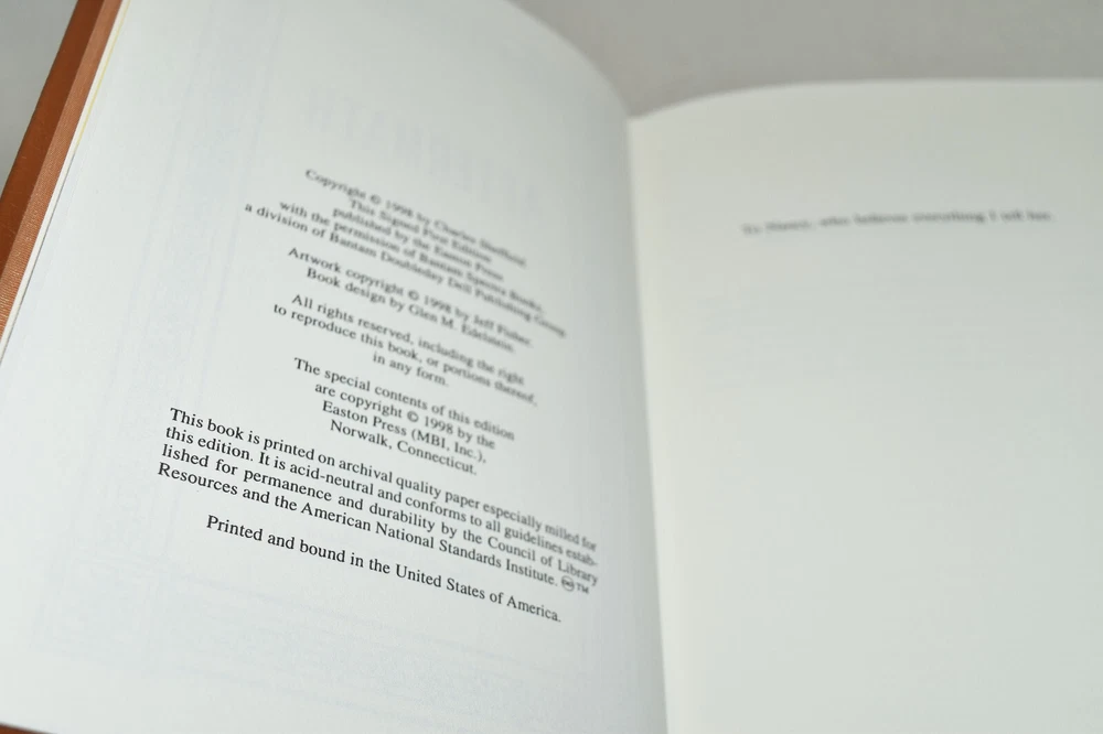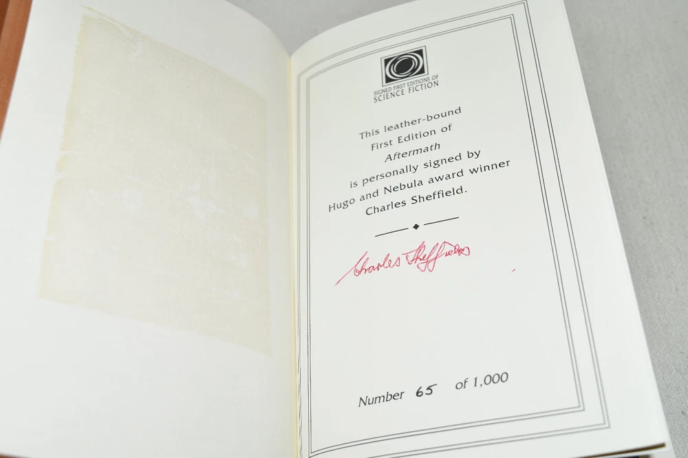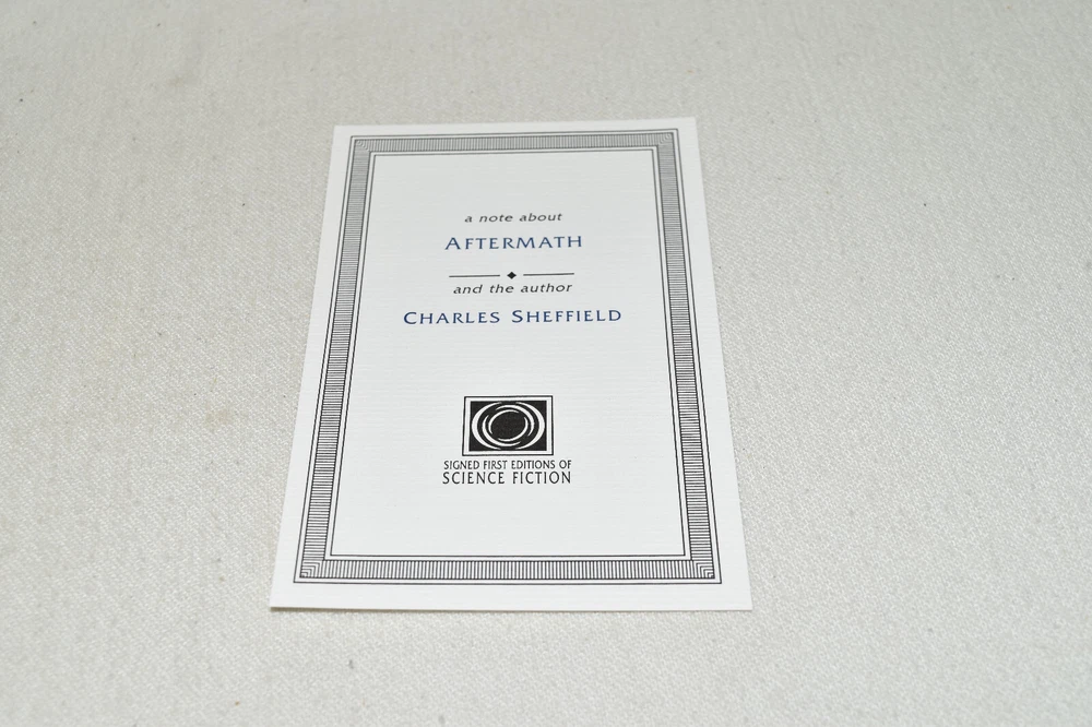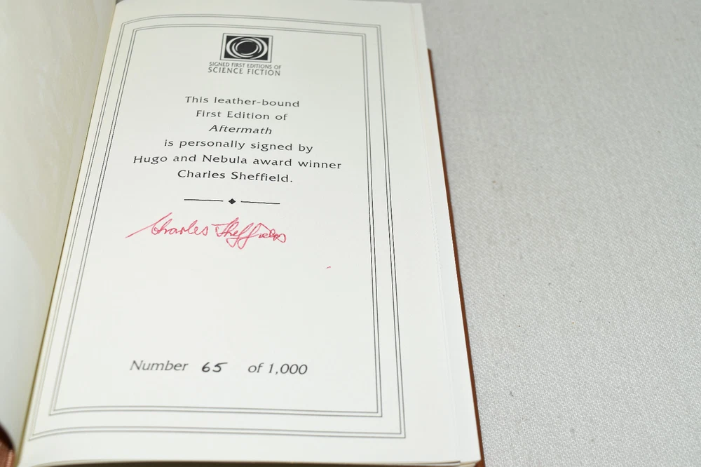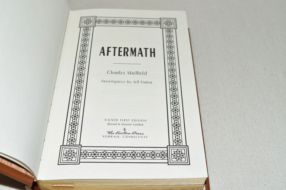 From the Easton Press Signed Collection... Aftermath PERSONALLY SIGNED by Author Charles Sheffield Frontispiece by Jeff Fisher Number 65 of 1,000 Signed Copies Easton Press Signed Edition Copyright 1998 by The Easton Press Bound in Premium Full Leather This Signed Edition contains all of the classic Easton Press trimmings: Premium Leather Silk Moire Endleaves Distinctive Cover Design Hubbed Spine, Accented in Real 22KT Gold Satin Ribbon Page Marker Gilded Page Edges Long-lasting, High Quality Acid-neutral Paper Smyth-sewn Pages for Strength and Durability A very scarce title in any condition, this copy is in Fine condition. The front and back covers are both in terrific condition and the gilded page edges show only faint wear (see pictures of all sides). There is faint residue on the second page. This book is personally signed by the Author and comes complete with Collector's Notes and a Certificate of Authenticity. It would be a beautiful addition to your Easton Press collection. Hopefully you can add this book to your collection and enjoy it in the years to come... Please Email Me With Any Questions You Might Have! Shipping Info: Buyer to Pay Shipping and Handling International Bidders Pay Extra Shipping Seller Not Responsible For Uninsured Items Lost or Damaged in Mail Forms of Payment Accepted: Paypal Good luck and happy bidding! Powered by eBay Turbo Lister The free listing tool. List your items fast and easy and manage your active items.