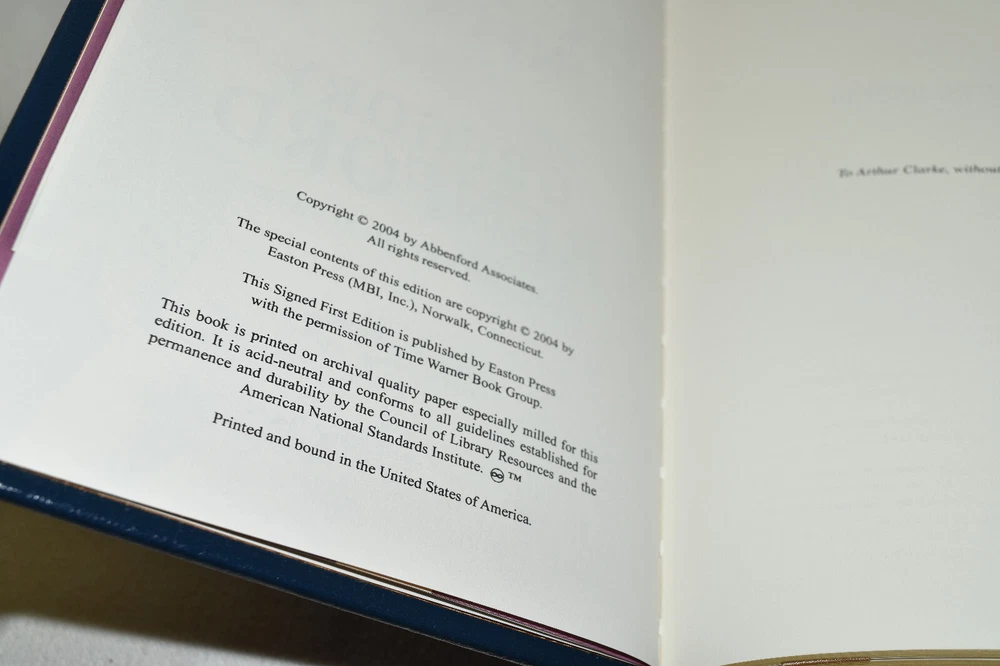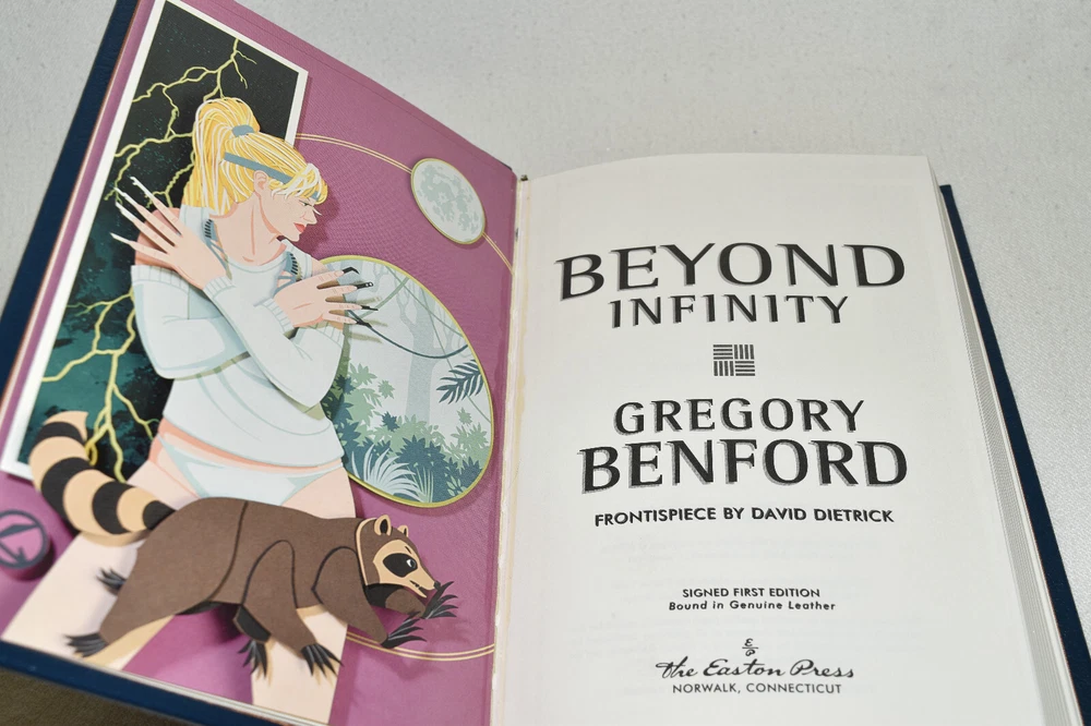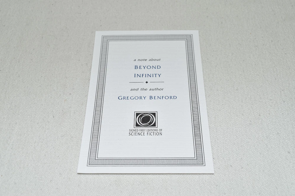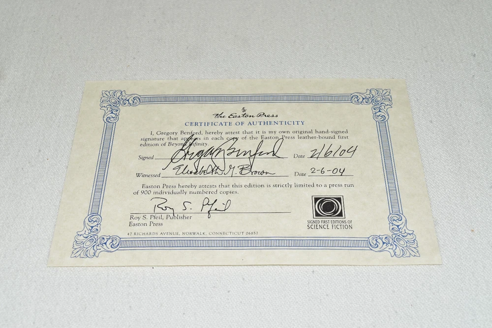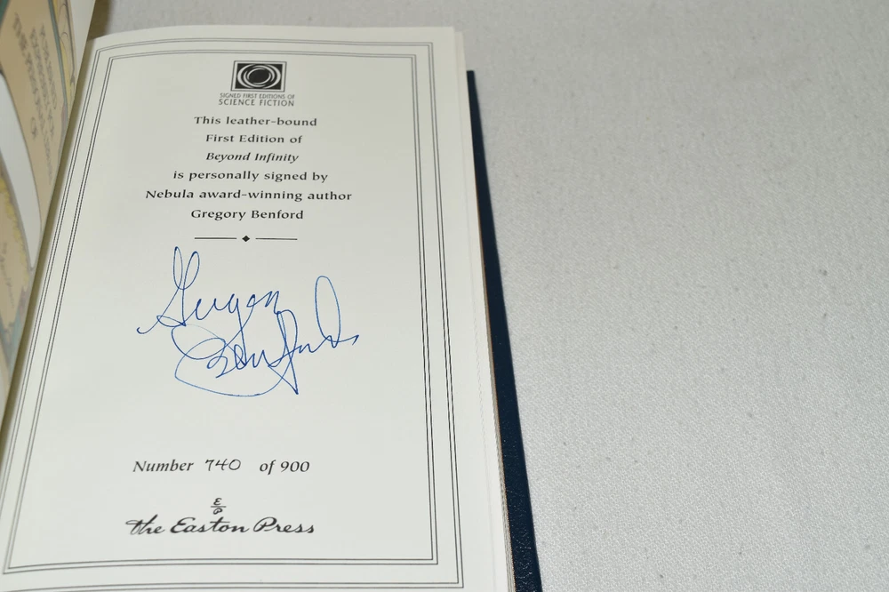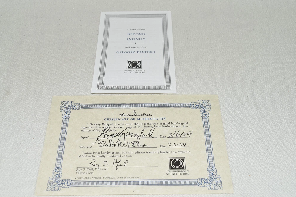 From the Easton Press Signed Collection... Beyond Infinity PERSONALLY SIGNED by Gregory Benford Illustrated by David Dietrick Limited to 900 Copies, this is Number 740 Easton Press Signed Edition Copyright 2004 by The Easton Press Bound in Premium Full Leather This Signed Edition contains all of the classic Easton Press trimmings: Premium Leather Silk Moire Endleaves Distinctive Cover Design Hubbed Spine, Accented in Real 22KT Gold Satin Ribbon Page Marker Gilded Page Edges Long-lasting, High Quality Acid-neutral Paper Smyth-sewn Pages for Strength and Durability A very scarce title in any condition, this copy is in Fine condition. The front and back covers are both in near perfect condition and the gilded page edges show hardly any wear (see pictures of all sides). There is a blank bookplate affixed to the second page. This book is personally signed by the Author and comes with Collector's Notes and a Certificate of Authenticity. It would be a beautiful addition to your Easton Press collection. Hopefully you can add this book to your collection and enjoy it in the years to come... Please Email Me With Any Questions You Might Have! Shipping Info: Buyer to Pay Shipping and Handling International Bidders Pay Extra Shipping Seller Not Responsible For Uninsured Items Lost or Damaged in Mail Forms of Payment Accepted: Paypal Good luck and happy bidding! Powered by eBay Turbo Lister The free listing tool. List your items fast and easy and manage your active items.