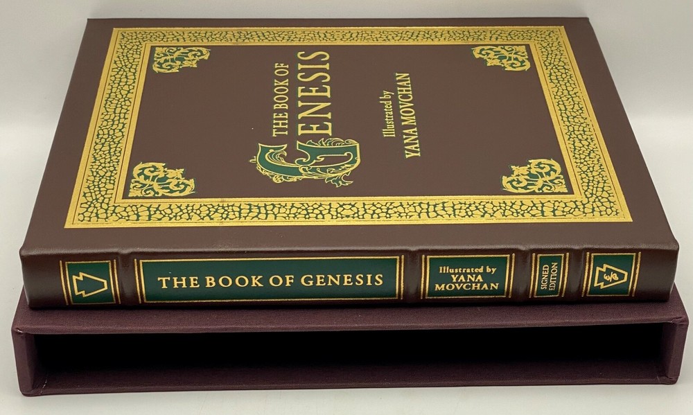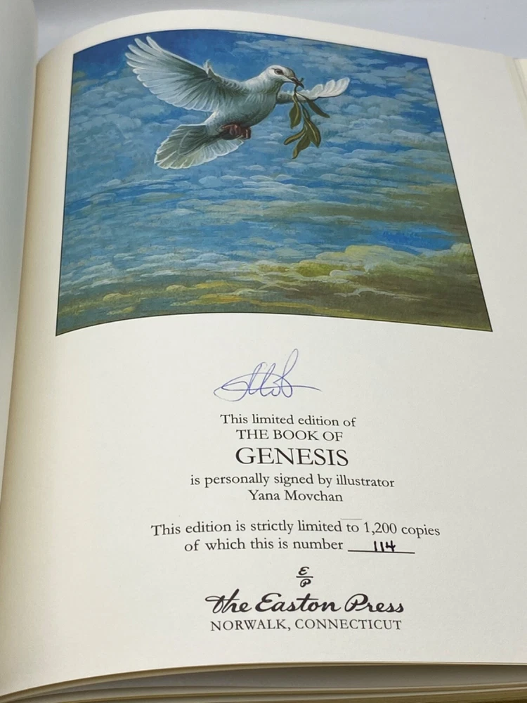 MAKES THE PERFECT GIFT FOR ANY COLLECTOR OF BIBLES / CHRISTIAN LITERATURE / ARTWORK ** PLEASE READ : Mahalo for taking the time to look at our listing. We truly appreciate it. We always do our BEST to give you the most accurate description of these beautiful books. If, however, you have any SPECIFIC questions about the SIZE of the book, NUMBER of pages, TYPE of leather, SMELL or FEEL of the book, PLEASE email us through EBay’s mail system BEFORE you bid, and we will be HAPPY to give you more information. We want you to be completely happy with your purchase and keep you as our customers for years to come!** DESCRIPTION: Easton Press full-leather binding of THE BOOK OF GENESIS SIGNED 🖊, DELUXE HAND-NUMBERED LIMITED EDITION (#114/1200) BY THE ILLUSTRATOR YANA MOVCHAN. EACH FULL COLOR ILLUSTRATION IS PROTECTED BY PARCHMENT PAPER. THIS IS AN HEIRLOOM EASTON WITH LAVISH GILT IMPRESSIONS TO THE BOARDS, SPINE, AND SLIPCASE with INCREDIBLE ARTWORK! IT IS ONE OF THE MOST HIGHLY PRIZED AND MOST BEAUTIFUL EDITIONS OF THIS SACRED TEXT YOU CAN FIND. CERTIFICATE OF AUTHENTICITY IS INCLUDED. 🍍 NOT INCLUDED... 😃 ABOUT THE BOOK: The Book of Genesis (KING JAMES VERSION) is the first book of the Hebrew Bible and the Christian Old Testament. Its Hebrew name is the same as its first word, Bereshit. Genesis is an account of the creation of the world, the early history of humanity, and of Israel's ancestors and the origins of the Jewish people. CONDITION: Book and slipcase are in LIKE NEW condition for with no discernible flaws. There is a small rub to the back of the slipcase, but it appears to have been originally bound like that (SEE PICS FOR FURTHER DETAILS). NO ATTACHED BOOKPLATES, WRITING FROM PREVIOUS OWNER, ETC. It is a SPECTACULAR edition! SHIPPING: FREE TO US ADDRESSES ONLY. INTERNATIONAL $ based on location. WE SHIP PRIORITY MAIL & PACK VERY WELL. Please check out our other listings of Easton Press, Franklin Library, Limited Editions Club, First Edition Library, Heritage Press, International Collectors Library and Folio Society editions. WE DO COMBINE SHIPPING IF YOU PURCHASE MORE THAN ONE COPY. Mahalo for looking at our listings! By bidding/purchasing this item, you are helping a very grateful family who sends you our WARMEST ALOHA & MAHALO!