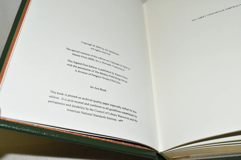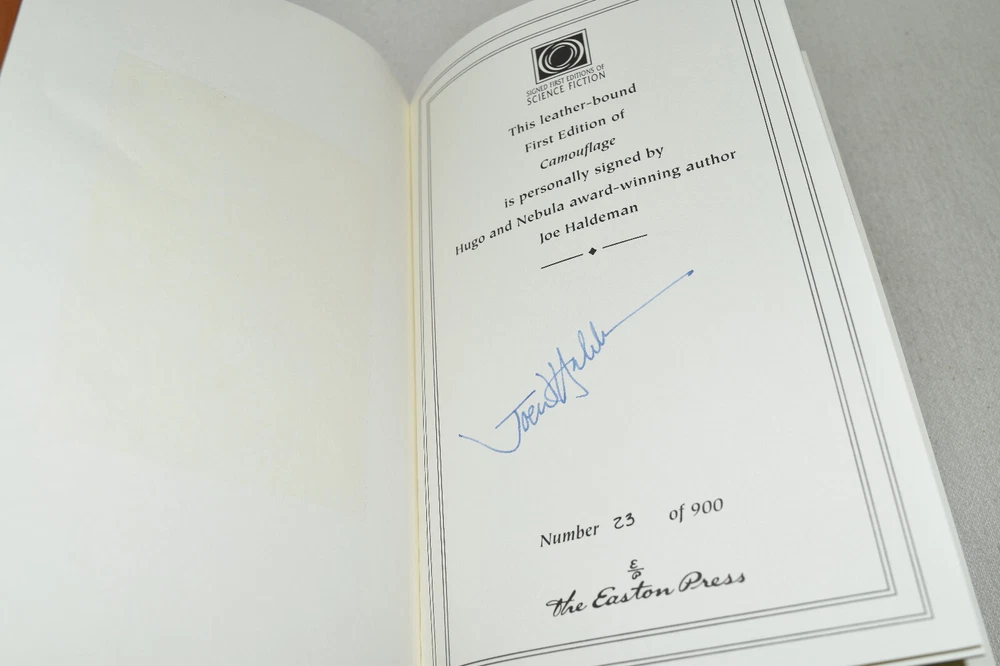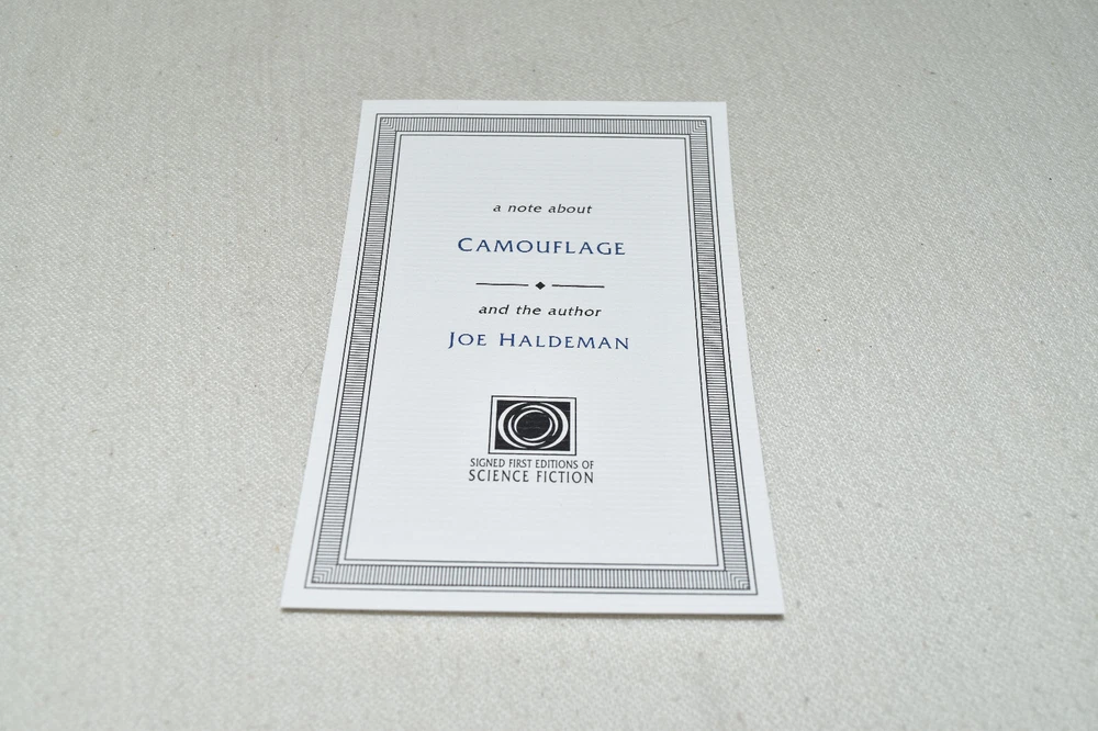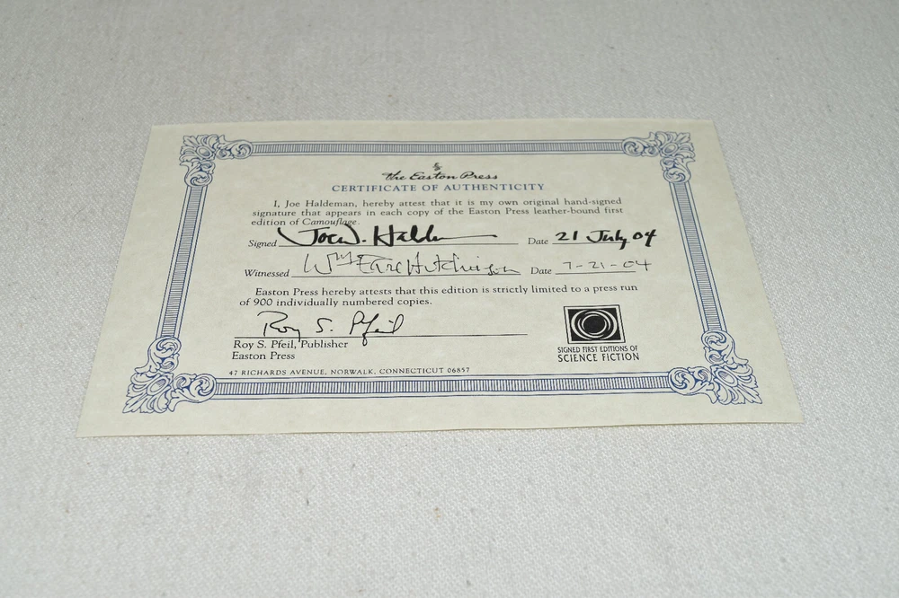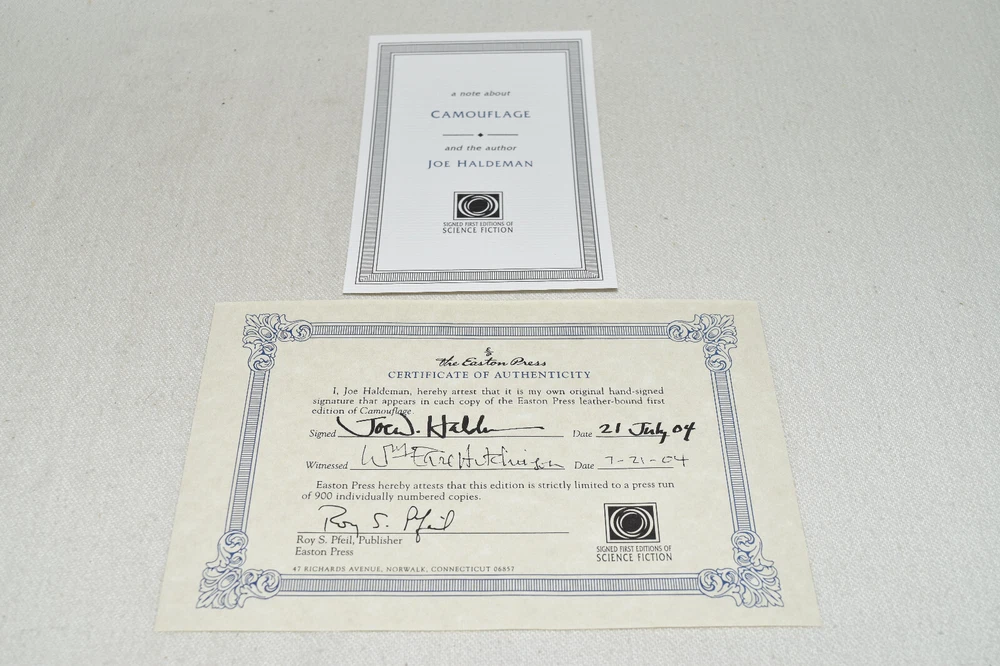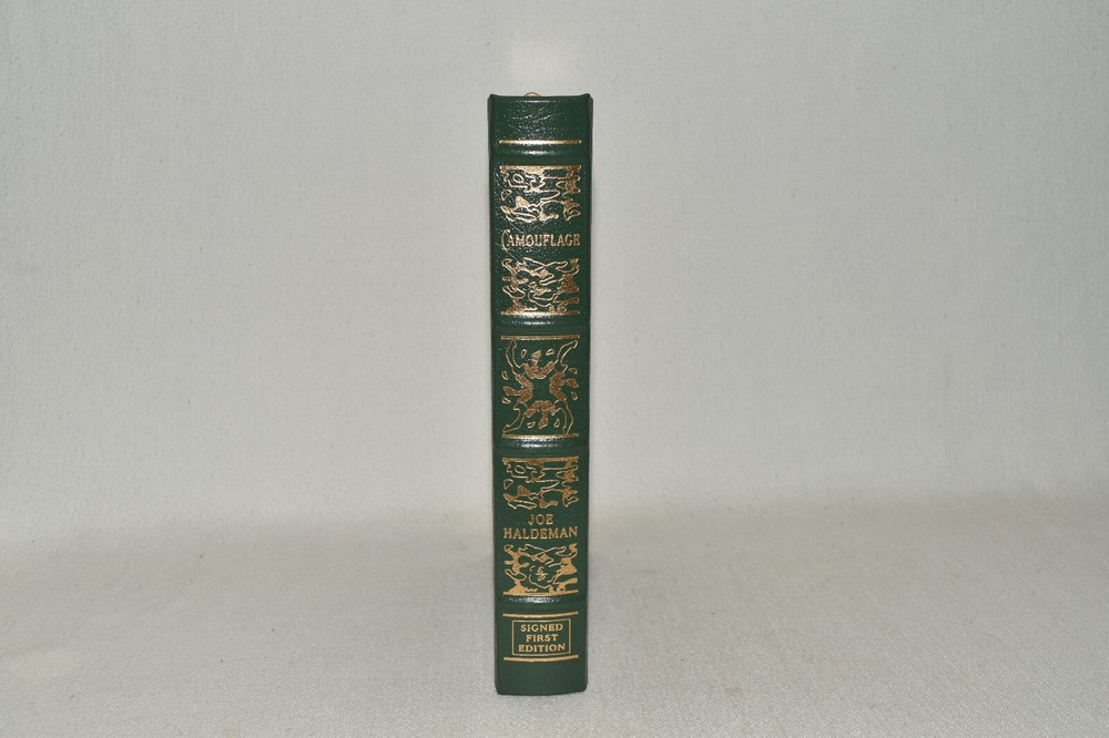 From the Easton Press Signed Collection... Camouflage PERSONALLY SIGNED by Author Joe Haldeman Frontispiece by Patrick Jones Number 23 of 900 Signed Copies Easton Press Signed Edition Copyright 2004 by The Easton Press Bound in Premium Full Leather This Signed Edition contains all of the classic Easton Press trimmings: Premium Leather Silk Moire Endleaves Distinctive Cover Design Hubbed Spine, Accented in Real 22KT Gold Satin Ribbon Page Marker Gilded Page Edges Long-lasting, High Quality Acid-neutral Paper Smyth-sewn Pages for Strength and Durability A very scarce title in any condition, this copy is in Fine condition. The front and back covers are both in terrific condition and the gilded page edges show light wear (see pictures of all sides). There is light residue on the second page. This book is personally signed by the Author and would be a beautiful addition to your Easton Press collection. Hopefully you can add this book to your collection and enjoy it in the years to come... Please Email Me With Any Questions You Might Have! Shipping Info: Buyer to Pay Shipping and Handling International Bidders Pay Extra Shipping Seller Not Responsible For Uninsured Items Lost or Damaged in Mail Forms of Payment Accepted: Paypal Good luck and happy bidding! Powered by eBay Turbo Lister The free listing tool. List your items fast and easy and manage your active items.