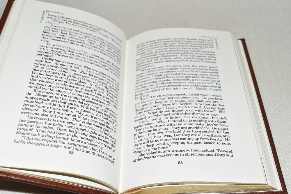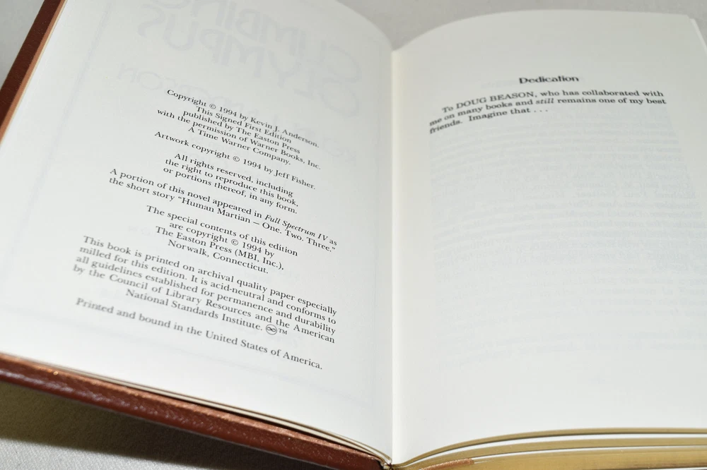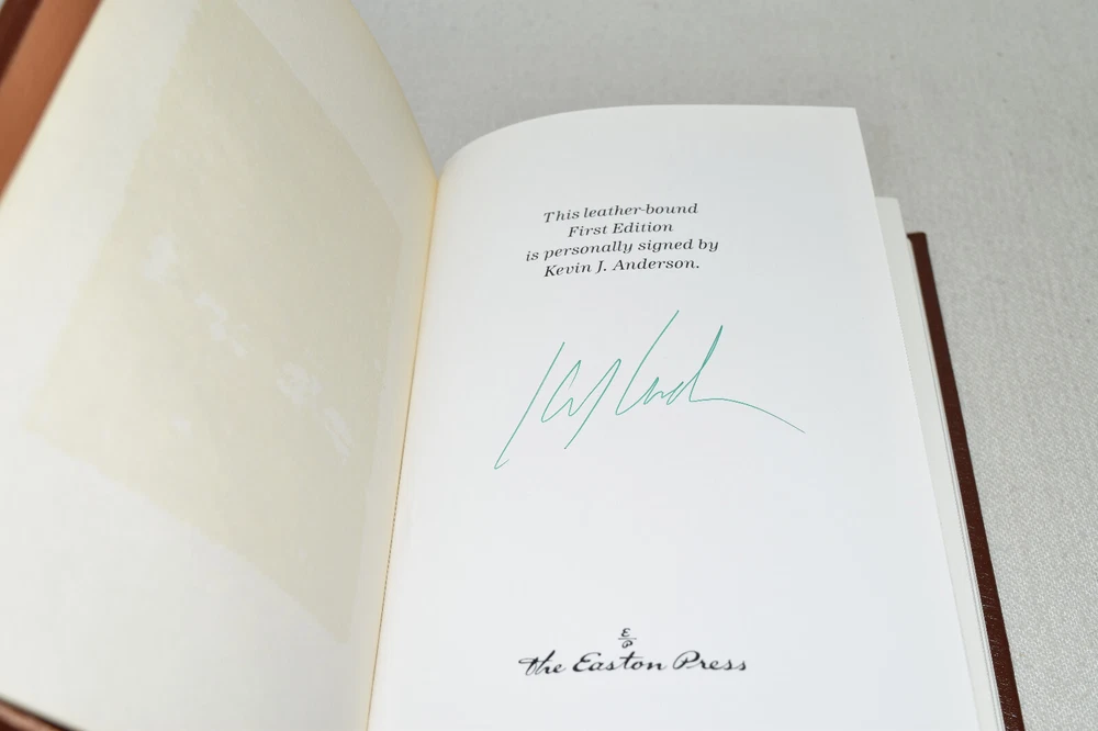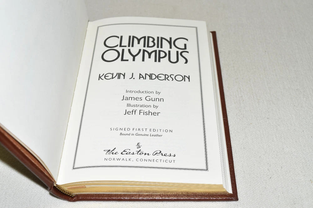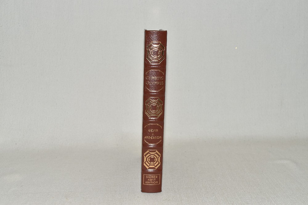 From the Easton Press Signed Collection... Climbing Olympus PERSONALLY SIGNED by Author Kevin J. Anderson Introduction by James Gunn Artwork by Jeff Fisher Easton Press Signed Edition Copyright 1994 by The Easton Press Bound in Premium Full Leather This Signed Edition contains all of the classic Easton Press trimmings: Premium Leather Silk Moire Endleaves Distinctive Cover Design Hubbed Spine, Accented in Real 22KT Gold Satin Ribbon Page Marker Gilded Page Edges Long-lasting, High Quality Acid-neutral Paper Smyth-sewn Pages for Strength and Durability A very scarce title in any condition, this copy is in Fine condition. The front and back covers are both in terrific condition and the gilded page edges show only faint wear (see pictures). There is minor residue inside the second page. This book is personally signed by the Author. It would be a beautiful addition to your Easton Press collection. Overall, this copy is a grade collector's book. This book is very elusive in this superior condition, as only a limited number of them were ever published, so now is the time to act. Hopefully you can add this book to your collection and enjoy it in the years to come... Please Email Me With Any Questions You Might Have! Shipping Info: Buyer to Pay Shipping and Handling International Bidders Pay Extra Shipping Seller Not Responsible For Uninsured Items Lost or Damaged in Mail Forms of Payment Accepted: Paypal Good luck and happy bidding! Powered by eBay Turbo Lister The free listing tool. List your items fast and easy and manage your active items.