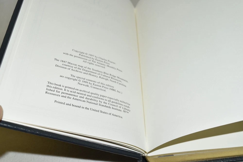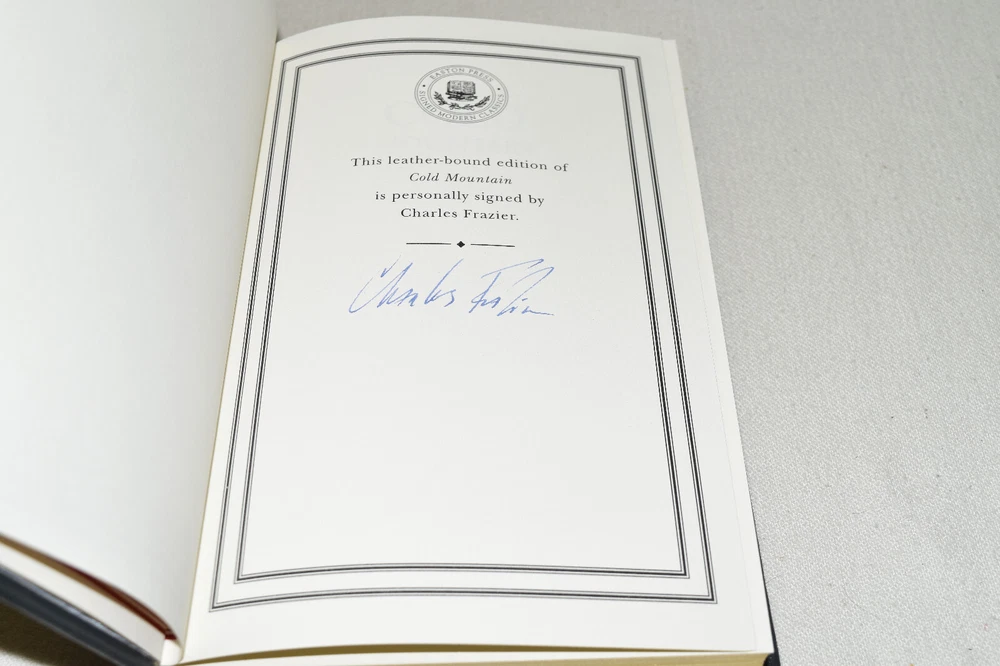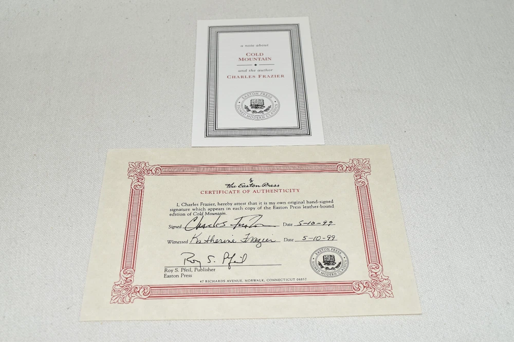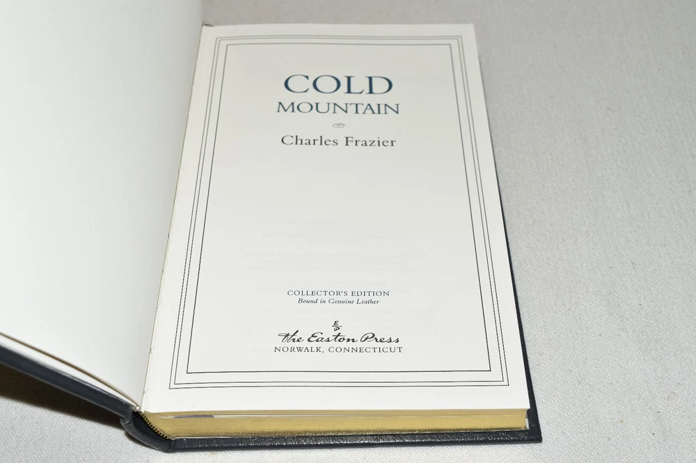 From the Easton Press Collection... Cold Mountain Personally Signed by Charles Frazier Collector's Edition Copyright 1999 by The Easton Press Bound in Premium Full Leather This volume contains all of the classic Easton Press trimmings: Premium Leather Decorated Endleaves Distinctive Cover Design Hubbed Spine, Accented in Real 22KT Gold Satin Ribbon Page Marker Gilded Page Edges Long-lasting, High Quality Acid-neutral Paper Smyth-sewn Pages for Strength and Durability Beautiful Illustrations A very scarce title in any condition, this Easton Press Limited Edition is in Fine condition. The front and back covers are both in terrific condition and the gilded page edges show hardly any wear (see pictures of all gilt sides). There are no markings, bookplates, or other signs of prior ownership in this book. This book was published by Easton Press and is Signed by the Author. It comes with a Certificate of Authenticity and Collector's Notes and would be a beautiful addition to your Easton Press collection. Overall, this copy is a grade collector's book. This book is very elusive in this superior condition, as only a limited number of them were ever published, so now is the time to act. Hopefully you can add this book to your collection and enjoy it in the years to come... Please Email Me With Any Questions You Might Have! Shipping Info: Buyer to Pay Shipping and Handling International Bidders Pay Extra Shipping Seller Not Responsible For Uninsured Items Lost or Damaged in Mail Good luck and happy bidding!
