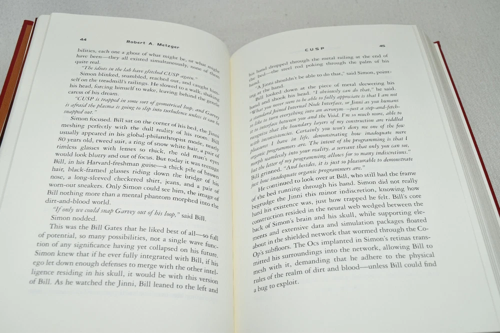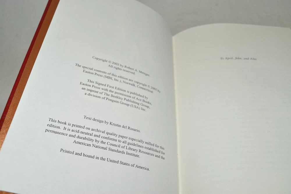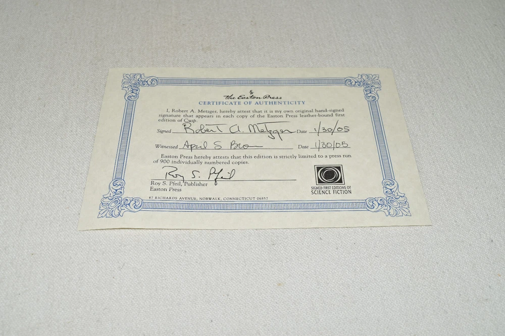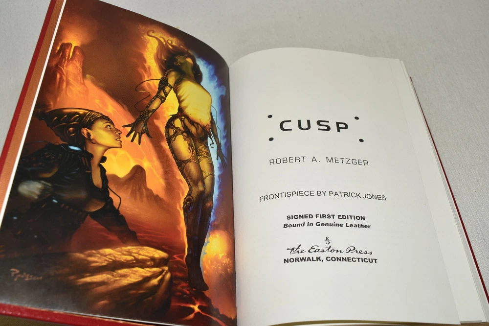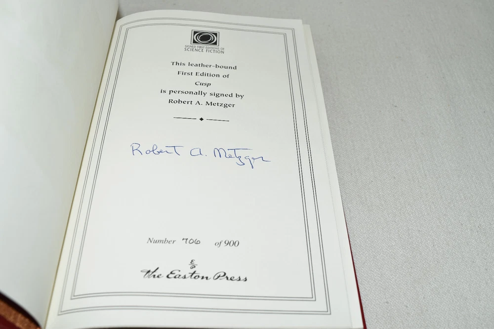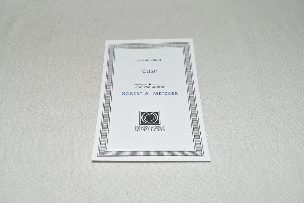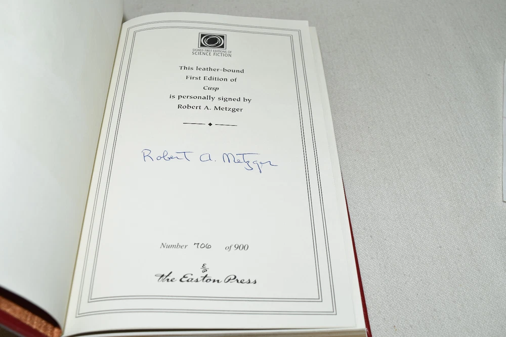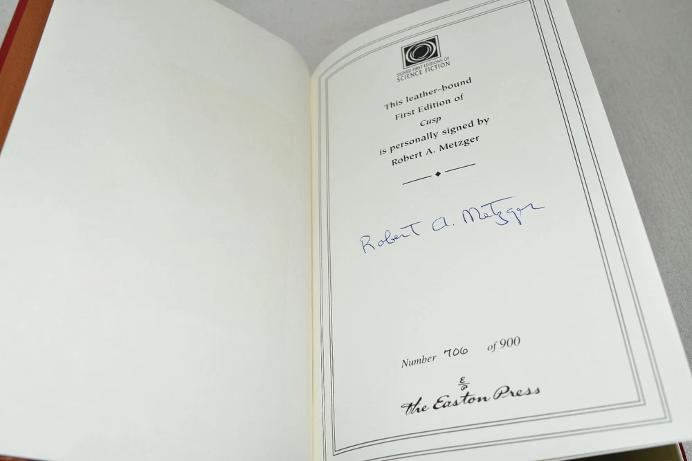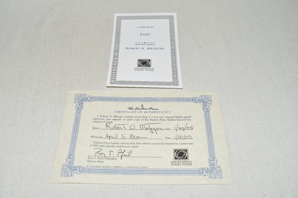 From the Easton Press Signed Collection... Cusp PERSONALLY SIGNED by Author Robert Metzger Frontispiece by Patrick Jones Number 706 of 900 Signed Copies Easton Press Signed Edition Copyright 1995 by The Easton Press Bound in Premium Full Leather This Signed Edition contains all of the classic Easton Press trimmings: Premium Leather Silk Moire Endleaves Distinctive Cover Design Hubbed Spine, Accented in Real 22KT Gold Satin Ribbon Page Marker Gilded Page Edges Long-lasting, High Quality Acid-neutral Paper Smyth-sewn Pages for Strength and Durability A very scarce title in any condition, this copy is in Fine condition. The front and back covers are both in terrific condition and the gilded page edges show only faint wear (see pictures of all sides). There is faint residue on the second page. This book is personally signed by the Author and comes complete with Collector's Notes and a Certificate of Authenticity. It would be a beautiful addition to your Easton Press collection. Hopefully you can add this book to your collection and enjoy it in the years to come... Please Email Me With Any Questions You Might Have! Shipping Info: Buyer to Pay Shipping and Handling International Bidders Pay Extra Shipping Seller Not Responsible For Uninsured Items Lost or Damaged in Mail Forms of Payment Accepted: Paypal Good luck and happy bidding! Powered by eBay Turbo Lister The free listing tool. List your items fast and easy and manage your active items.