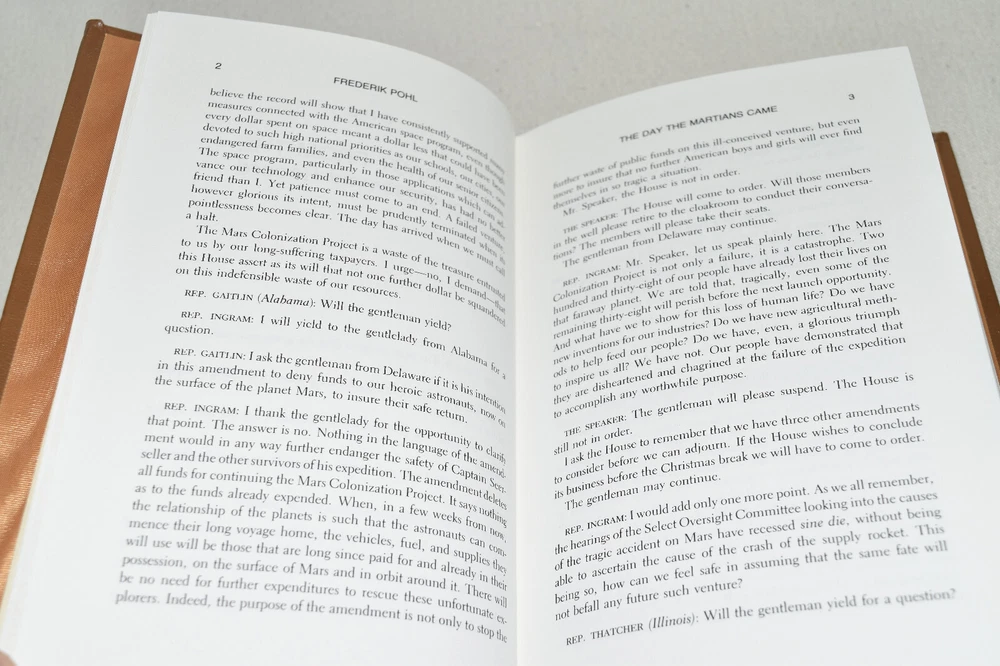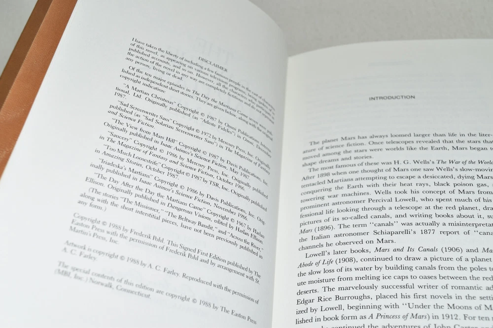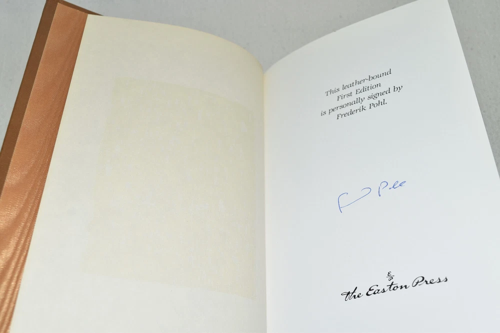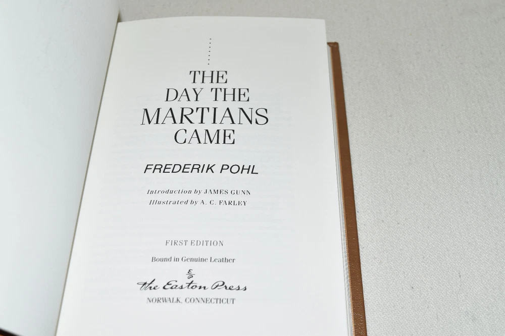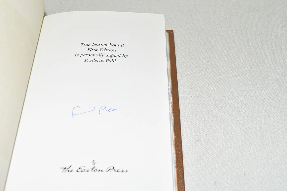 From the Easton Press Signed Collection... The Day the Martians Came PERSONALLY SIGNED by Frederik Pohl Introduction by James Gunn Illustrated by A. C. Farley Easton Press Signed Edition Copyright 1988 by The Easton Press Bound in Premium Full Leather This Signed Edition contains all of the classic Easton Press trimmings: Premium Leather Silk Moire Endleaves Distinctive Cover Design Hubbed Spine, Accented in Real 22KT Gold Satin Ribbon Page Marker Gilded Page Edges Long-lasting, High Quality Acid-neutral Paper Smyth-sewn Pages for Strength and Durability A very scarce title in any condition, this copy is in Fine condition. The front and back covers are both in near perfect condition and the gilded page edges show minor wear on the top edge (see pictures of all sides). There is light residue on the second page. This book is personally signed by the Author and would be a beautiful addition to your Easton Press collection. Hopefully you can add this book to your collection and enjoy it in the years to come... Please Email Me With Any Questions You Might Have! Shipping Info: Buyer to Pay Shipping and Handling International Bidders Pay Extra Shipping Seller Not Responsible For Uninsured Items Lost or Damaged in Mail Forms of Payment Accepted: Paypal Good luck and happy bidding! Powered by eBay Turbo Lister The free listing tool. List your items fast and easy and manage your active items.