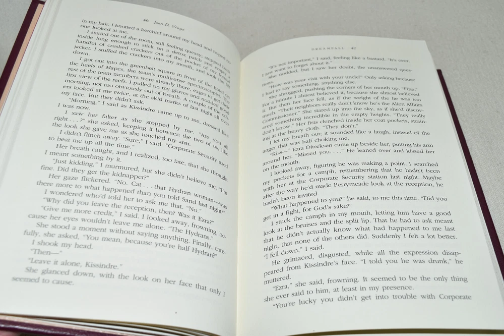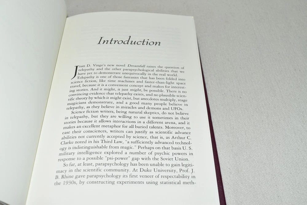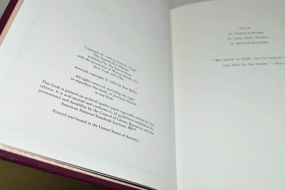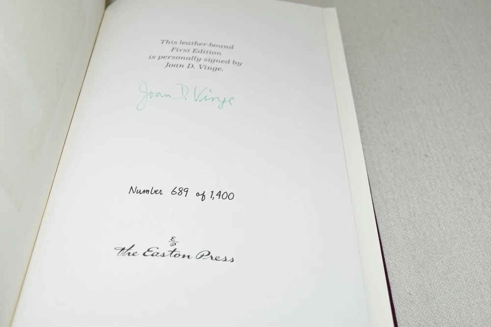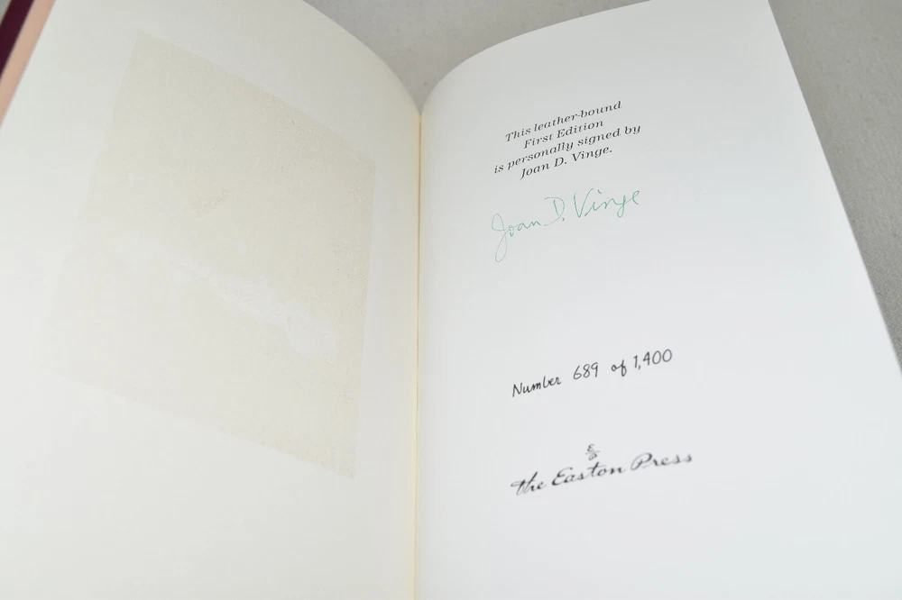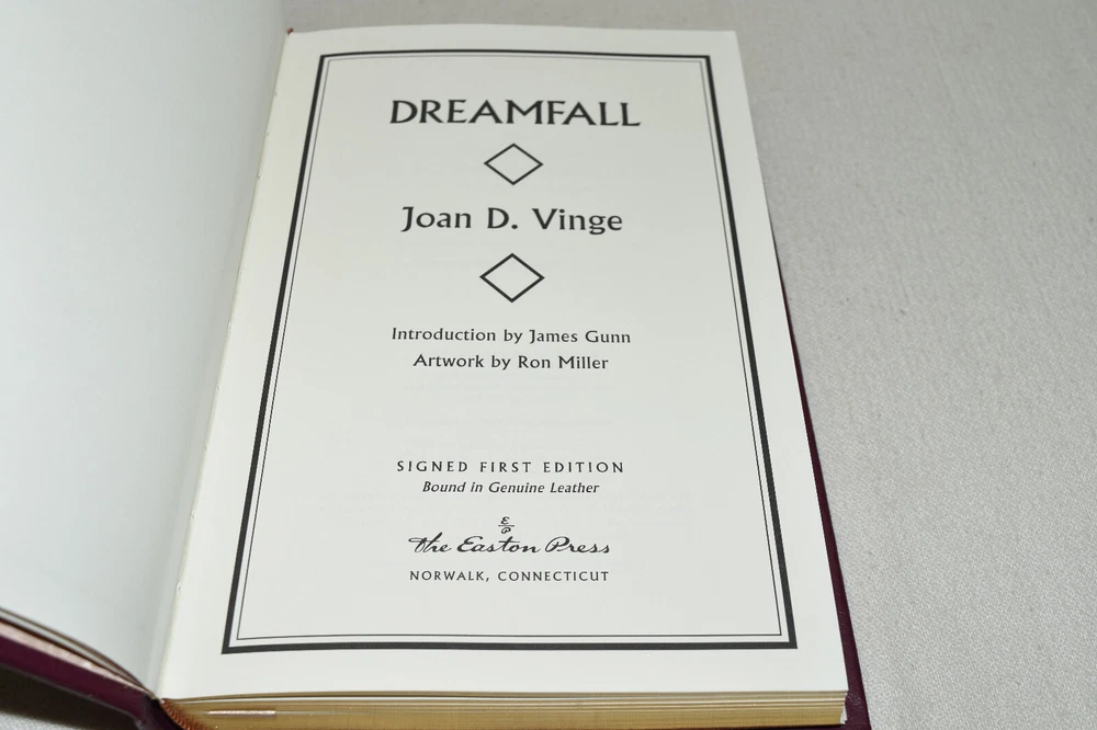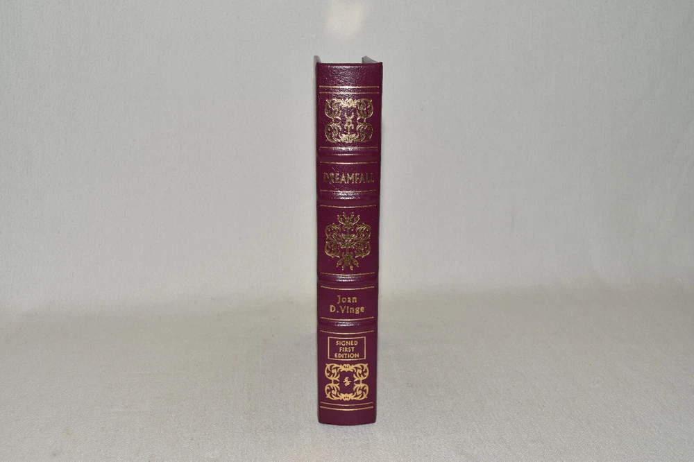 From the Easton Press Signed First Edition Collection... Dreamfall by Joan D. Vinge Illustrated by Ron Miller Introduction by James Gunn Collector's Edition Copyright 1996 by The Easton Press Bound in Premium Full Leather This volume contains all of the classic Easton Press trimmings: Premium Leather Silk Moire Endleaves Distinctive Cover Design Hubbed Spine, Accented in Real 22KT Gold Satin Ribbon Page Marker Gilded Page Edges Long-lasting, High Quality Acid-neutral Paper Smyth-sewn Pages for Strength and Durability Beautiful Illustrations A very scarce title in any condition, this Easton Press Signed First Edition is in Fine condition! The front and back covers are both in terrific condition and the gilded page edges show only minor wear (see pictures of all sides of gilt). There is faint residue on the second page. This book is part of the Signed First Editions Collection published by Easton Press. It is Personally Signed by the Author and would be a beautiful addition to your Easton Press collection. Please Email Me With Any Questions You Might Have! Shipping Info: Buyer to Pay Shipping and Handling International Bidders Pay Extra Shipping Seller Not Responsible For Uninsured Items Lost or Damaged in Mail Forms of Payment Accepted: Paypal Good luck and happy bidding! Powered by eBay Turbo Lister The free listing tool. List your items fast and easy and manage your active items.