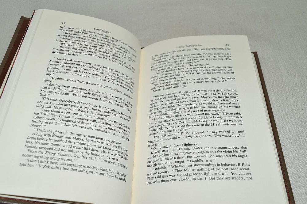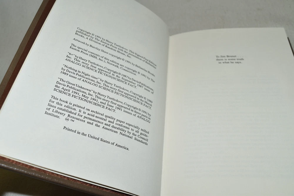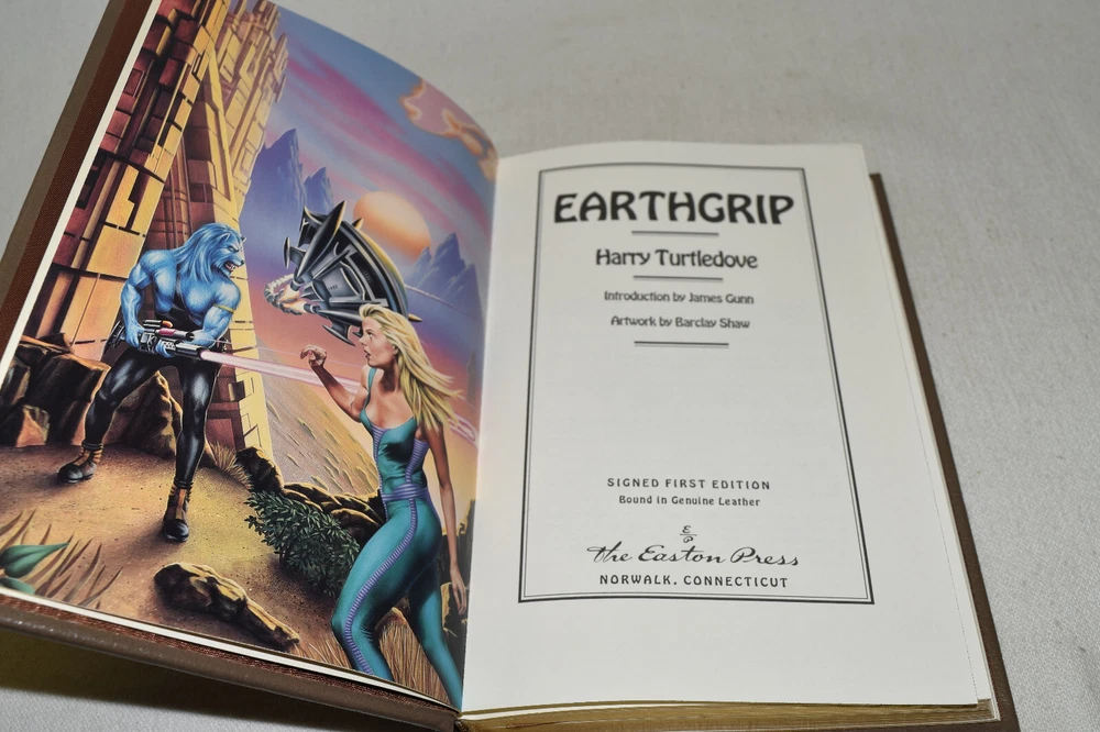 From the Easton Press Signed Collection... Earthgrip PERSONALLY SIGNED by Harry Turtledove Introduction by James Gunn Illustrated by Barclay Shaw Easton Press Signed Edition Copyright 1991 by The Easton Press Bound in Premium Full Leather This Signed Edition contains all of the classic Easton Press trimmings: Premium Leather Silk Moire Endleaves Distinctive Cover Design Hubbed Spine, Accented in Real 22KT Gold Satin Ribbon Page Marker Gilded Page Edges Long-lasting, High Quality Acid-neutral Paper Smyth-sewn Pages for Strength and Durability A very scarce title in any condition, this copy is in Fine condition. The front and back covers are both in terrific condition and the gilded page edges show minor wear (see pictures of all sides). There is light residue on the second page. This book is personally signed by the Author and would be a beautiful addition to your Easton Press collection. Hopefully you can add this book to your collection and enjoy it in the years to come... Please Email Me With Any Questions You Might Have! Shipping Info: Buyer to Pay Shipping and Handling International Bidders Pay Extra Shipping Seller Not Responsible For Uninsured Items Lost or Damaged in Mail Forms of Payment Accepted: Paypal Good luck and happy bidding! Powered by eBay Turbo Lister The free listing tool. List your items fast and easy and manage your active items.