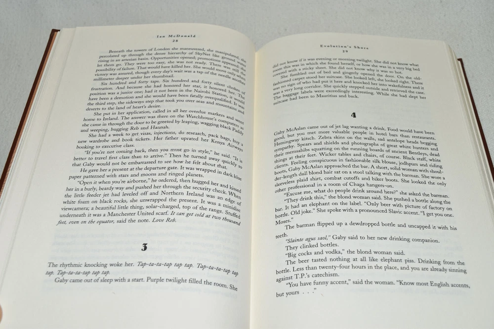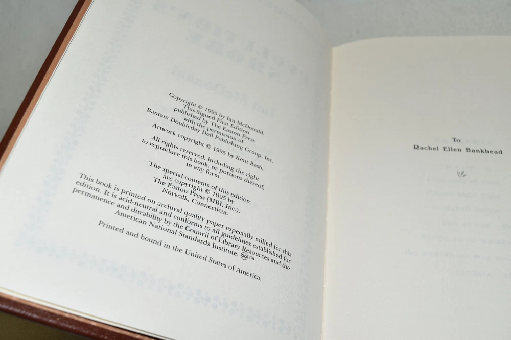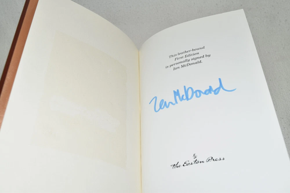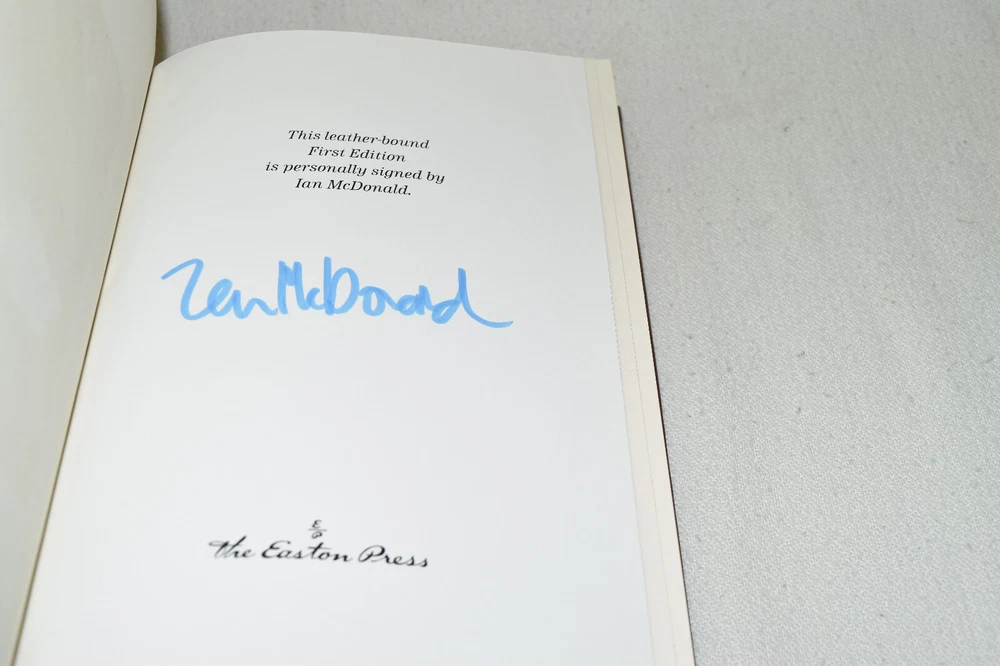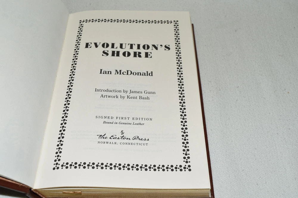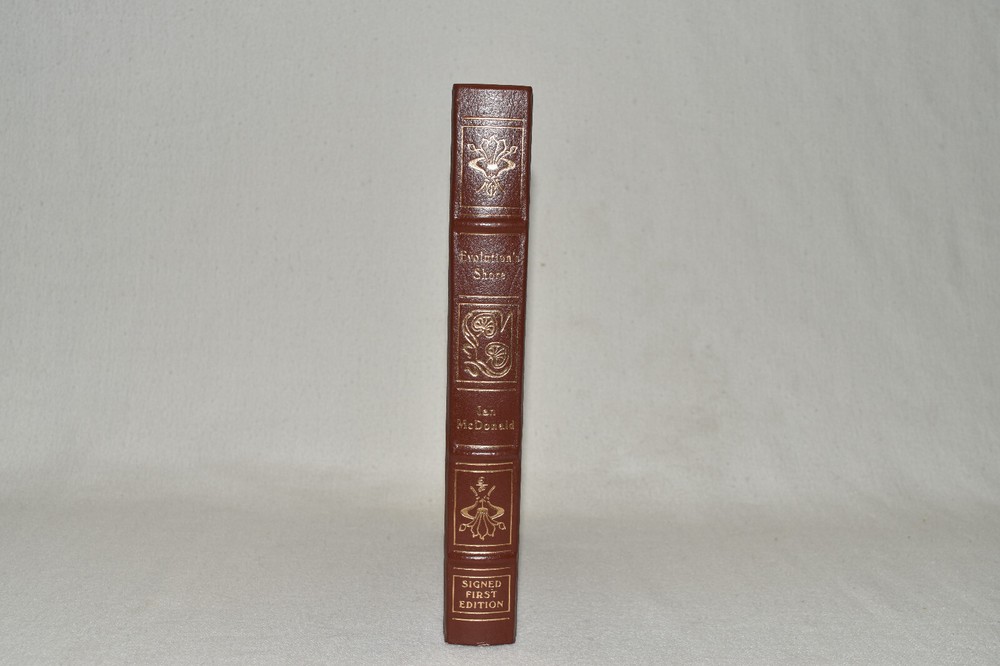 From the Easton Press Signed Collection... Evolution's Shore PERSONALLY SIGNED by Author Ian McDonald Introduction by James Gunn Frontispiece by Kent Bash Easton Press Signed Edition Copyright 1995 by The Easton Press Bound in Premium Full Leather This Signed Edition contains all of the classic Easton Press trimmings: Premium Leather Silk Moire Endleaves Distinctive Cover Design Hubbed Spine, Accented in Real 22KT Gold Satin Ribbon Page Marker Gilded Page Edges Long-lasting, High Quality Acid-neutral Paper Smyth-sewn Pages for Strength and Durability A very scarce title in any condition, this copy is in Fine condition. The front and back covers are both in terrific condition and the gilded page edges show minor wear (see pictures). There is faint residue on the second page. This book is personally signed by the Author and would be a beautiful addition to your Easton Press collection. Hopefully you can add this book to your collection and enjoy it in the years to come... Please Email Me With Any Questions You Might Have! Shipping Info: Buyer to Pay Shipping and Handling International Bidders Pay Extra Shipping Seller Not Responsible For Uninsured Items Lost or Damaged in Mail Forms of Payment Accepted: Paypal Good luck and happy bidding! Powered by eBay Turbo Lister The free listing tool. List your items fast and easy and manage your active items.