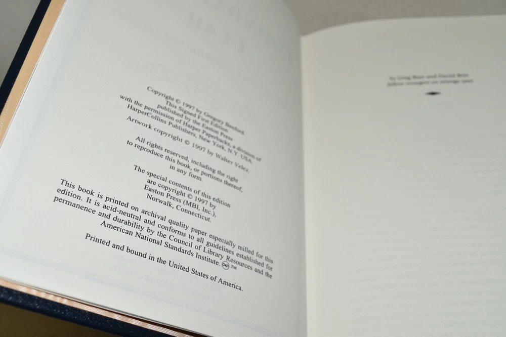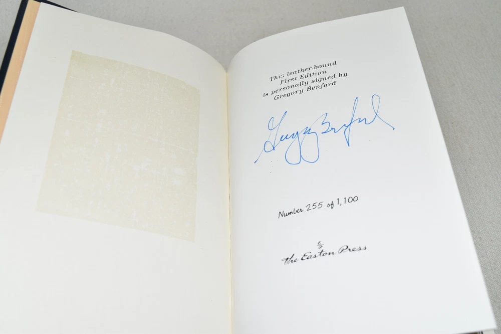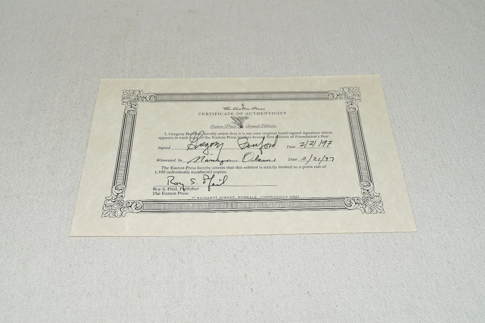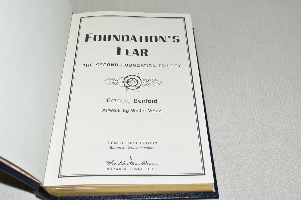 From the Easton Press Signed Collection... Foundation's Fear The Second Foundation Trilogy PERSONALLY SIGNED by Gregory Benford Artwork by Walter Velez Number 225 of 1,100 Signed Copies Easton Press Signed Edition Copyright 1997 by The Easton Press Bound in Premium Full Leather This Signed Edition contains all of the classic Easton Press trimmings: Premium Leather Silk Moire Endleaves Distinctive Cover Design Hubbed Spine, Accented in Real 22KT Gold Satin Ribbon Page Marker Gilded Page Edges Long-lasting, High Quality Acid-neutral Paper Smyth-sewn Pages for Strength and Durability A very scarce title in any condition, this copy is in Fine condition. The front and back covers are both in terrific condition and the gilded page edges show minor wear (see pictures of all sides). There is light residue to the second page. This book is personally signed by the Author and comes complete with a Certificate of Authenticity. It would be a beautiful addition to your Easton Press collection. Hopefully you can add this book to your collection and enjoy it in the years to come... Please Email Me With Any Questions You Might Have! Shipping Info: Buyer to Pay Shipping and Handling International Bidders Pay Extra Shipping Seller Not Responsible For Uninsured Items Lost or Damaged in Mail Forms of Payment Accepted: Paypal Good luck and happy bidding! Powered by eBay Turbo Lister The free listing tool. List your items fast and easy and manage your active items.
