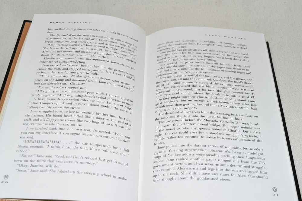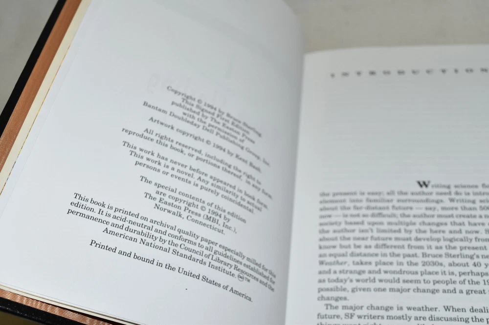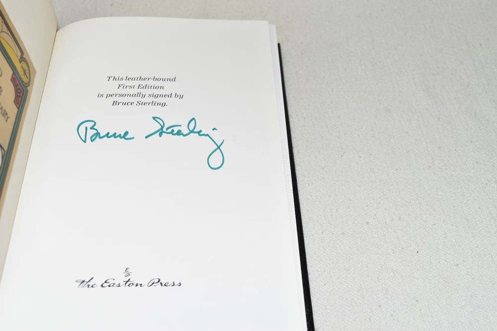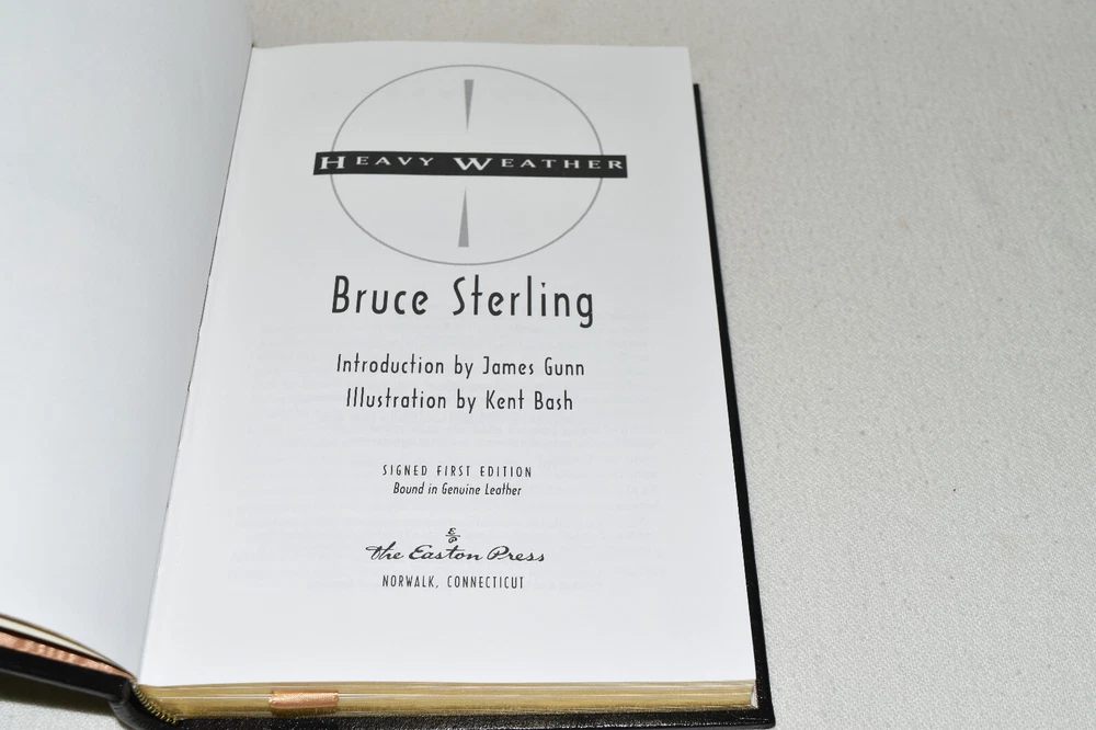 From the Easton Press Signed Collection... Heavy Weather PERSONALLY SIGNED by Bruce Sterling Introduction by James Gunn Illustrated by Kent Bash Easton Press Signed Edition Copyright 1994 by The Easton Press Bound in Premium Full Leather This Signed Edition contains all of the classic Easton Press trimmings: Premium Leather Silk Moire Endleaves Distinctive Cover Design Hubbed Spine, Accented in Real 22KT Gold Satin Ribbon Page Marker Gilded Page Edges Long-lasting, High Quality Acid-neutral Paper Smyth-sewn Pages for Strength and Durability A very scarce title in any condition, this copy is in Fine condition. The front and back covers are both in near perfect condition and the gilded page edges show hardly any wear (see pictures of all sides). There is a blank bookplate affixed on the second page. This book is personally signed by the Author and would be a beautiful addition to your Easton Press collection. Hopefully you can add this book to your collection and enjoy it in the years to come... Please Email Me With Any Questions You Might Have! Shipping Info: Buyer to Pay Shipping and Handling International Bidders Pay Extra Shipping Seller Not Responsible For Uninsured Items Lost or Damaged in Mail Forms of Payment Accepted: Paypal Good luck and happy bidding! Powered by eBay Turbo Lister The free listing tool. List your items fast and easy and manage your active items.