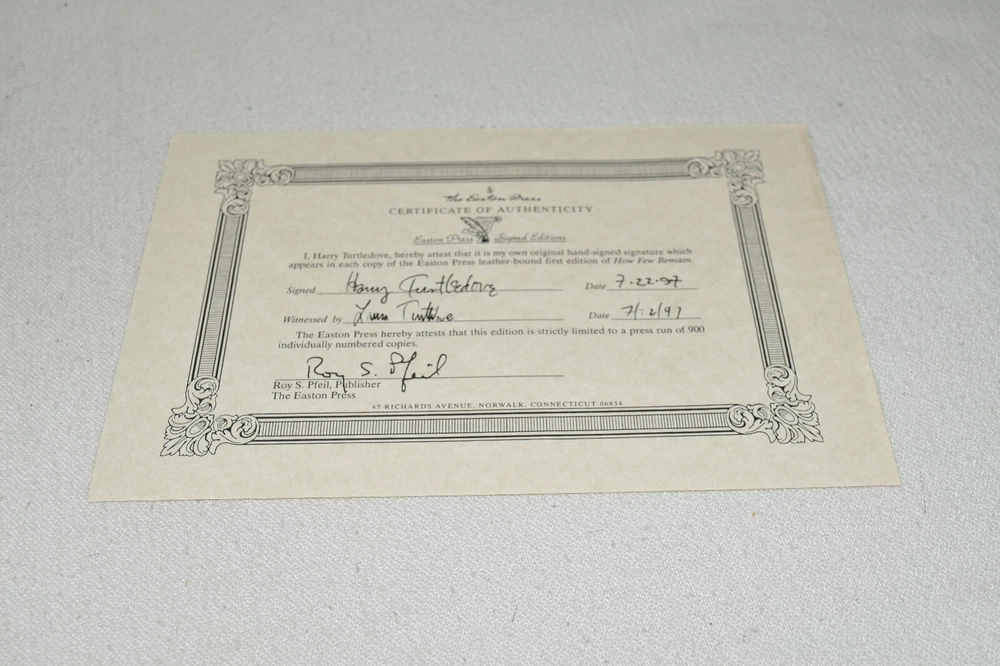From the Easton Press Signed Collection... How Few Remain PERSONALLY SIGNED by Author Harry Turtledove Introduction by Gregory Benford Illustrated by Pat Morrisey Easton Press Signed Edition Copyright 1997 by The Easton Press Number 833 of 900 Signed Copies Bound in Premium Full Leather This Signed Edition contains all of the classic Easton Press trimmings: Premium Leather Silk Moire Endleaves Distinctive Cover Design Hubbed Spine, Accented in Real 22KT Gold Satin Ribbon Page Marker Gilded Page Edges Long-lasting, High Quality Acid-neutral Paper Smyth-sewn Pages for Strength and Durability A very scarce title in any condition, this copy is in Fine condition. The front and back covers are both in terrific condition and the gilded page edges show only minor wear (see pictures of all sides). There is faint residue on the second page. This book is personally signed by the Author. It comes complete with a Certificate of Authenticity and would be a beautiful addition to your Easton Press collection. Overall, this copy is a grade collector's book. This book is very elusive in this superior condition, as only a limited number of them were ever published, so now is the time to act. Hopefully you can add this book to your collection and enjoy it in the years to come... Please Email Me With Any Questions You Might Have! Shipping Info: Buyer to Pay Shipping and Handling International Bidders Pay Extra Shipping Seller Not Responsible For Uninsured Items Lost or Damaged in Mail Forms of Payment Accepted: Paypal Good luck and happy bidding! Powered by eBay Turbo Lister The free listing tool. List your items fast and easy and manage your active items.