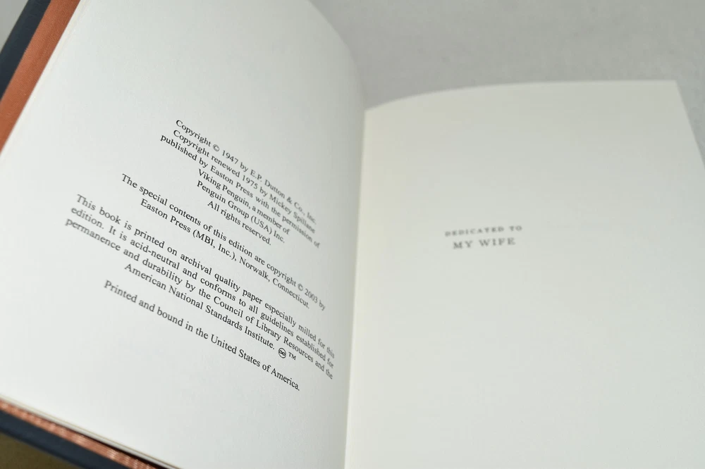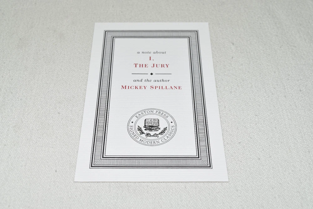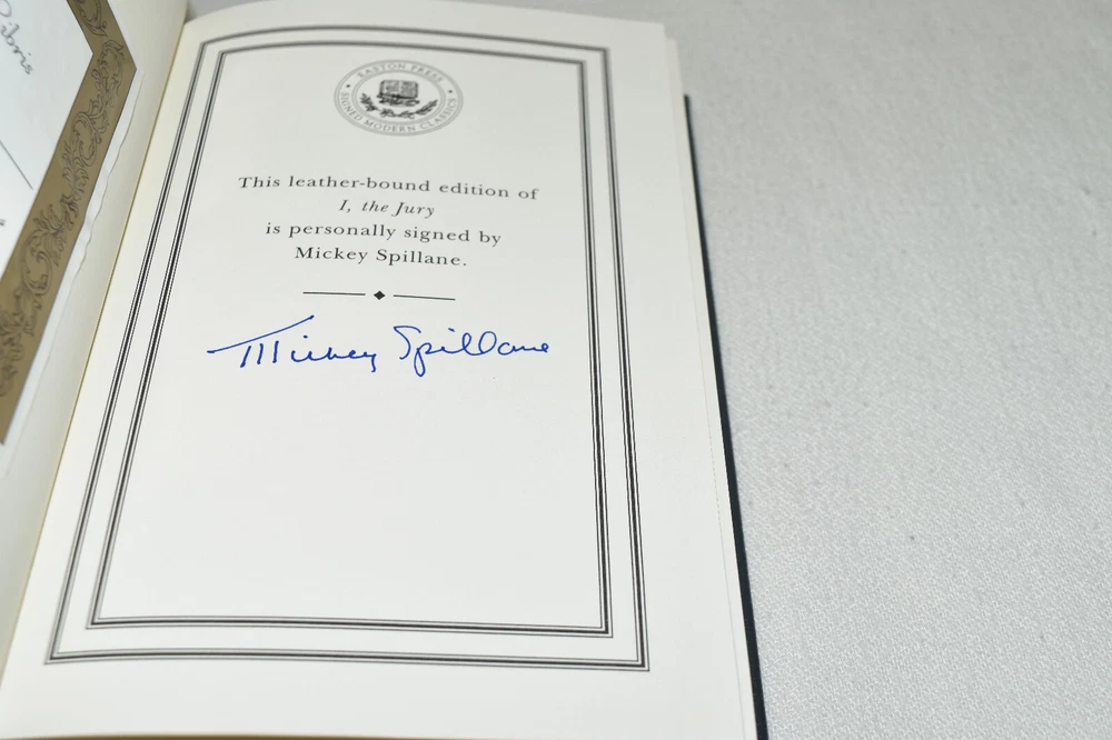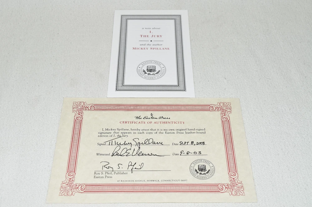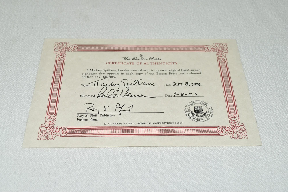 From the Easton Press Signed Editions Collection... I, The Jury PERSONALLY SIGNED by Author Mickey Spillane Easton Press Signed Edition Copyright 2003 by The Easton Press Bound in Premium Full Leather This Signed Edition contains all of the classic Easton Press trimmings: Premium Leather Silk Moire Endleaves Distinctive Cover Design Hubbed Spine, Accented in Real 22KT Gold Satin Ribbon Page Marker Gilded Page Edges Long-lasting, High Quality Acid-neutral Paper Smyth-sewn Pages for Strength and Durability A very scarce title in any condition, this copy is in Fine and Unread condition. The front and back covers are both in near perfect condition and the gilded page edges show hardly any wear! There is a blank bookplate affixed to the second page. This book is personally signed by Mickey Spillane. It comes with a Certificate of Authenticity and Collector's Notes and would be a beautiful addition to your Easton Press collection. Overall, this copy is a grade collector's book. This book is very elusive in this superior condition, as only a limited number of them were ever published, so now is the time to act. Hopefully you can add this book to your collection and enjoy it in the years to come... Please Email Me With Any Questions You Might Have! Shipping Info: Buyer to Pay Shipping and Handling International Bidders Pay Extra Shipping Seller Not Responsible For Uninsured Items Lost or Damaged in Mail Forms of Payment Accepted: Paypal Good luck and happy bidding! Powered by eBay Turbo Lister The free listing tool. List your items fast and easy and manage your active items.