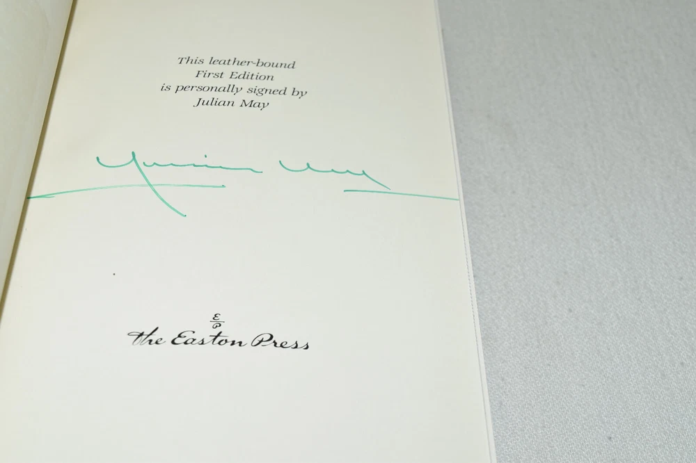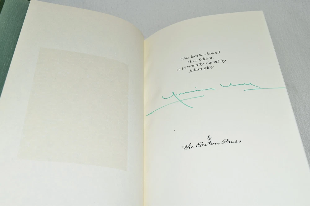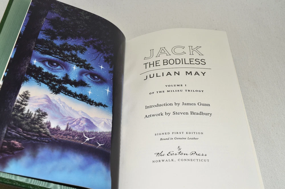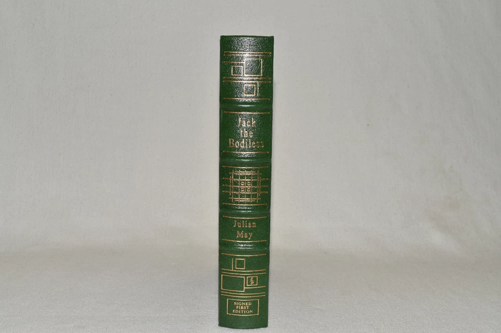 From the Easton Press Signed Collection... Jack the Bodiless Volume 1 of The Milieu Trilogy PERSONALLY SIGNED by Julian May Introduction by James Gunn Illustrated by Stephen Bradbury Easton Press Signed Edition Copyright 1991 by The Easton Press Bound in Premium Full Leather This Signed Edition contains all of the classic Easton Press trimmings: Premium Leather Silk Moire Endleaves Distinctive Cover Design Hubbed Spine, Accented in Real 22KT Gold Satin Ribbon Page Marker Gilded Page Edges Long-lasting, High Quality Acid-neutral Paper Smyth-sewn Pages for Strength and Durability A very scarce title in any condition, this copy is in Fine condition. The front and back covers are both in near perfect condition and the gilded page edges show hardly any wear (see pictures of all sides). There is faint residue on the second page. This book is personally signed by the Author and would be a beautiful addition to your Easton Press collection. Hopefully you can add this book to your collection and enjoy it in the years to come... Please Email Me With Any Questions You Might Have! Shipping Info: Buyer to Pay Shipping and Handling International Bidders Pay Extra Shipping Seller Not Responsible For Uninsured Items Lost or Damaged in Mail Forms of Payment Accepted: Paypal Good luck and happy bidding! Powered by eBay Turbo Lister The free listing tool. List your items fast and easy and manage your active items.
