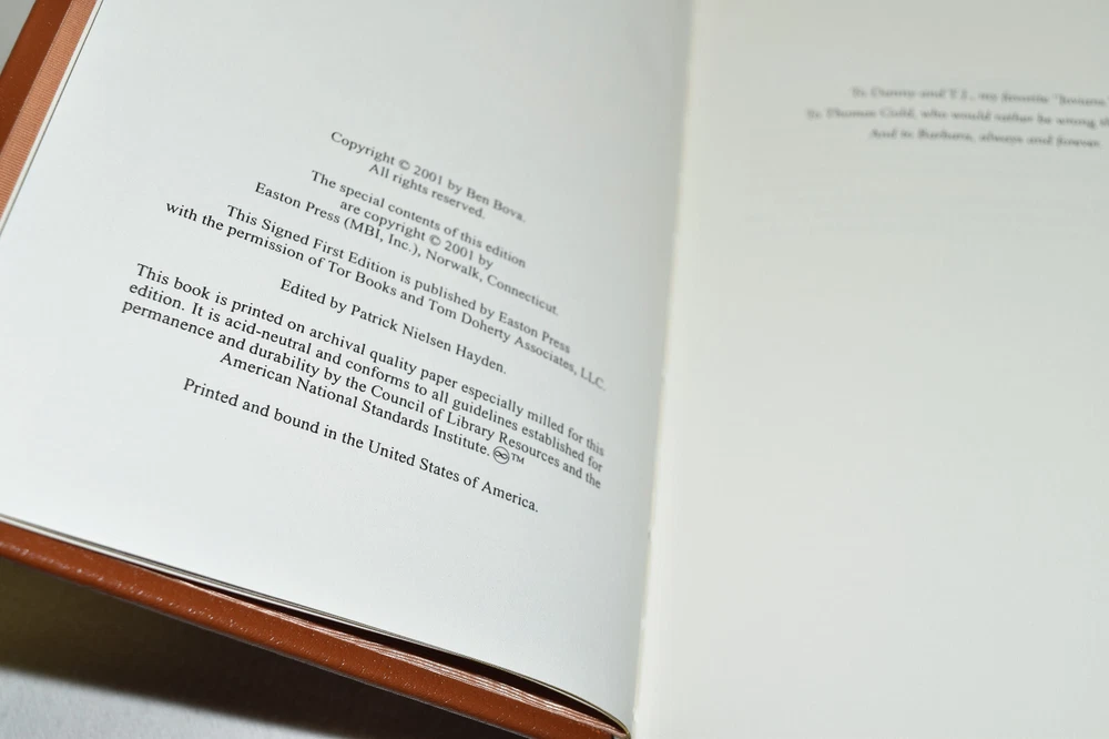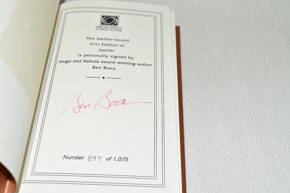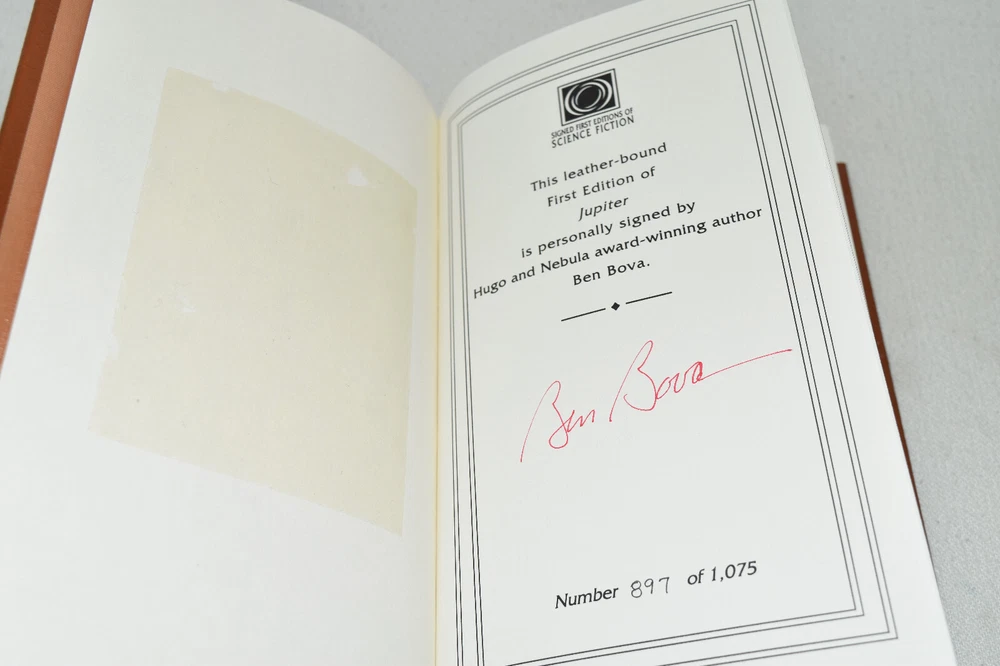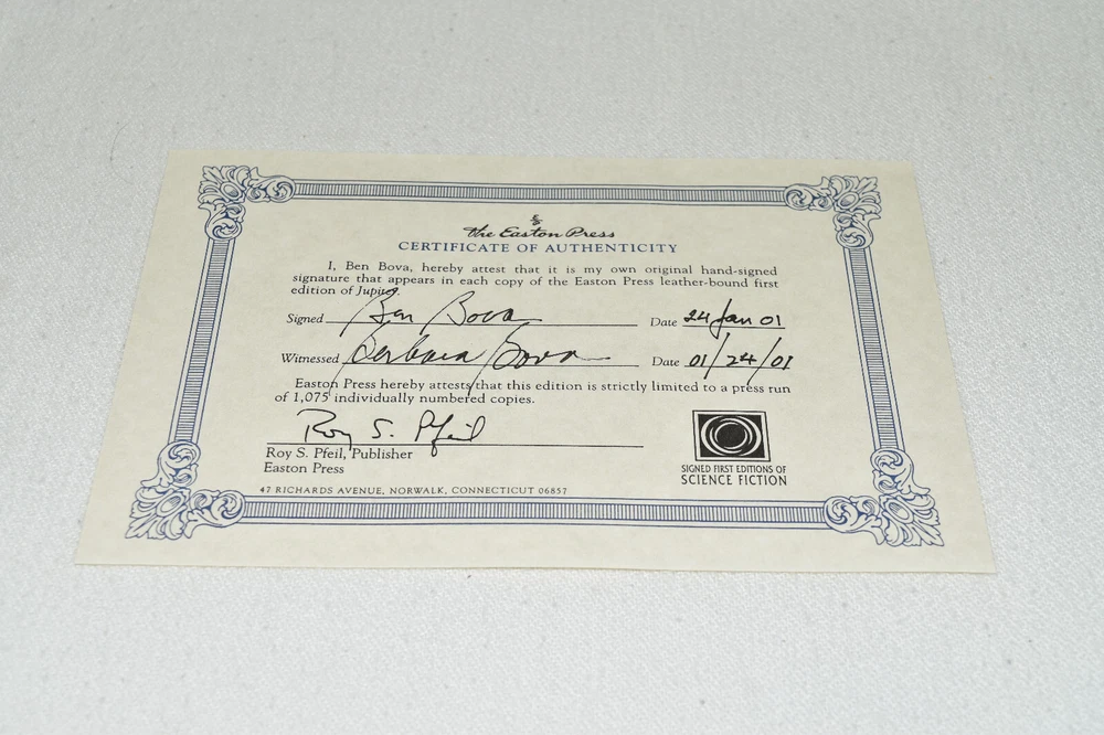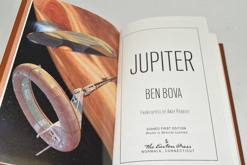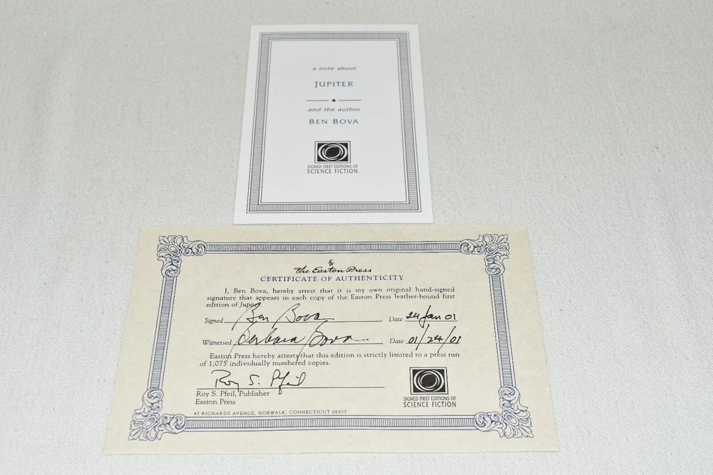 From the Easton Press Signed Collection... Jupiter PERSONALLY SIGNED by Ben Bova Illustrated by Andy Probert Easton Press Signed Edition Copyright 2001 by The Easton Press Bound in Premium Full Leather This Signed Edition contains all of the classic Easton Press trimmings: Premium Leather Silk Moire Endleaves Distinctive Cover Design Hubbed Spine, Accented in Real 22KT Gold Satin Ribbon Page Marker Gilded Page Edges Long-lasting, High Quality Acid-neutral Paper Smyth-sewn Pages for Strength and Durability A very scarce title in any condition, this copy is in Fine condition. The front and back covers are both in near perfect condition and the gilded page edges show hardly any wear (see pictures of all sides). There is minor residue on the second page. This book is personally signed by the Author and comes with a Certificate of Authenticity and Collector's Notes. It would be a beautiful addition to your Easton Press collection. Hopefully you can add this book to your collection and enjoy it in the years to come... Please Email Me With Any Questions You Might Have! Shipping Info: Buyer to Pay Shipping and Handling International Bidders Pay Extra Shipping Seller Not Responsible For Uninsured Items Lost or Damaged in Mail Forms of Payment Accepted: Paypal Good luck and happy bidding! Powered by eBay Turbo Lister The free listing tool. List your items fast and easy and manage your active items.
