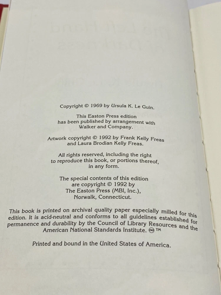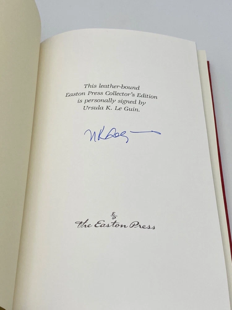 MAKES THE PERFECT GIFT FOR ANY FAN OF SCIENCE FICTION ** PLEASE READ : Mahalo for taking the time to look at our listing. We truly appreciate it. We always do our BEST to give you the most accurate description of these beautiful books. If, however, you have any SPECIFIC questions about the SIZE of the book, NUMBER of pages, TYPE of leather, SMELL or FEEL of the book, PLEASE email us through EBay’s mail system BEFORE you bid, and we will be HAPPY to give you more information. We want you to be completely happy with your purchase and keep you as our customers for years to come!** DESCRIPTION: Easton Press full-leather binding, part of the LONG OUT OF PRINT MASTERPIECES OF SCIENCE FICTION. THIS IS A VINTAGE HEIRLOOM EASTON SIGNED BY THE LATE URSULA K. LEGUIN AND IS ONE OF THE MOST SOUGHT AFTER SCIENCE FICTION EDITIONS DONE BY EASTON PRESS. 🍍 NOT INCLUDED... 😊 ABOUT THE BOOK: A groundbreaking work of science fiction, The Left Hand of Darkness tells the story of a lone human emissary to Winter, an alien world whose inhabitants can choose - and change - their gender. His goal is to facilitate Winter's inclusion in a growing intergalactic civilization. But to do so he must bridge the gulf between his own views and those of the completely dissimilar culture that he encounters. Embracing the aspects of psychology, society, and human emotion on an alien world, The Left Hand of Darkness stands as a landmark achievement in the annals of intellectual science fiction. CONDITION: Book is in LIKE NEW condition for its age with only a couple of minor rubs to the gilt page ends and the original blank bookplate attached, ready for your personalization (SEE PICS FOR FURTHER DETAILS). NO WRITING FROM PREVIOUS OWNER, ETC. It is a BEAUTIFUL EDITION. SHIPPING: FREE TO US ADDRESSES ONLY. INTERNATIONAL $ based on location. WE SHIP PRIORITY MAIL & PACK VERY WELL. Please check out our other listings of Easton Press, Franklin Library, Limited Editions Club, First Edition Library, Folio Society, International Collectors Library, and Heritage Press editions. WE DO COMBINE SHIPPING IF YOU PURCHASE MORE THAN ONE COPY. Mahalo for looking at our listings! By bidding/purchasing this item, you are helping a very grateful family who sends you our WARMEST ALOHA & MAHALO!