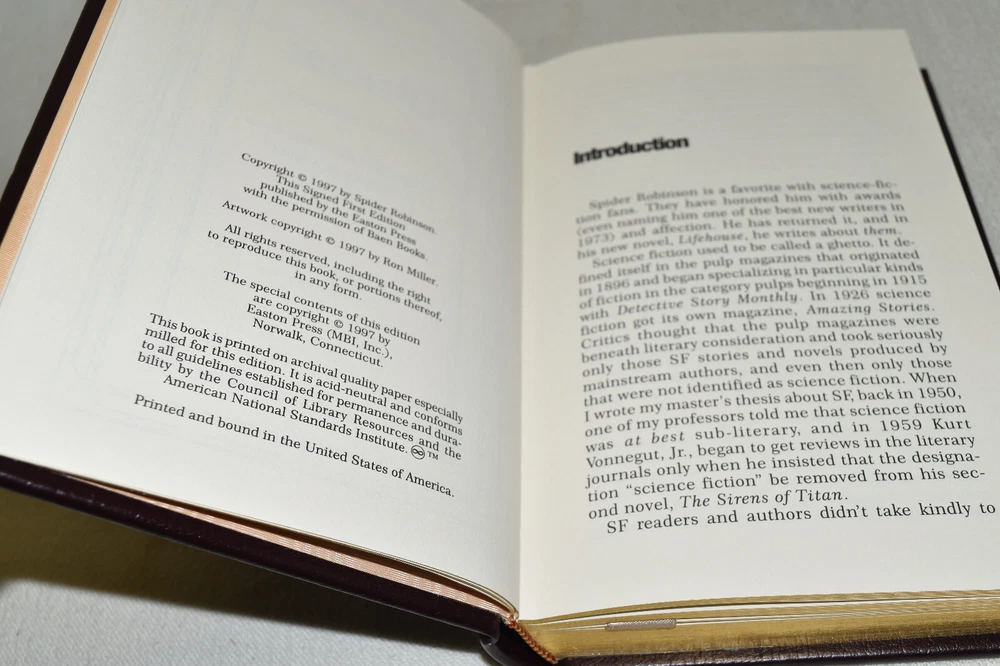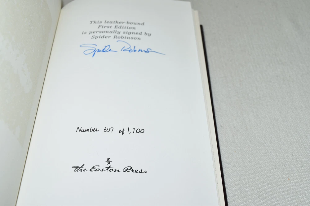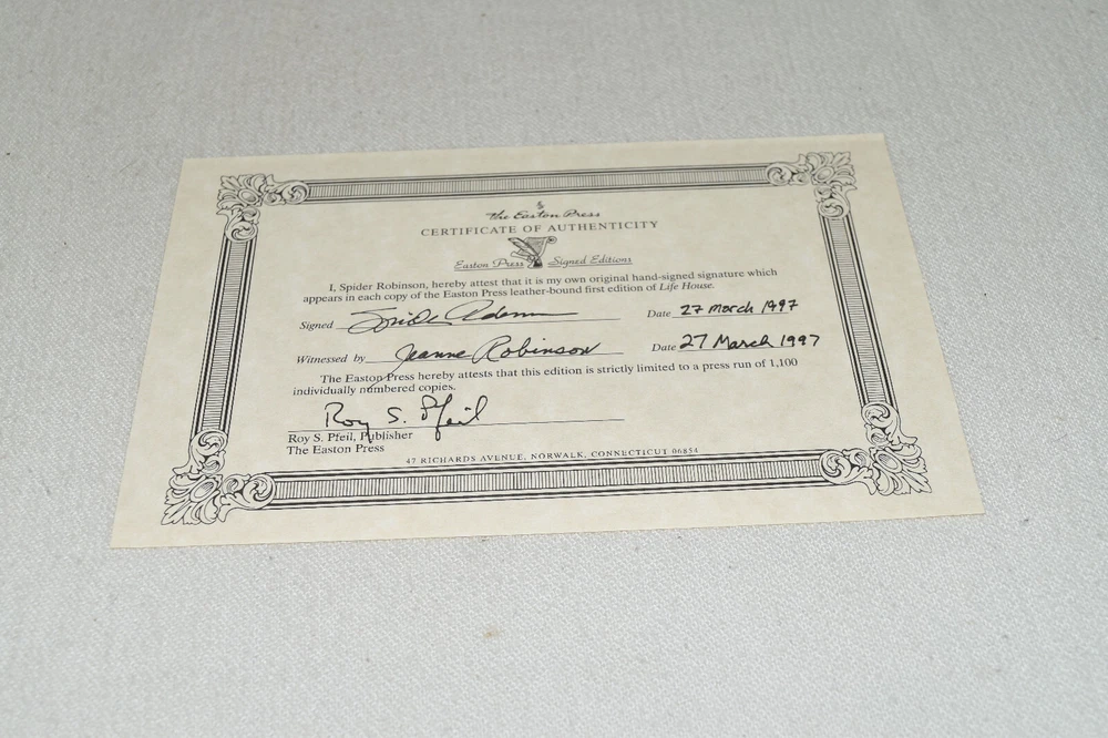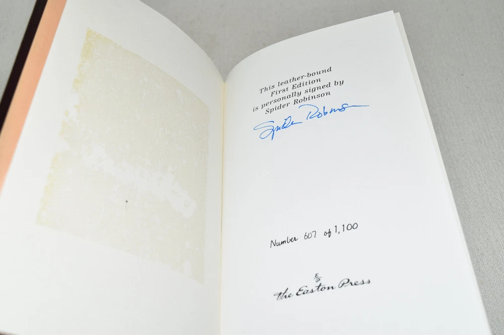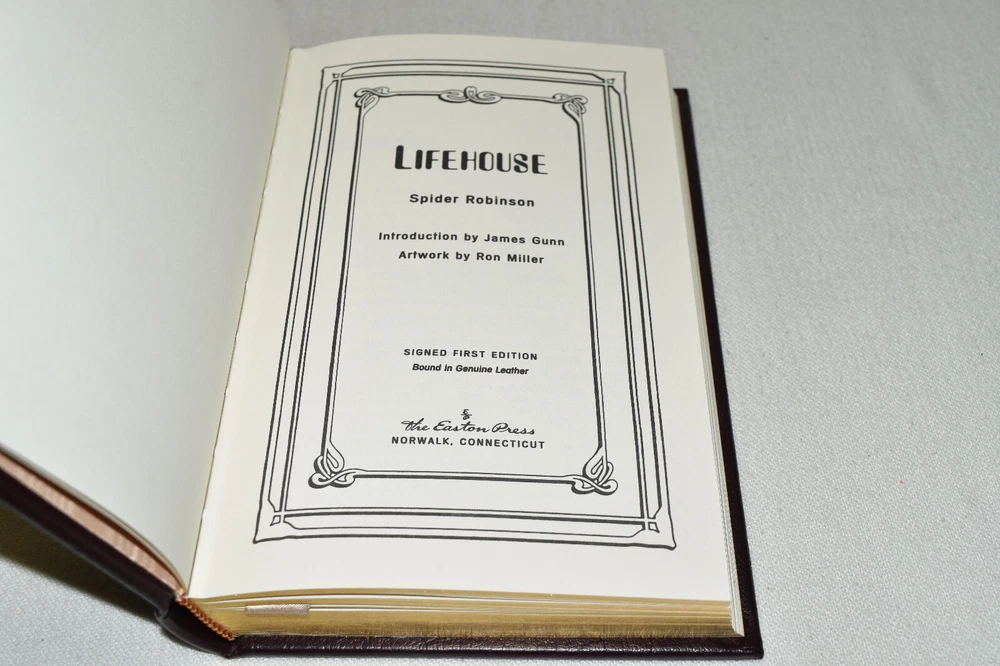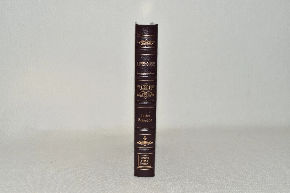 From the Easton Press Signed Collection... Lifehouse PERSONALLY SIGNED by Author Spider Robinson Frontispiece by Ron Miller Easton Press Signed Edition Copyright 1997 by The Easton Press Number 607 of 1,100 Signed Copies Bound in Premium Full Leather This Signed Edition contains all of the classic Easton Press trimmings: Premium Leather Silk Moire Endleaves Distinctive Cover Design Hubbed Spine, Accented in Real 22KT Gold Satin Ribbon Page Marker Gilded Page Edges Long-lasting, High Quality Acid-neutral Paper Smyth-sewn Pages for Strength and Durability A very scarce title in any condition, this copy is in Fine condition. The front and back covers are both in terrific condition and the gilded page edges show only faint wear (see pictures). There is minor residue inside the second page. This book is personally signed by the Author. It comes complete with Collector's Notes and a Certificate of Authenticity and would be a beautiful addition to your Easton Press collection. Overall, this copy is a grade collector's book. This book is very elusive in this superior condition, as only a limited number of them were ever published, so now is the time to act. Hopefully you can add this book to your collection and enjoy it in the years to come... Please Email Me With Any Questions You Might Have! Shipping Info: Buyer to Pay Shipping and Handling International Bidders Pay Extra Shipping Seller Not Responsible For Uninsured Items Lost or Damaged in Mail Forms of Payment Accepted: Paypal Good luck and happy bidding! Powered by eBay Turbo Lister The free listing tool. List your items fast and easy and manage your active items.