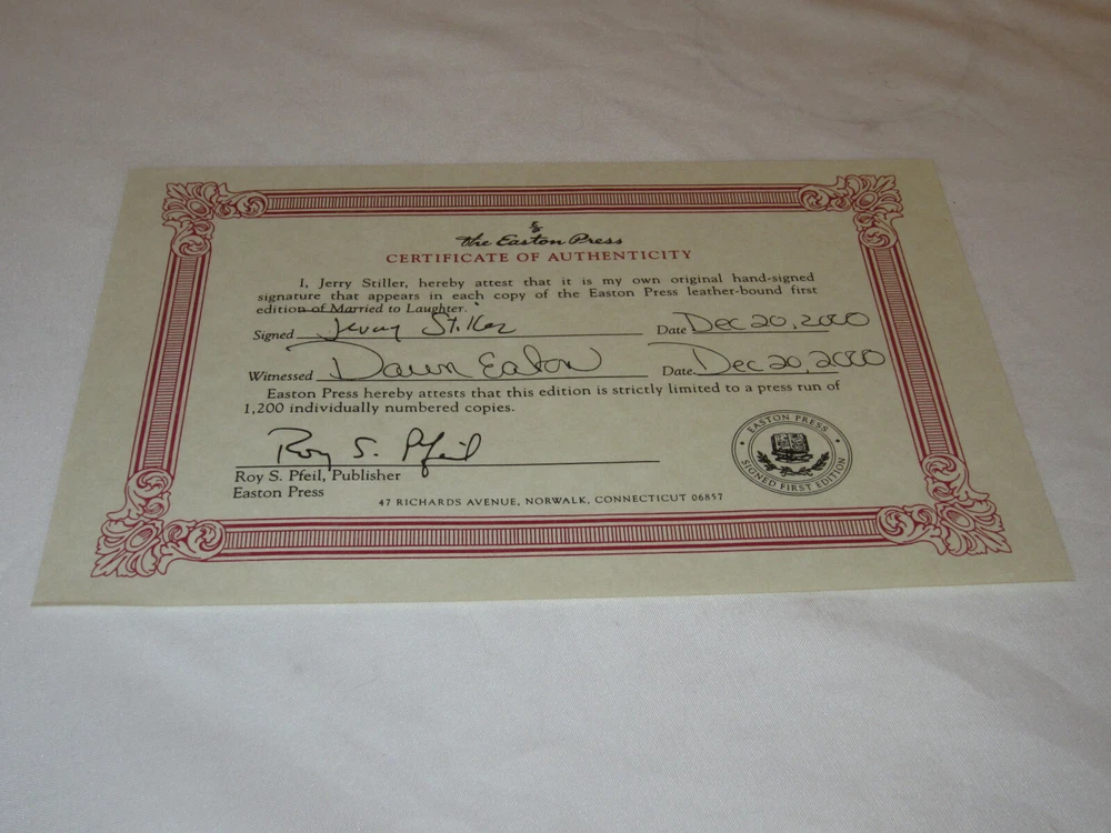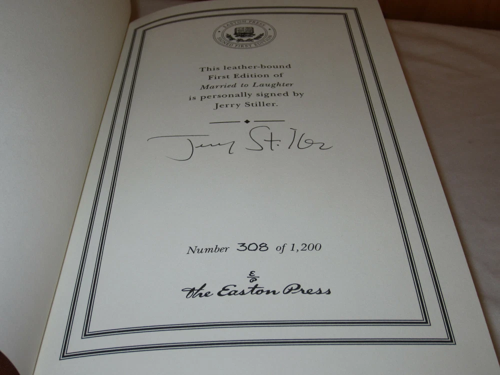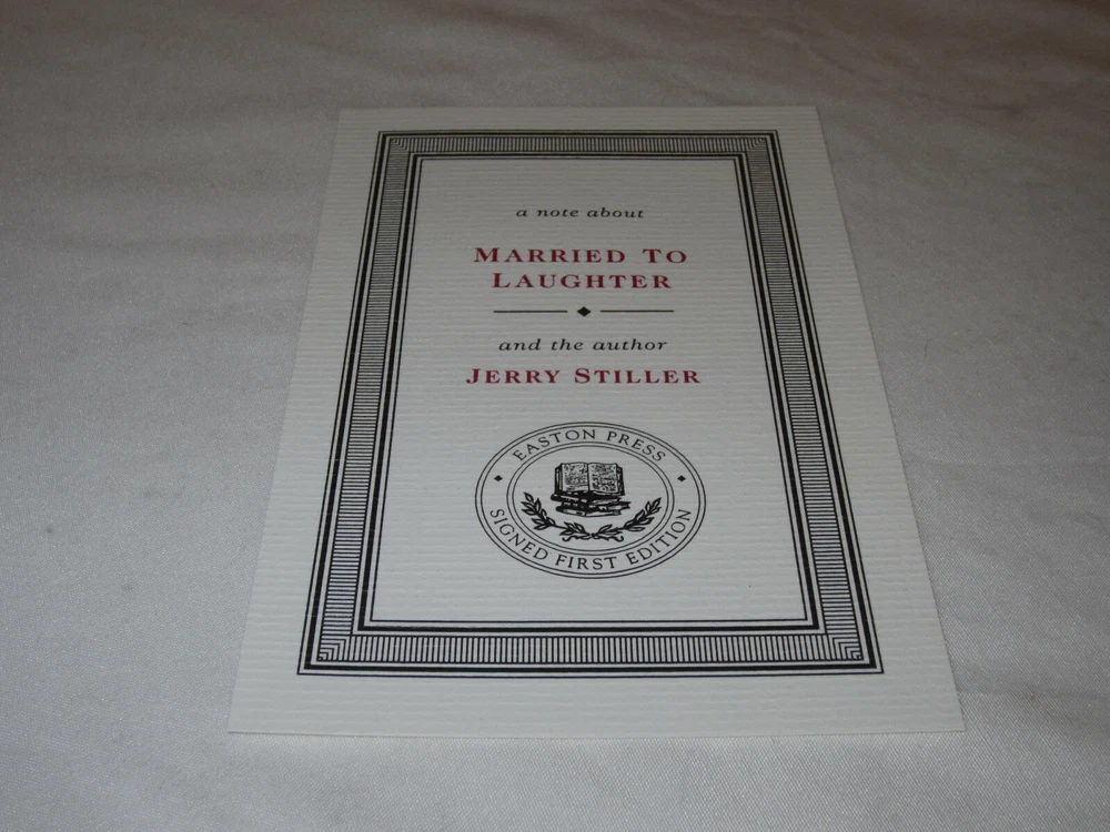 From the Easton Press Signed First Editions Collection... Married to Laughter A Love Story Featuring Anne Meara PERSONALLY SIGNED by Authors Jerry Stiller Easton Press Signed First Edition Copyright 2000 by The Easton Press Number 308 of 1,200 Signed Copies Bound in Premium Full Leather This Signed First Edition contains all of the classic Easton Press trimmings: Premium Leather Silk Moire Endleaves Distinctive Cover Design Hubbed Spine, Accented in Real 22KT Gold Satin Ribbon Page Marker Gilded Page Edges Long-lasting, High Quality Acid-neutral Paper Smyth-sewn Pages for Strength and Durability A very scarce title in any condition, this copy is in Fine condition. The front and back covers are both in near perfect condition and the gilded page edges show hardly any wear! There is NO attached bookplate nor any other signs of previous ownership. This edition is limited to only 1,200 signed copies; this being number 308. This book is personally signed by Jerry Stiller. It comes complete with a Certificate of Authenticity and Collector's Notes and would be a beautiful addition to your Easton Press collection. Overall, this copy is a grade collector's book. This book is very elusive in this superior condition, as only a limited number of them were ever published, so now is the time to act. Hopefully you can add this book to your collection and enjoy it in the years to come... Please Email Me With Any Questions You Might Have! Shipping Info: Buyer to Pay Shipping and Handling International Bidders Pay Extra Shipping Seller Not Responsible For Uninsured Items Lost or Damaged in Mail Forms of Payment Accepted: Paypal Good luck and happy bidding! Powered by eBay Turbo Lister The free listing tool. List your items fast and easy and manage your active items.