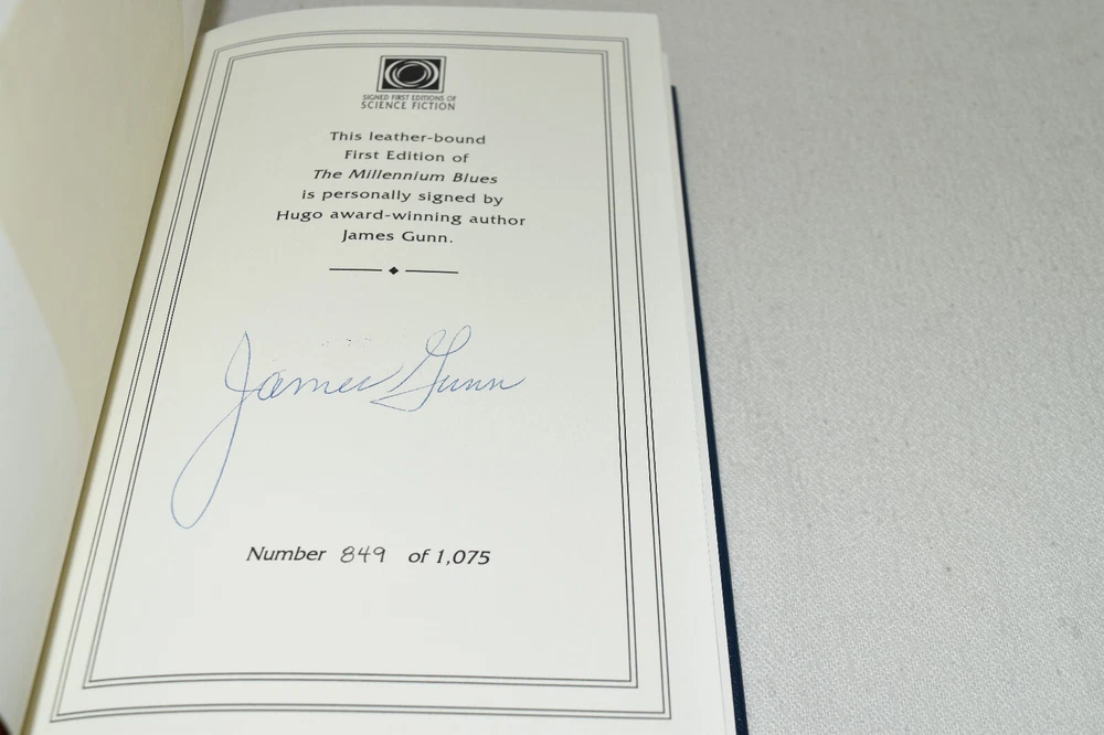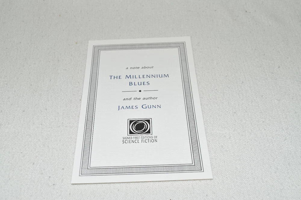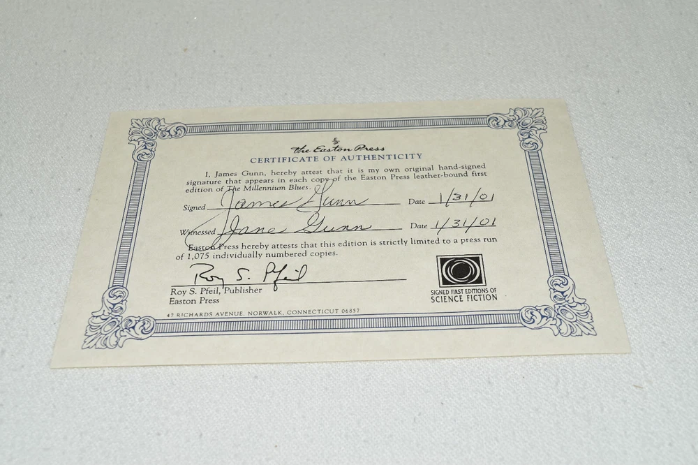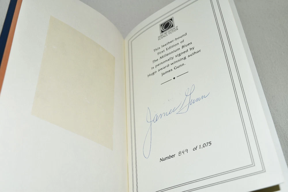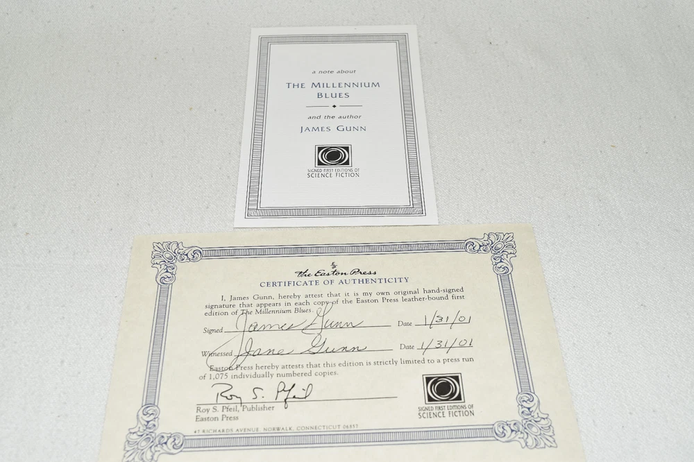 From the Easton Press Signed Collection... The Millennium Blues PERSONALLY SIGNED by James Gunn Illustrated by Vincent DiFate Limited to 1,075 Copies, this is Number 849 Easton Press Signed Edition Copyright 2001 by The Easton Press Bound in Premium Full Leather This Signed Edition contains all of the classic Easton Press trimmings: Premium Leather Silk Moire Endleaves Distinctive Cover Design Hubbed Spine, Accented in Real 22KT Gold Satin Ribbon Page Marker Gilded Page Edges Long-lasting, High Quality Acid-neutral Paper Smyth-sewn Pages for Strength and Durability A very scarce title in any condition, this copy is in Fine condition. The front and back covers are both in near perfect condition and the gilded page edges show hardly any wear (see pictures of all sides). There is light residue on the second page. This book is personally signed by the Author and comes with a Certificate of Authenticity and Collector's Notes. It would be a beautiful addition to your Easton Press collection. Hopefully you can add this book to your collection and enjoy it in the years to come... Please Email Me With Any Questions You Might Have! Shipping Info: Buyer to Pay Shipping and Handling International Bidders Pay Extra Shipping Seller Not Responsible For Uninsured Items Lost or Damaged in Mail Forms of Payment Accepted: Paypal Good luck and happy bidding! Powered by eBay Turbo Lister The free listing tool. List your items fast and easy and manage your active items.