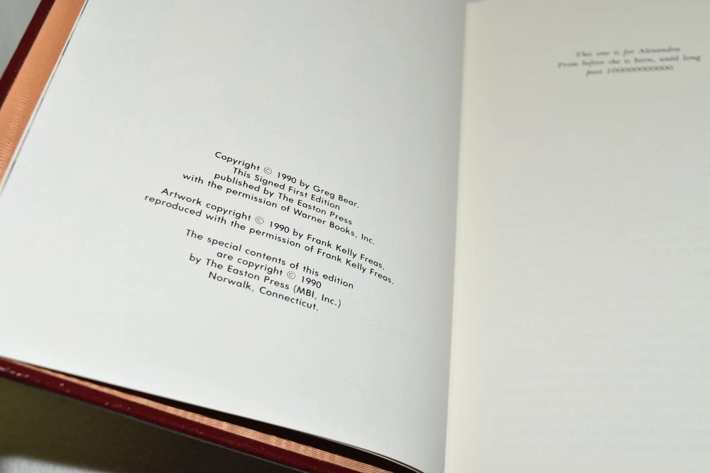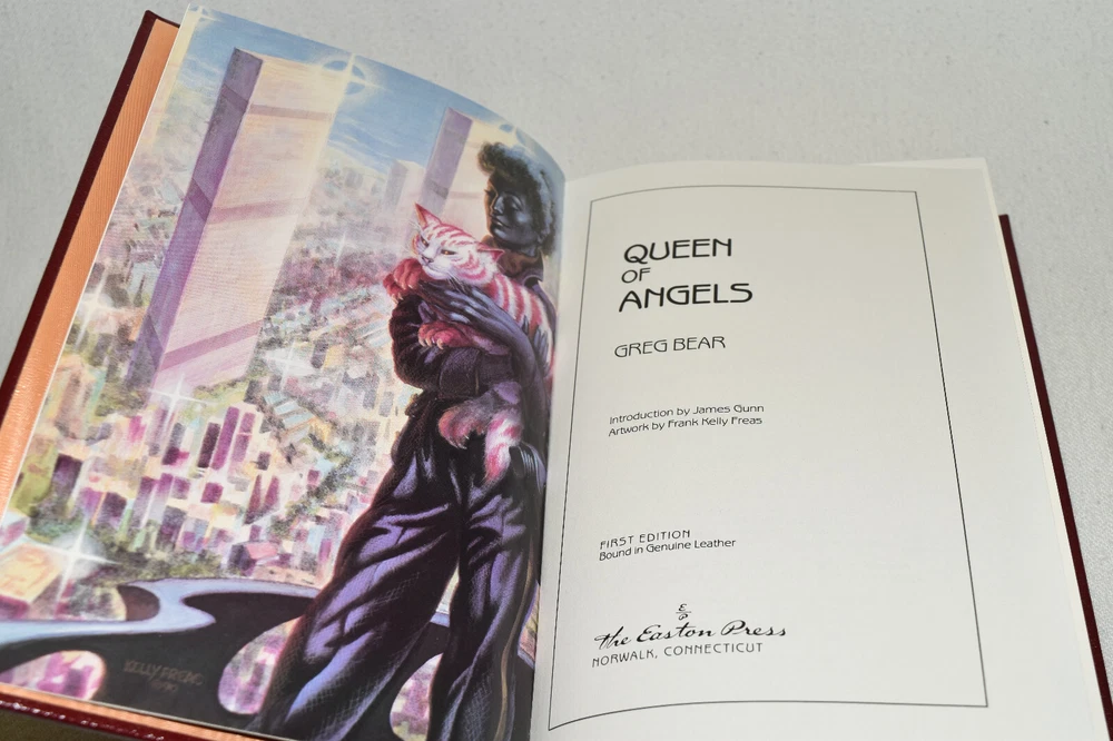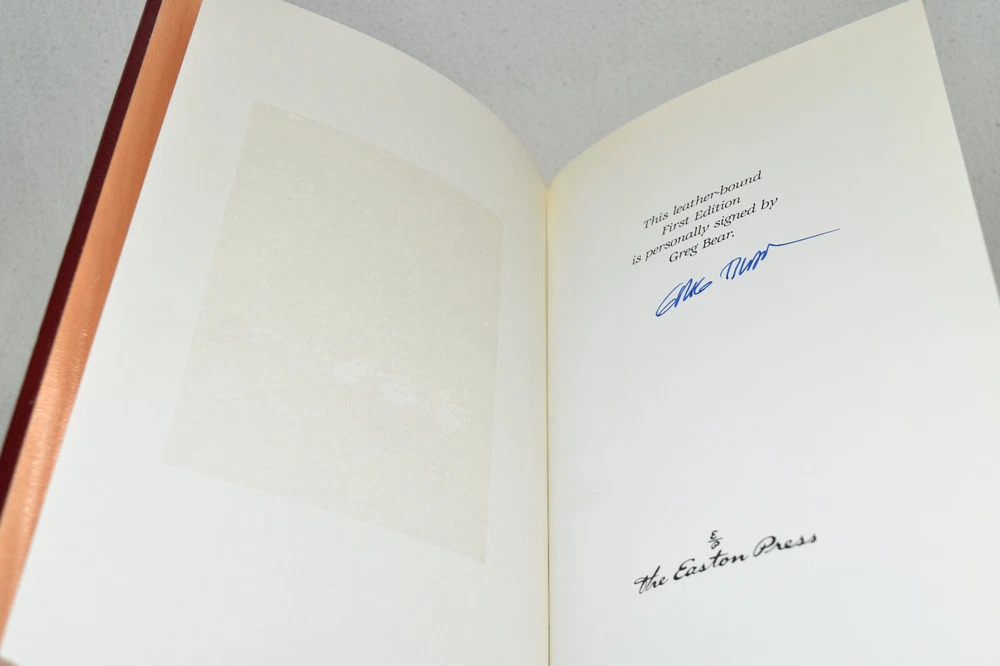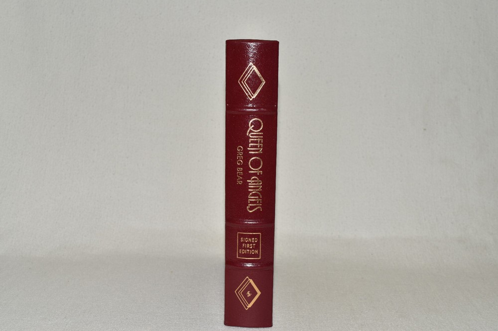 From the Easton Press Signed Collection... Queen of Angels PERSONALLY SIGNED by Greg Bear Introduction by James Gunn Illustrated by Frank Kelly Freas Easton Press Signed Edition Copyright 1990 by The Easton Press Bound in Premium Full Leather This Signed Edition contains all of the classic Easton Press trimmings: Premium Leather Silk Moire Endleaves Distinctive Cover Design Hubbed Spine, Accented in Real 22KT Gold Satin Ribbon Page Marker Gilded Page Edges Long-lasting, High Quality Acid-neutral Paper Smyth-sewn Pages for Strength and Durability A very scarce title in any condition, this copy is in Fine condition. The front and back covers are both in near perfect condition and the gilded page edges show minor wear (see pictures of all sides). There is light residue on the second page. This book is personally signed by the Author and would be a beautiful addition to your Easton Press collection. Hopefully you can add this book to your collection and enjoy it in the years to come... Please Email Me With Any Questions You Might Have! Shipping Info: Buyer to Pay Shipping and Handling International Bidders Pay Extra Shipping Seller Not Responsible For Uninsured Items Lost or Damaged in Mail Forms of Payment Accepted: Paypal Good luck and happy bidding! Powered by eBay Turbo Lister The free listing tool. List your items fast and easy and manage your active items.