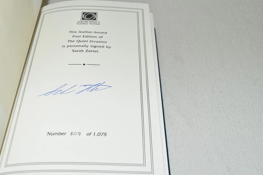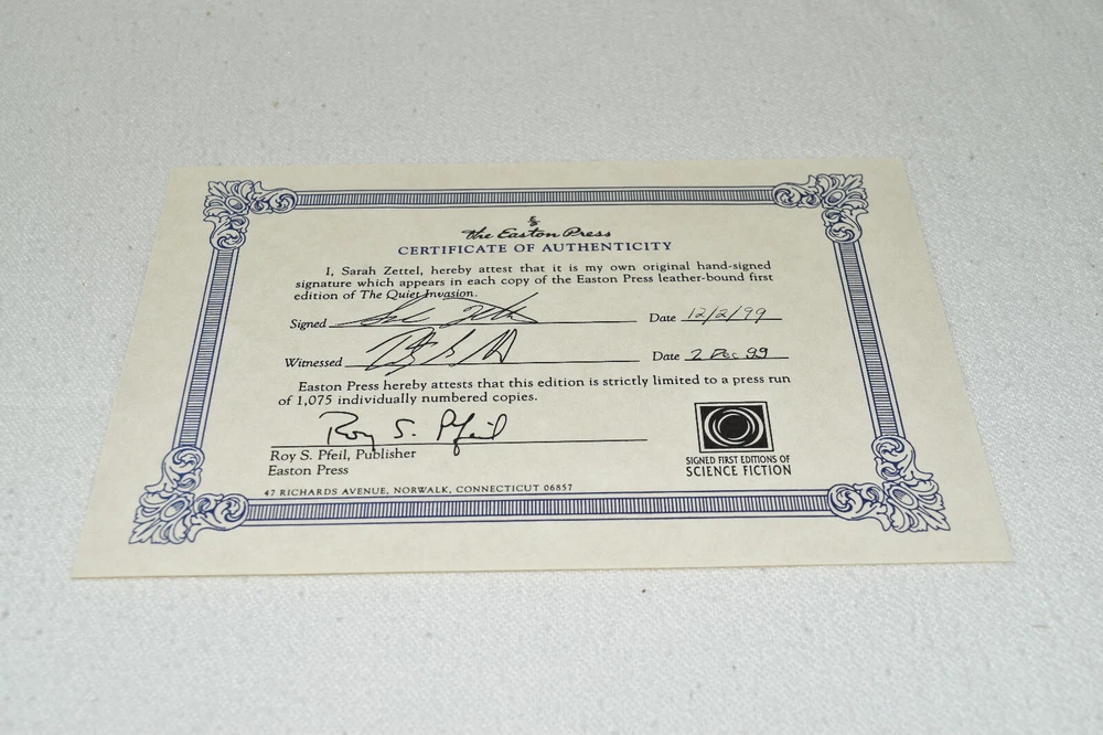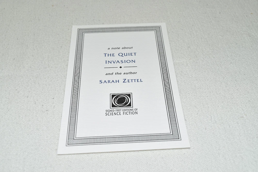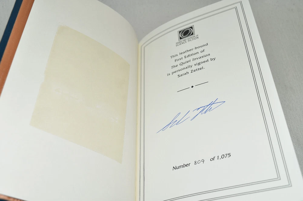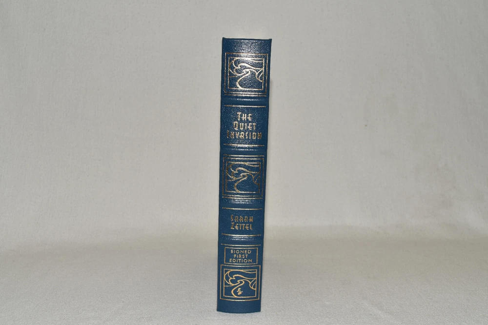 From the Easton Press Signed Collection... The Quiet Invasion PERSONALLY SIGNED by Sarah Zettel Illustrated by Frank Mayo Limited to 1,075 Copies, this is Number 809 Easton Press Signed Edition Copyright 2000 by The Easton Press Bound in Premium Full Leather This Signed Edition contains all of the classic Easton Press trimmings: Premium Leather Silk Moire Endleaves Distinctive Cover Design Hubbed Spine, Accented in Real 22KT Gold Satin Ribbon Page Marker Gilded Page Edges Long-lasting, High Quality Acid-neutral Paper Smyth-sewn Pages for Strength and Durability A very scarce title in any condition, this copy is in Fine condition. The front and back covers are both in near perfect condition and the gilded page edges show only minor wear (see pictures of all sides). There is light residue on the second page. This book is personally signed by the Author and comes with a Certificate of Authenticity and Collector's Notes. It would be a beautiful addition to your Easton Press collection. Hopefully you can add this book to your collection and enjoy it in the years to come... Please Email Me With Any Questions You Might Have! Shipping Info: Buyer to Pay Shipping and Handling International Bidders Pay Extra Shipping Seller Not Responsible For Uninsured Items Lost or Damaged in Mail Forms of Payment Accepted: Paypal Good luck and happy bidding! Powered by eBay Turbo Lister The free listing tool. List your items fast and easy and manage your active items.
