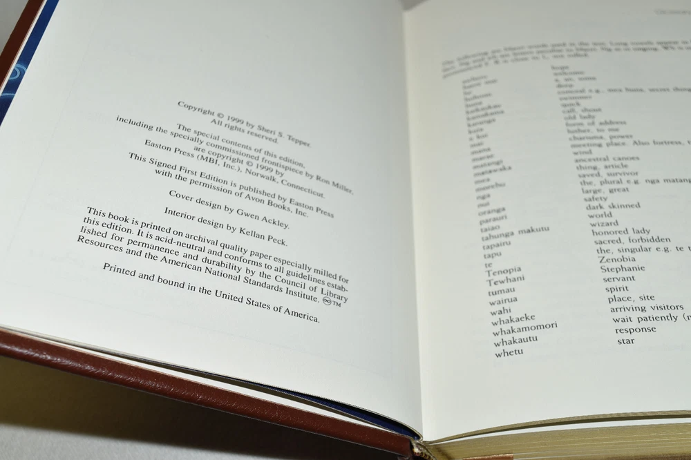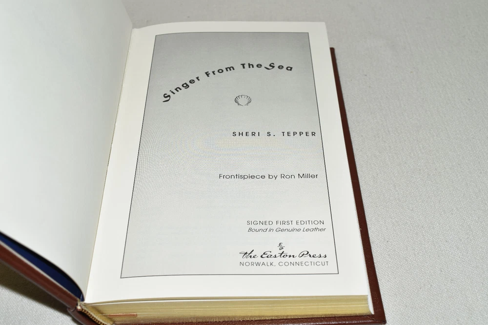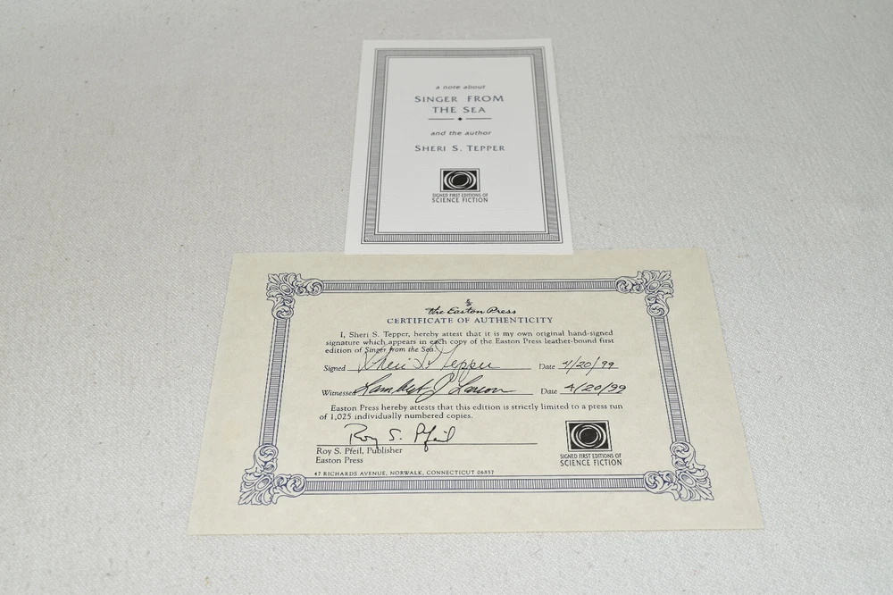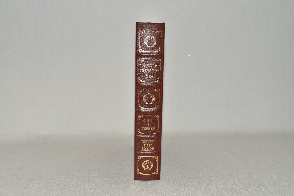 From the Easton Press Signed Collection... Singer From The Sea PERSONALLY SIGNED by Author Sheri S. Tepper Frontispiece by Ron Miller Easton Press Signed Edition Copyright 1999 by The Easton Press Number 181 of 1,025 Signed Copies Bound in Premium Full Leather This Signed Edition contains all of the classic Easton Press trimmings: Premium Leather Silk Moire Endleaves Distinctive Cover Design Hubbed Spine, Accented in Real 22KT Gold Satin Ribbon Page Marker Gilded Page Edges Long-lasting, High Quality Acid-neutral Paper Smyth-sewn Pages for Strength and Durability A very scarce title in any condition, this copy is in Fine condition. The front and back covers are both in terrific condition and the gilded page edges show only minor wear (see pictures). There are no markings, bookplates, or other signs of prior ownership in this book. This book is personally signed by the Author. It comes complete with Collector's Notes and a Certificate of Authenticity and would be a beautiful addition to your Easton Press collection. Overall, this copy is a grade collector's book. This book is very elusive in this superior condition, as only a limited number of them were ever published, so now is the time to act. Hopefully you can add this book to your collection and enjoy it in the years to come... Please Email Me With Any Questions You Might Have! Shipping Info: Buyer to Pay Shipping and Handling International Bidders Pay Extra Shipping Seller Not Responsible For Uninsured Items Lost or Damaged in Mail Forms of Payment Accepted: Paypal Good luck and happy bidding! Powered by eBay Turbo Lister The free listing tool. List your items fast and easy and manage your active items.